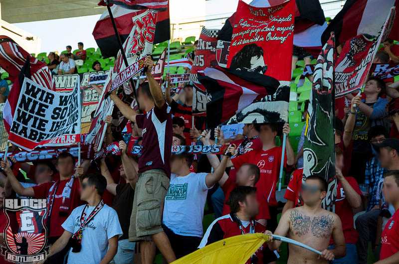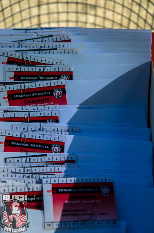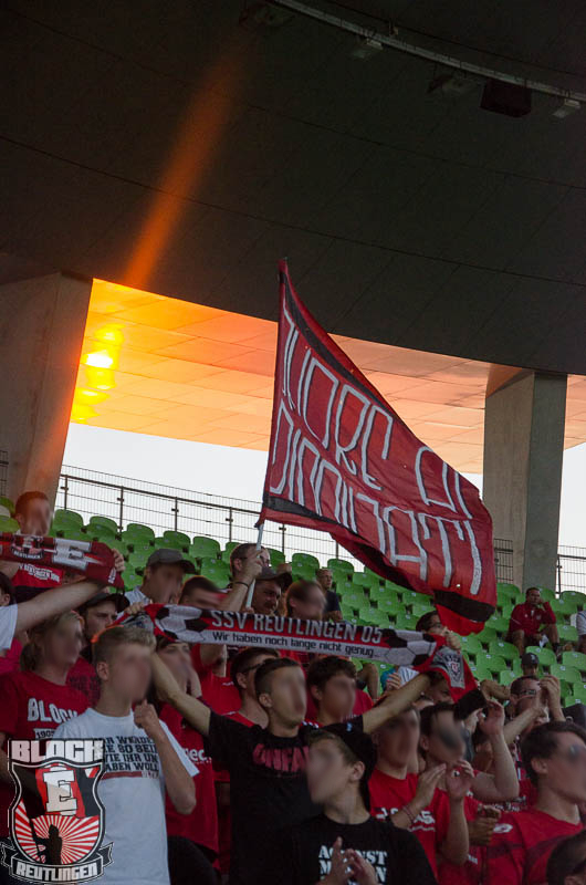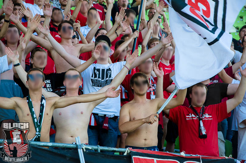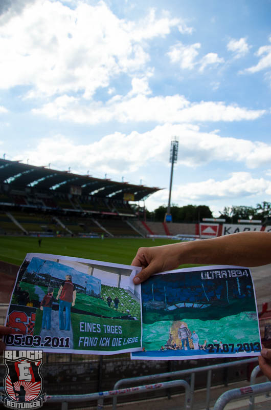 Zu Spielbeginn zeigte Block E eine schöne Choreo, bestehend aus zwei Spruchbändern, einem SSV Trikot mit der Nummer 13 und einer Jubelszene von Andy Rill. Untermalt wurde das Szenario von schwarzen, roten und weißem Rauch.