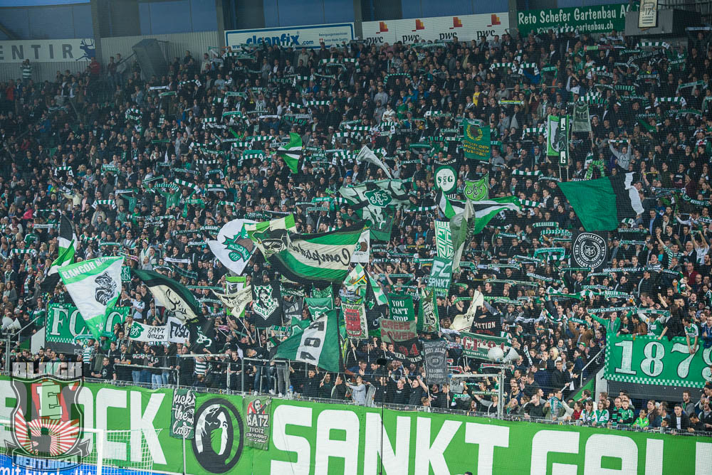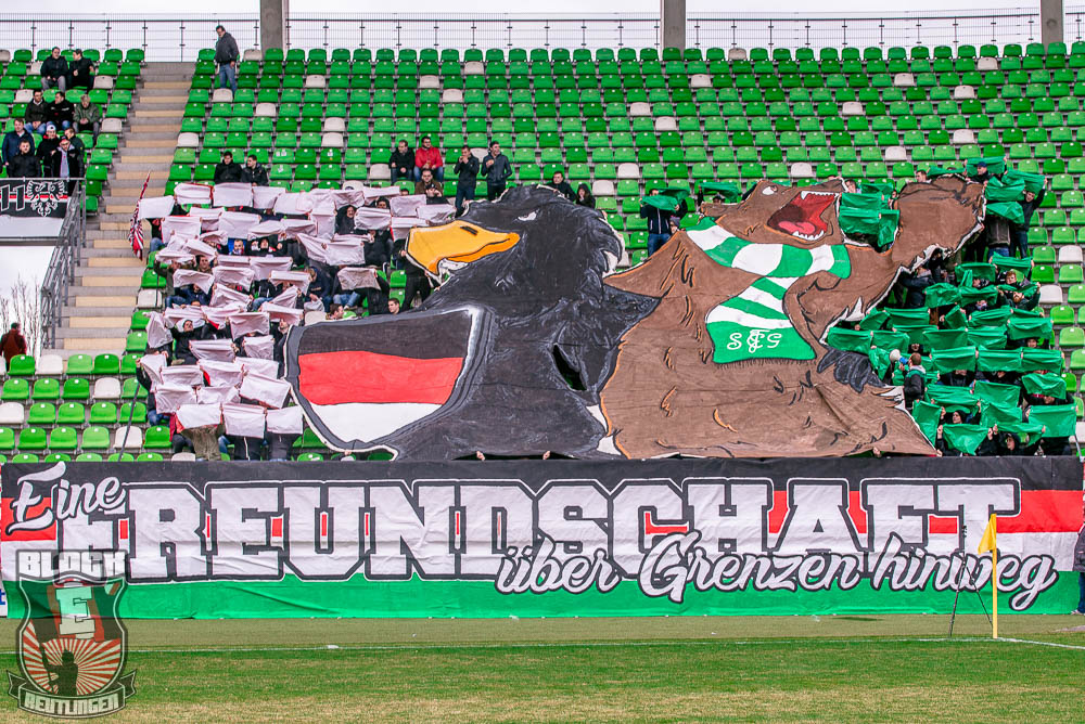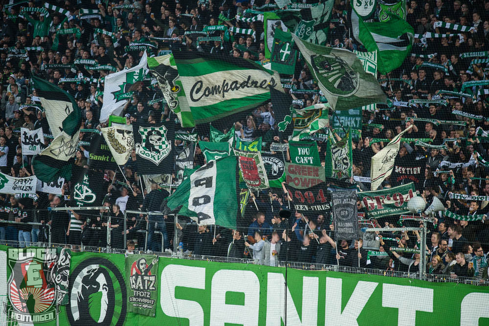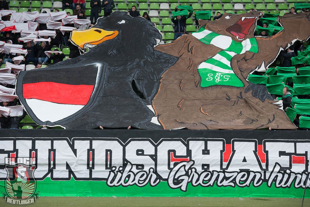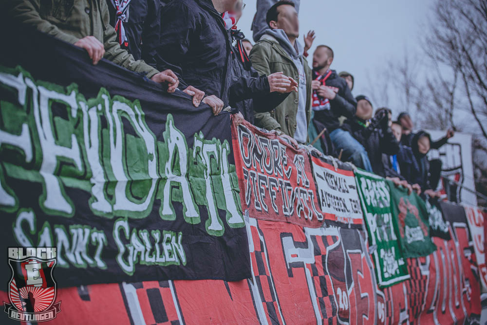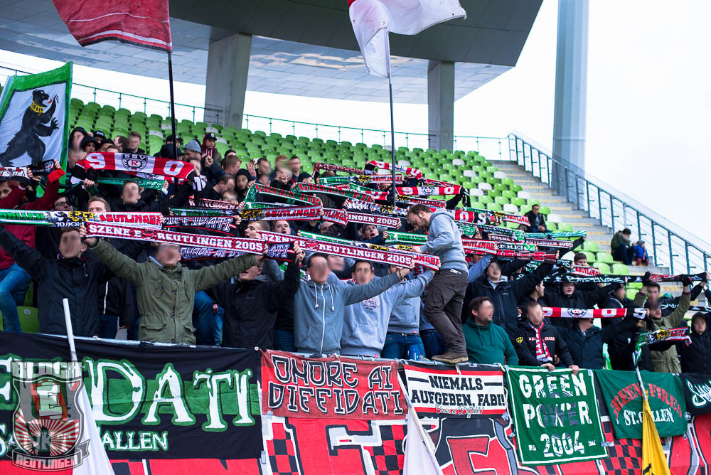 Der hohe Heimsieg geriet am vergangenen Samstag jedoch etwas in den Hintergrund. Schon seit einiger Zeit stand fest, dass uns bei diesem Spiel zahlreiche Freunde aus St. Gallen unterstützen werden. So stand dieser Tag ganz im Zeichen unserer Freundschaft zur Fanszene des FC St. Gallen. Passend dazu fertigten wir im Vorfeld eine Choreographie an und organisierten ein kleines Programm. Letztlich unterstützten uns rund 80 Ultras von allen relevanten Grupppen des Espenblocks und hatten somit ihren Anteil an der wohl lautesten ersten Halbzeit der jüngeren Vergangenheit. In der zweiten Halbzeit wurde unser Support zwar etwas schwächer, hielt sich allerdings immer noch in einem akzeptablen Bereich. Außerdem gab es in der zweiten Halbzeit noch ein Spruchband für unsere Stuttgarter Freunde zu sehen, die in der vergangenen Woche ihr zwanzigjähriges Bestehen feiern durften.