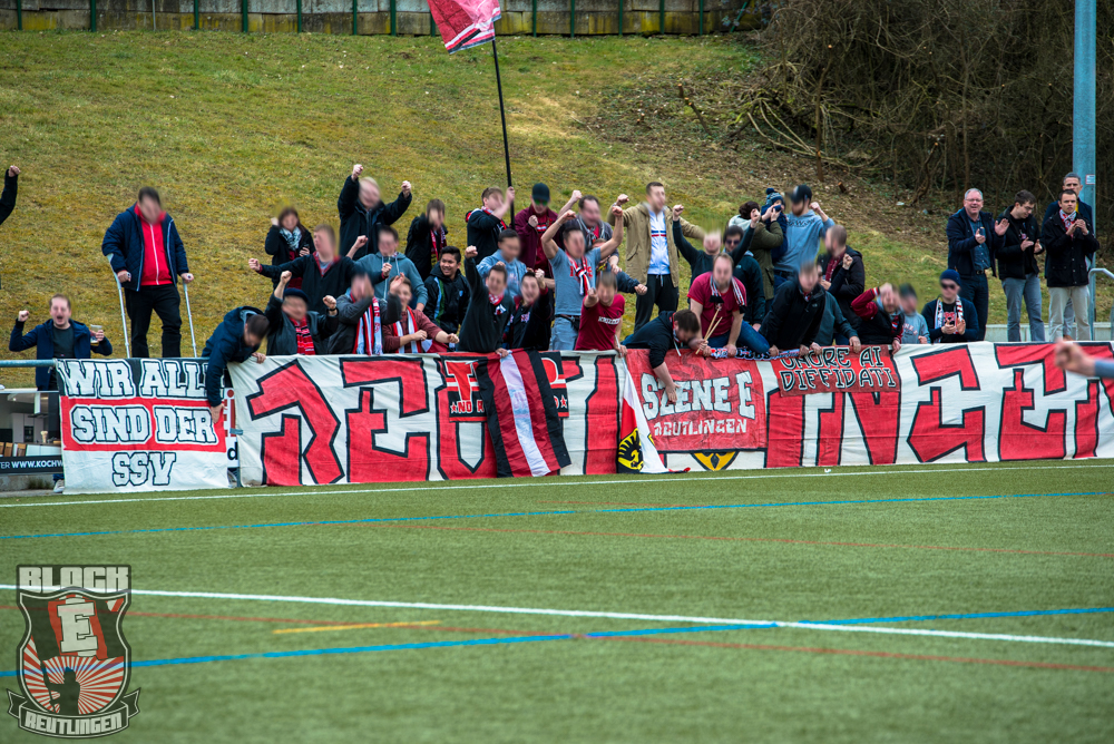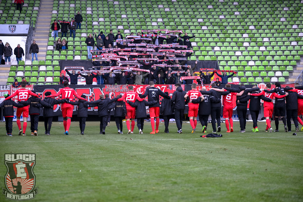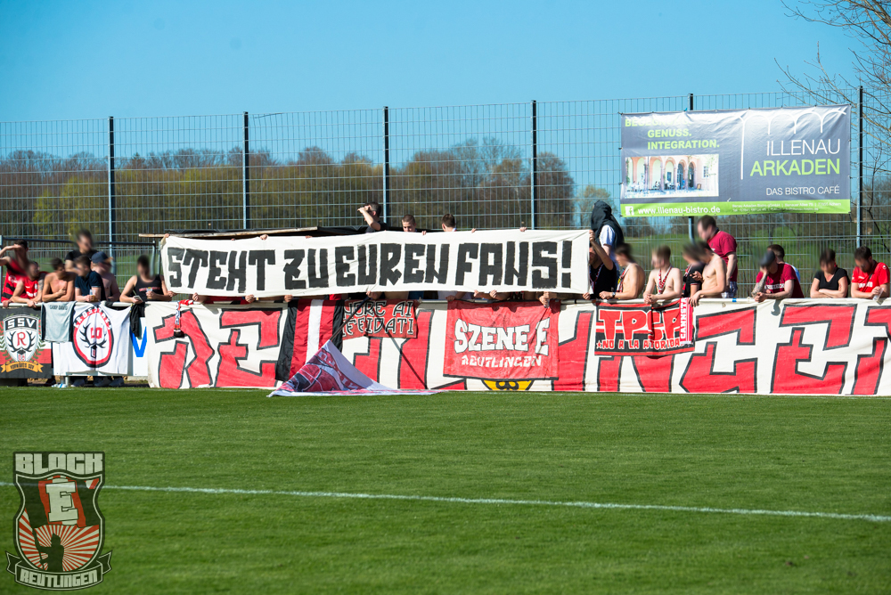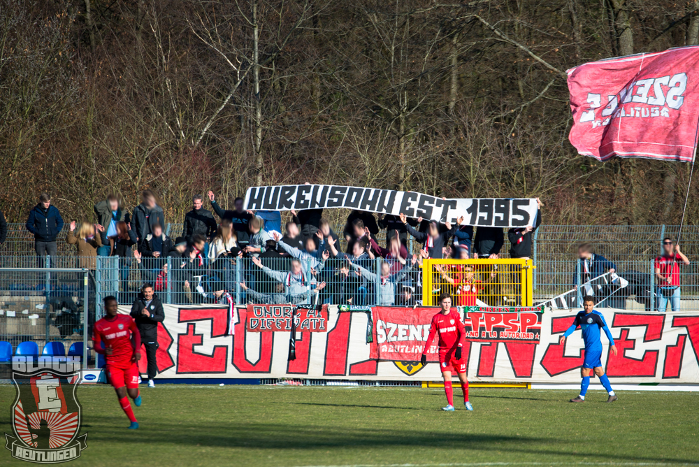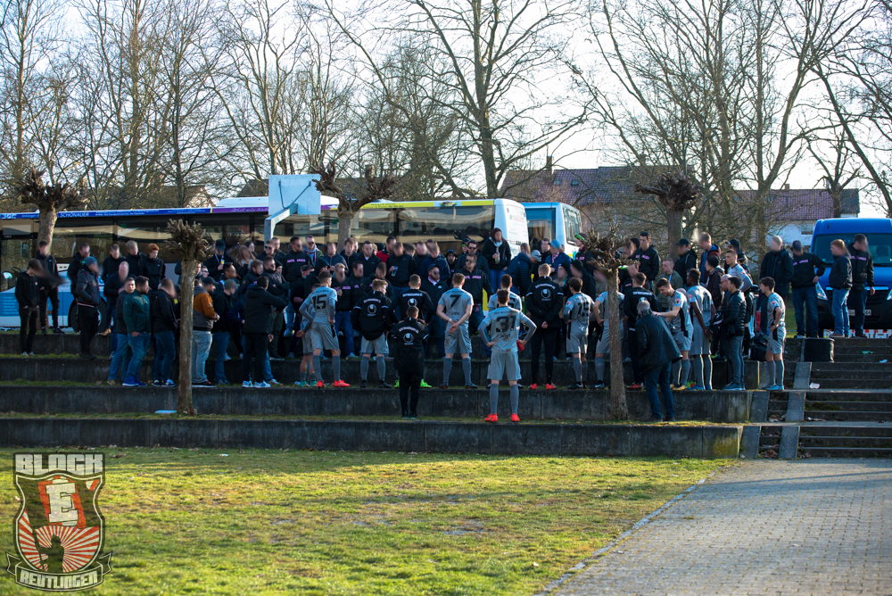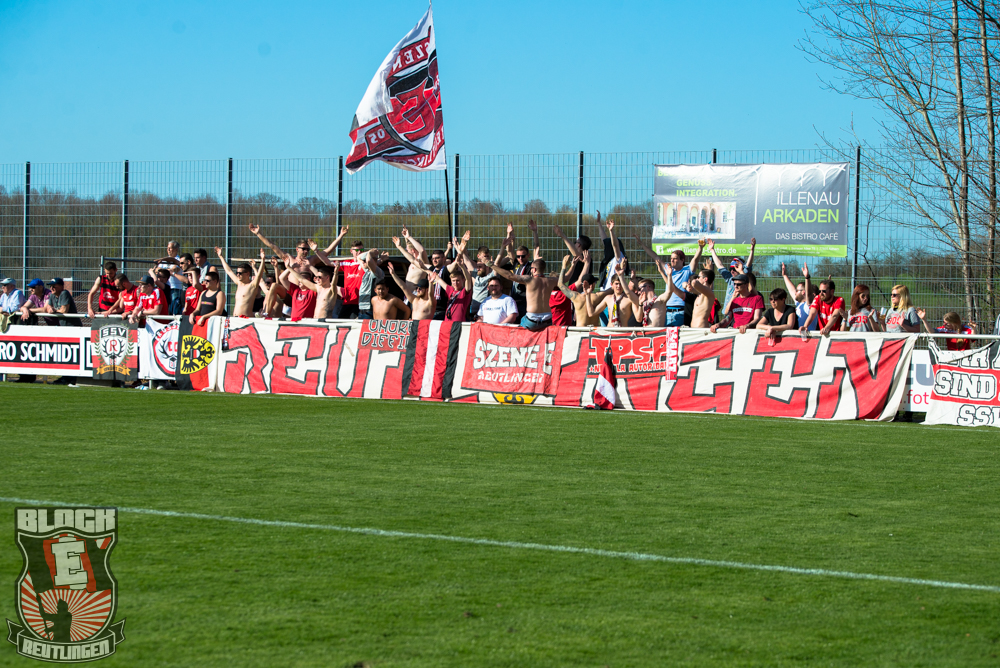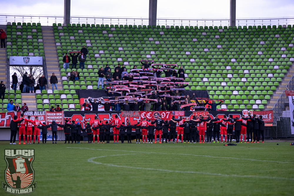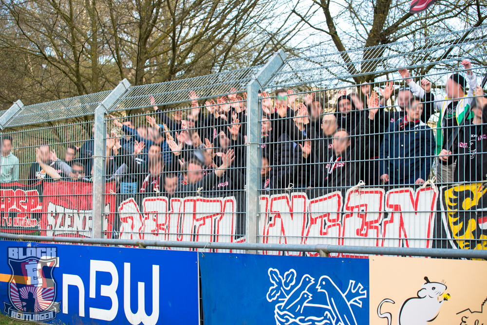 Auch Block E wusste an diesem Tage erneut zu gefallen. Nachdem wir am vergangenen Samstag in Oberachern den derzeit größten Bummsground unserer Liga ordentlich gerockt haben, konnten wir an diesem Tage mit passenden Gesängen und einem kleinen, aber feinen Tifo auch diesem Auswärtssieg einen schönen Rahmen verleihen.