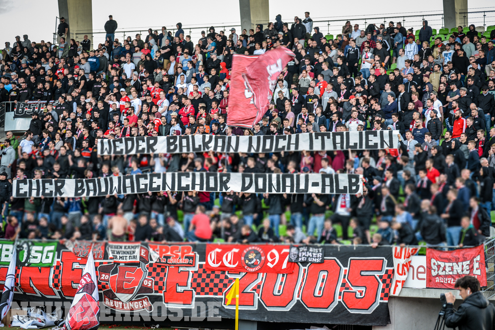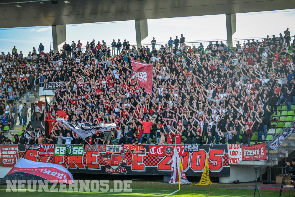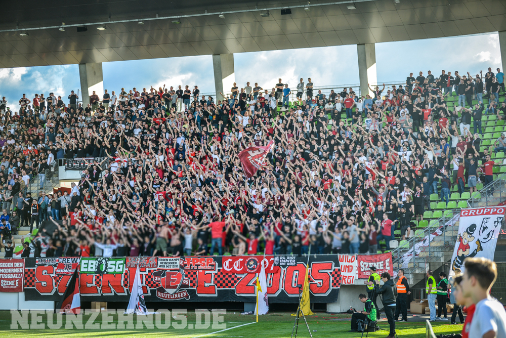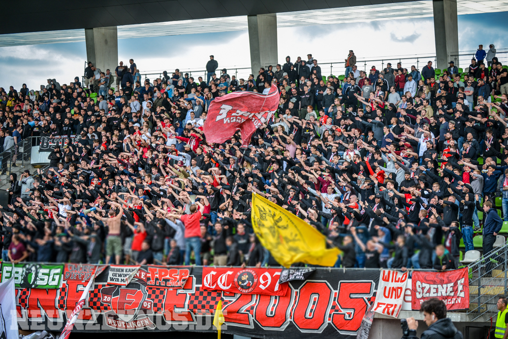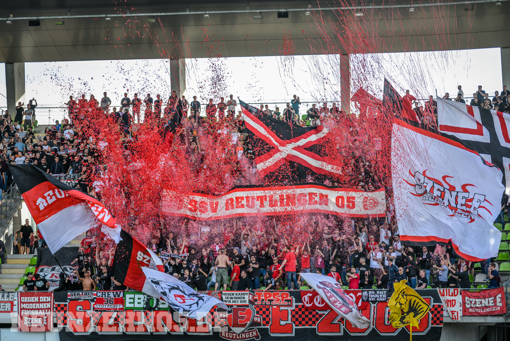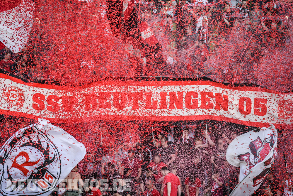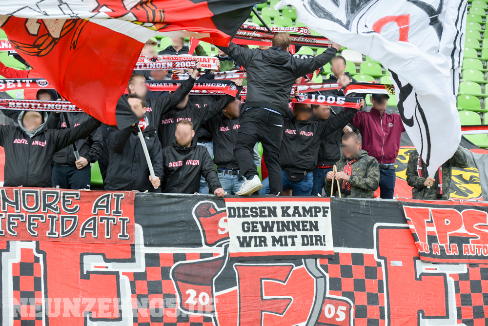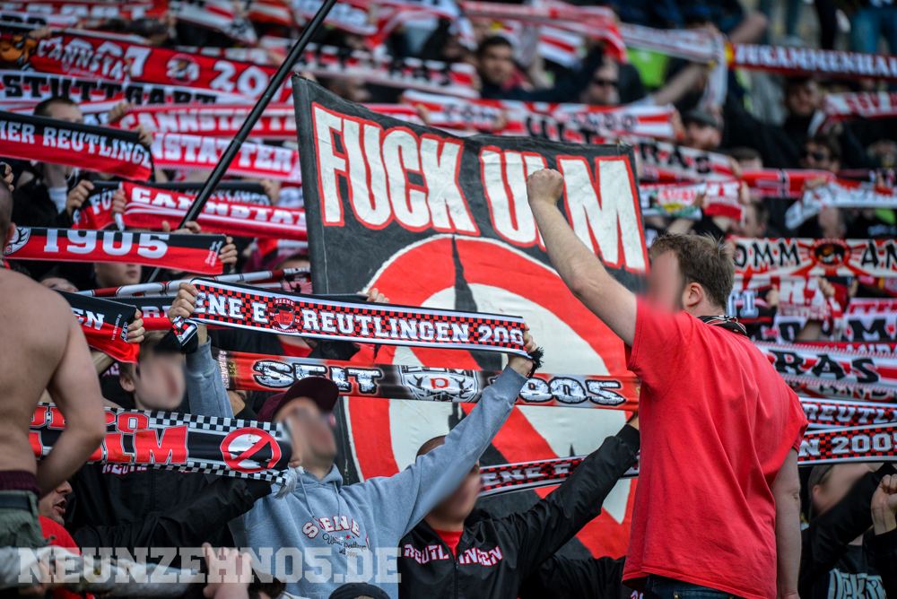 Was kann man sich Schöneres vorstellen als ein Derby unter der Woche. Pünktlich zweieinhalb Stunden vor Spielbeginn machten wir uns mit einem knapp vier Dutzend Mann starken Mob auf in Richtung Stadion. Zu unserer Überraschung konnten wir bis eine Straße vor dem Stadion unentdeckt vor den Bullen bleiben, die letzten paar Meter, vorbei am Gästeparkplatz, konnten auch ohne weitere Berührpunkte erfolgen, da das Pack aus Ulm noch in den Shuttlebussen unterwegs war. Die Bullen hingegen hatten schon mächtig aufgefahren, sodass ein Spalier aus Kastenwägen vom Parkplatz bis zum Gästeblockeingang reichte. Auf 16 Uhr wurde unsere Mannschaft vor der Kabine in Empfang genommen und mit einigen Schlachtrufen in Form von „Auf geht’s Reutlingen, kämpfen und siegen“ motiviert. Unser Block E war schon 15 Minuten vor Spielbeginn fast komplett gefüllt und auch der darüber liegende Block EE wies nur wenig leere Plätze auf. Zum Intro wurde im unteren Drittel des Blocks ein Spruchband im Stil des „SSV Reutlingen 05“ Schals hochgezogen. Um das Spruchband herum wurde eine Menge rotes Konfetti in die Luft geschossen. Unterstrichen wurde die optische Aktion mit sechs großen Schwenkfahnen, die sich im Block verteilten. Der Gästeblock hingegen entschied sich für ein Pyro-Intro. Weg von den Rängen hin zum Platz. Unsere Mannschaft konnte offensichtlich gut mithalten mit dem Regionalligisten, ein eklatanter Klassenunterschied war im ersten Moment nicht erkennbar. Umso bitterer, dass in der 20 Minute ein Sonntagsschuss aus knapp 25 Metern den Weg ins Tor findet. Der 0:1 Rückstand zur Hälfte also eher unverdient. Über ein Unentschieden hätte sich keine Seite beschweren können. Unsere Mannschaft noch im Halbzeitschlaf und innerhalb von zwei Minuten nach Wiederanpfiff steht es 0:3. Damit war den meisten klar, dass da nicht mehr viel gehen wird. Auf dem Feld lief von unserer Seite nun auch fast nichts mehr. Die Spatzen machten noch das aus ihrer Sicht, 4:0. Am Spielausgang konnte auch der von Elfadli erzielte Anschlusstreffer nichts mehr ändern. Nach dem Spiel machten wir uns mit dem gleichen Mob, auf den Rückweg, dieses Mal allerdings nicht ohne Begleitung. Zwischen sechs und acht Kastenwägen hinter uns und knapp 40 behelmte Cops. Zusammenfassend lässt sich sagen, dass wir im Block einen guten Auftritt abgeliefert haben und trotz der Niederlage und dem hohen Rückstand, in der zweiten Hälfte, den Affen im Gästeblock zeigen konnten, was Reutlinger sein bedeutet. An dieser Stelle noch ein herzlicher Dank an unsere Brüder aus Sankt Gallen und Stuttgart! Freiheit für Ultras!