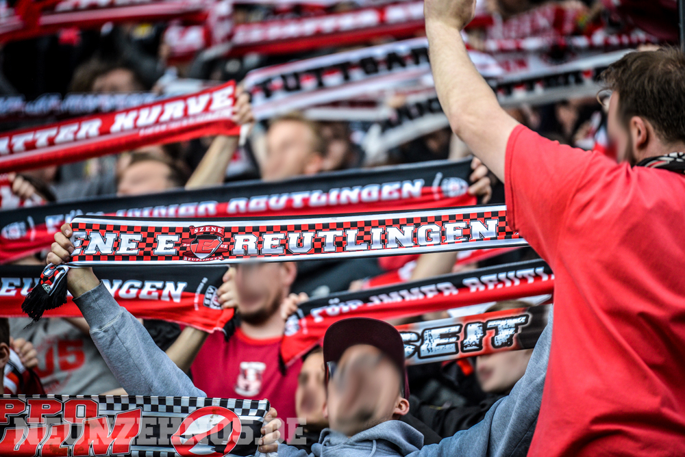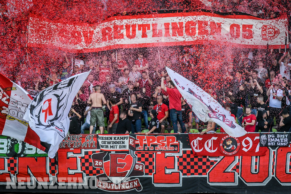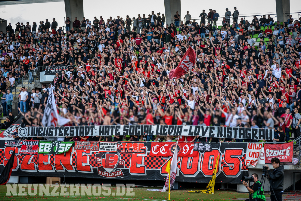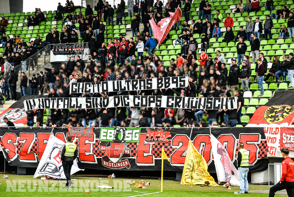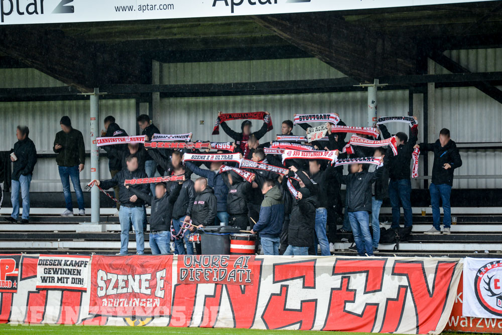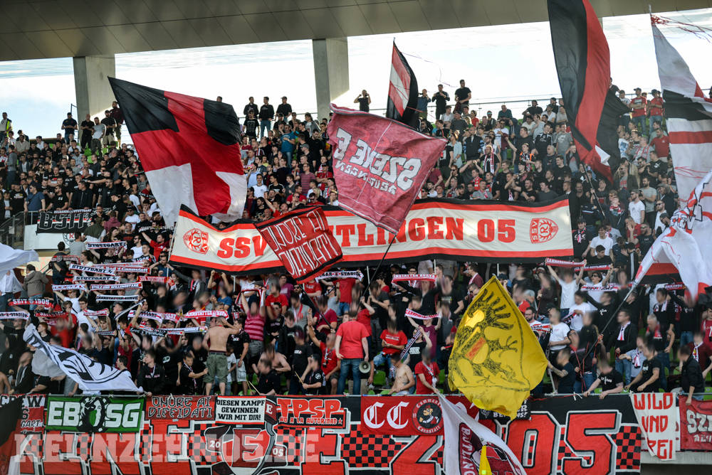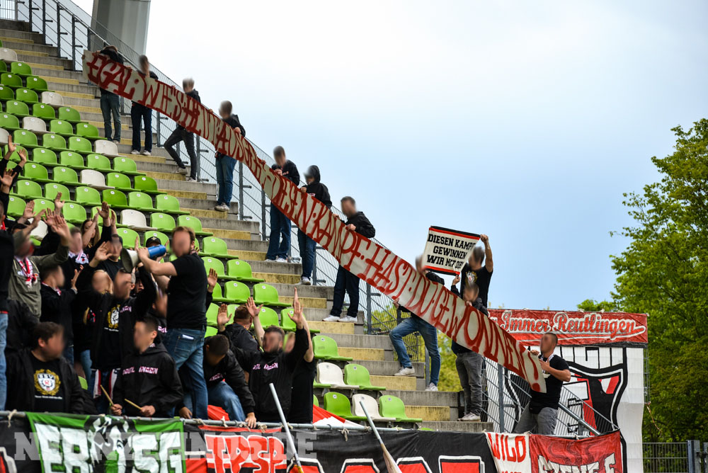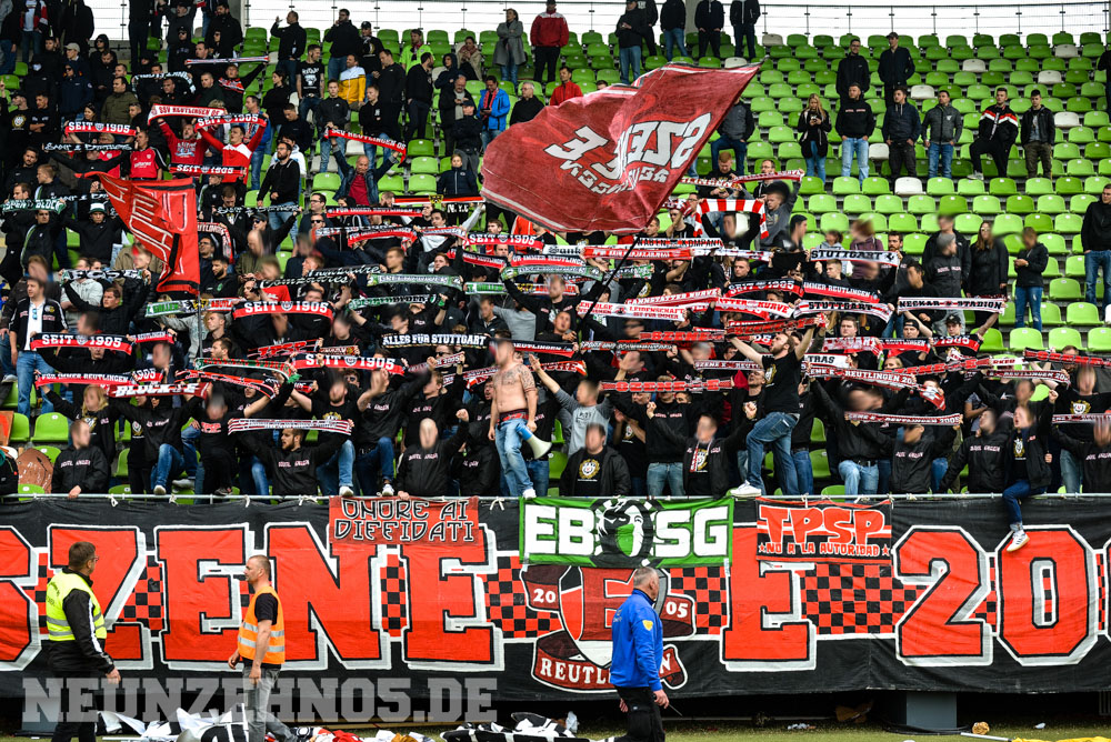 Was kann man sich Schöneres vorstellen als ein Derby unter der Woche. Pünktlich zweieinhalb Stunden vor Spielbeginn machten wir uns mit einem knapp vier Dutzend Mann starken Mob auf in Richtung Stadion. Zu unserer Überraschung konnten wir bis eine Straße vor dem Stadion unentdeckt vor den Bullen bleiben, die letzten paar Meter, vorbei am Gästeparkplatz, konnten auch ohne weitere Berührpunkte erfolgen, da das Pack aus Ulm noch in den Shuttlebussen unterwegs war. Die Bullen hingegen hatten schon mächtig aufgefahren, sodass ein Spalier aus Kastenwägen vom Parkplatz bis zum Gästeblockeingang reichte. Auf 16 Uhr wurde unsere Mannschaft vor der Kabine in Empfang genommen und mit einigen Schlachtrufen in Form von „Auf geht’s Reutlingen, kämpfen und siegen“ motiviert. Unser Block E war schon 15 Minuten vor Spielbeginn fast komplett gefüllt und auch der darüber liegende Block EE wies nur wenig leere Plätze auf. Zum Intro wurde im unteren Drittel des Blocks ein Spruchband im Stil des „SSV Reutlingen 05“ Schals hochgezogen. Um das Spruchband herum wurde eine Menge rotes Konfetti in die Luft geschossen. Unterstrichen wurde die optische Aktion mit sechs großen Schwenkfahnen, die sich im Block verteilten. Der Gästeblock hingegen entschied sich für ein Pyro-Intro. Weg von den Rängen hin zum Platz. Unsere Mannschaft konnte offensichtlich gut mithalten mit dem Regionalligisten, ein eklatanter Klassenunterschied war im ersten Moment nicht erkennbar. Umso bitterer, dass in der 20 Minute ein Sonntagsschuss aus knapp 25 Metern den Weg ins Tor findet. Der 0:1 Rückstand zur Hälfte also eher unverdient. Über ein Unentschieden hätte sich keine Seite beschweren können. Unsere Mannschaft noch im Halbzeitschlaf und innerhalb von zwei Minuten nach Wiederanpfiff steht es 0:3. Damit war den meisten klar, dass da nicht mehr viel gehen wird. Auf dem Feld lief von unserer Seite nun auch fast nichts mehr. Die Spatzen machten noch das aus ihrer Sicht, 4:0. Am Spielausgang konnte auch der von Elfadli erzielte Anschlusstreffer nichts mehr ändern. Nach dem Spiel machten wir uns mit dem gleichen Mob, auf den Rückweg, dieses Mal allerdings nicht ohne Begleitung. Zwischen sechs und acht Kastenwägen hinter uns und knapp 40 behelmte Cops. Zusammenfassend lässt sich sagen, dass wir im Block einen guten Auftritt abgeliefert haben und trotz der Niederlage und dem hohen Rückstand, in der zweiten Hälfte, den Affen im Gästeblock zeigen konnten, was Reutlinger sein bedeutet. An dieser Stelle noch ein herzlicher Dank an unsere Brüder aus Sankt Gallen und Stuttgart! Freiheit für Ultras!