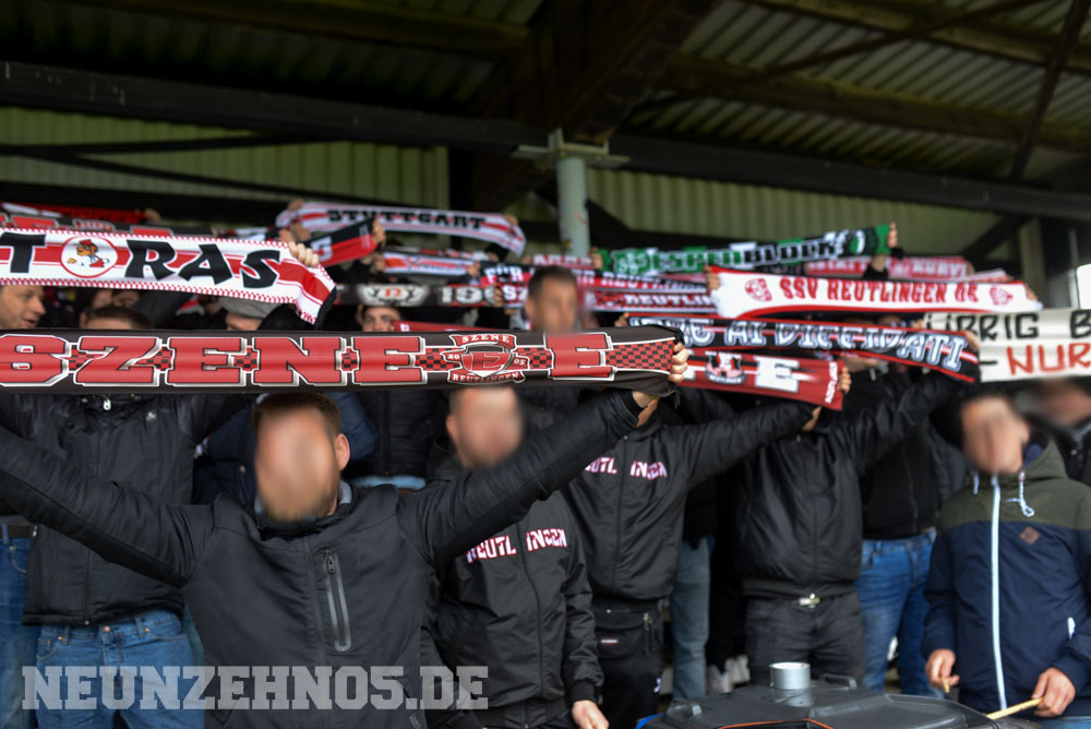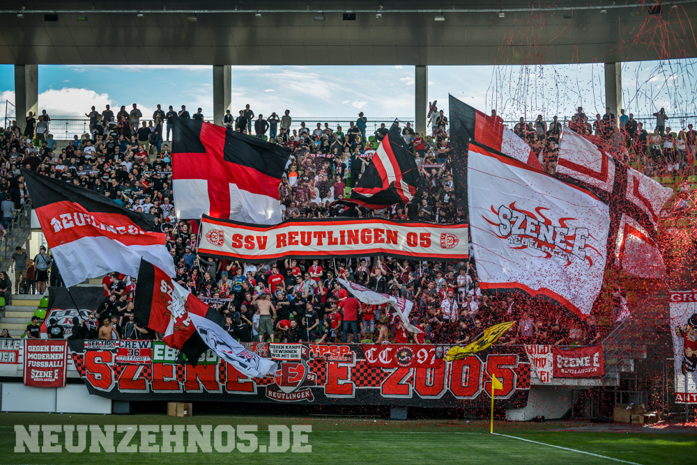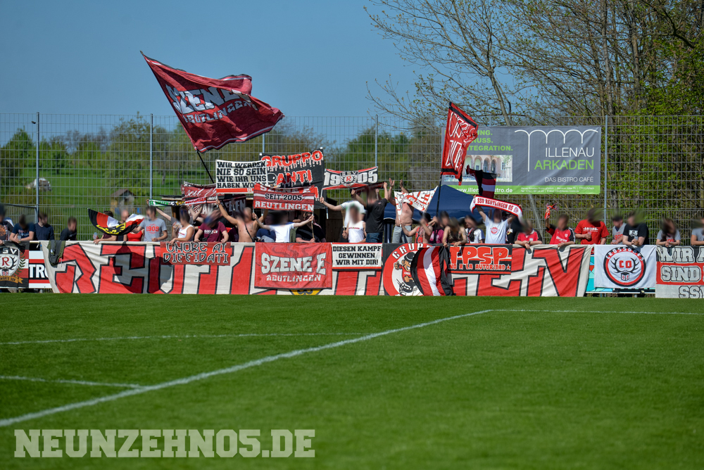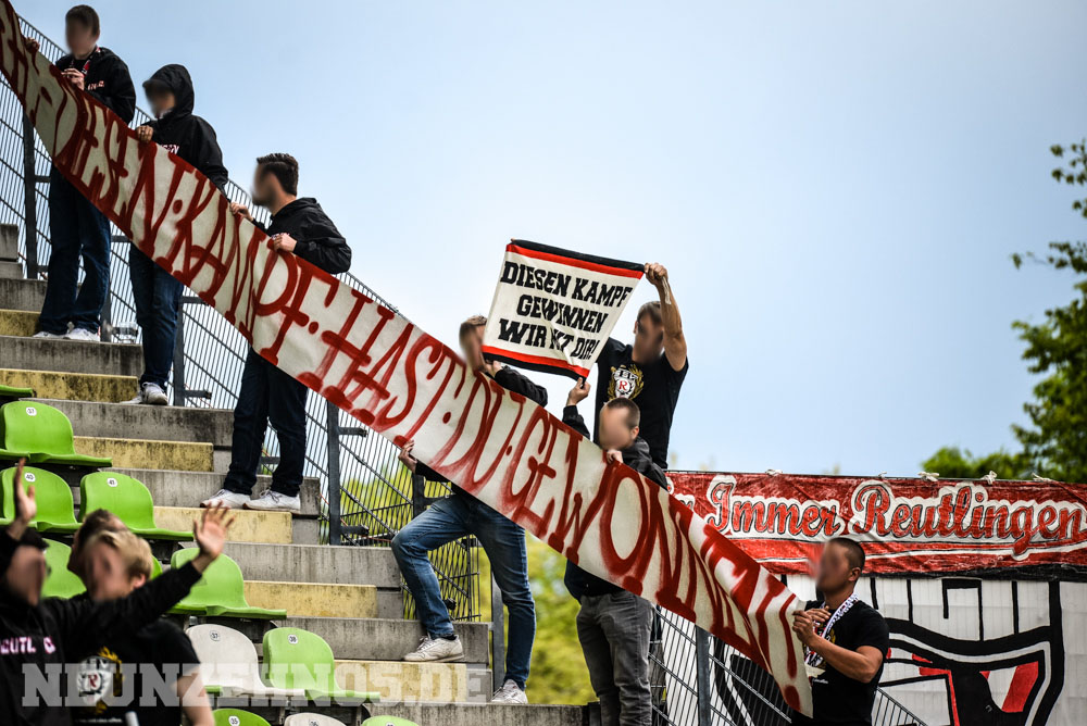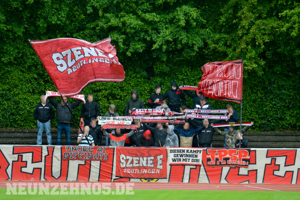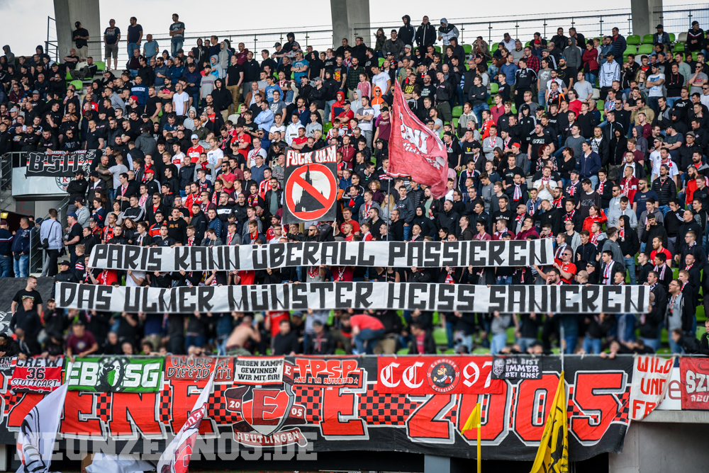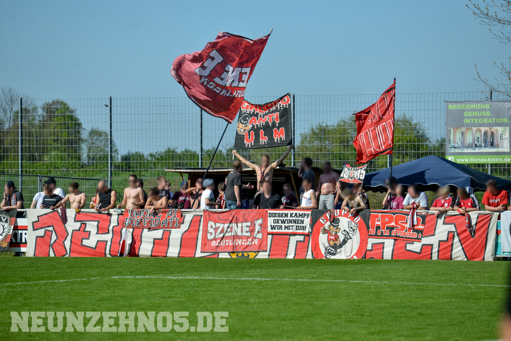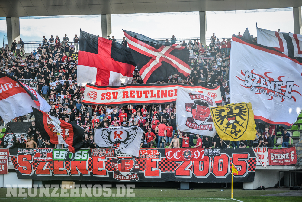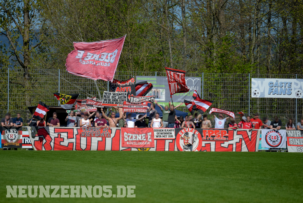Was kann man sich Schöneres vorstellen als ein Derby unter der Woche. Pünktlich zweieinhalb Stunden vor Spielbeginn machten wir uns mit einem knapp vier Dutzend Mann starken Mob auf in Richtung Stadion. Zu unserer Überraschung konnten wir bis eine Straße vor dem Stadion unentdeckt vor den Bullen bleiben, die letzten paar Meter, vorbei am Gästeparkplatz, konnten auch ohne weitere Berührpunkte erfolgen, da das Pack aus Ulm noch in den Shuttlebussen unterwegs war. Die Bullen hingegen hatten schon mächtig aufgefahren, sodass ein Spalier aus Kastenwägen vom Parkplatz bis zum Gästeblockeingang reichte. Auf 16 Uhr wurde unsere Mannschaft vor der Kabine in Empfang genommen und mit einigen Schlachtrufen in Form von „Auf geht’s Reutlingen, kämpfen und siegen“ motiviert. Unser Block E war schon 15 Minuten vor Spielbeginn fast komplett gefüllt und auch der darüber liegende Block EE wies nur wenig leere Plätze auf. Zum Intro wurde im unteren Drittel des Blocks ein Spruchband im Stil des „SSV Reutlingen 05“ Schals hochgezogen. Um das Spruchband herum wurde eine Menge rotes Konfetti in die Luft geschossen. Unterstrichen wurde die optische Aktion mit sechs großen Schwenkfahnen, die sich im Block verteilten. Der Gästeblock hingegen entschied sich für ein Pyro-Intro. Weg von den Rängen hin zum Platz. Unsere Mannschaft konnte offensichtlich gut mithalten mit dem Regionalligisten, ein eklatanter Klassenunterschied war im ersten Moment nicht erkennbar. Umso bitterer, dass in der 20 Minute ein Sonntagsschuss aus knapp 25 Metern den Weg ins Tor findet. Der 0:1 Rückstand zur Hälfte also eher unverdient. Über ein Unentschieden hätte sich keine Seite beschweren können. Unsere Mannschaft noch im Halbzeitschlaf und innerhalb von zwei Minuten nach Wiederanpfiff steht es 0:3. Damit war den meisten klar, dass da nicht mehr viel gehen wird. Auf dem Feld lief von unserer Seite nun auch fast nichts mehr. Die Spatzen machten noch das aus ihrer Sicht, 4:0. Am Spielausgang konnte auch der von Elfadli erzielte Anschlusstreffer nichts mehr ändern. Nach dem Spiel machten wir uns mit dem gleichen Mob, auf den Rückweg, dieses Mal allerdings nicht ohne Begleitung. Zwischen sechs und acht Kastenwägen hinter uns und knapp 40 behelmte Cops. Zusammenfassend lässt sich sagen, dass wir im Block einen guten Auftritt abgeliefert haben und trotz der Niederlage und dem hohen Rückstand, in der zweiten Hälfte, den Affen im Gästeblock zeigen konnten, was Reutlinger sein bedeutet. An dieser Stelle noch ein herzlicher Dank an unsere Brüder aus Sankt Gallen und Stuttgart! Freiheit für Ultras!