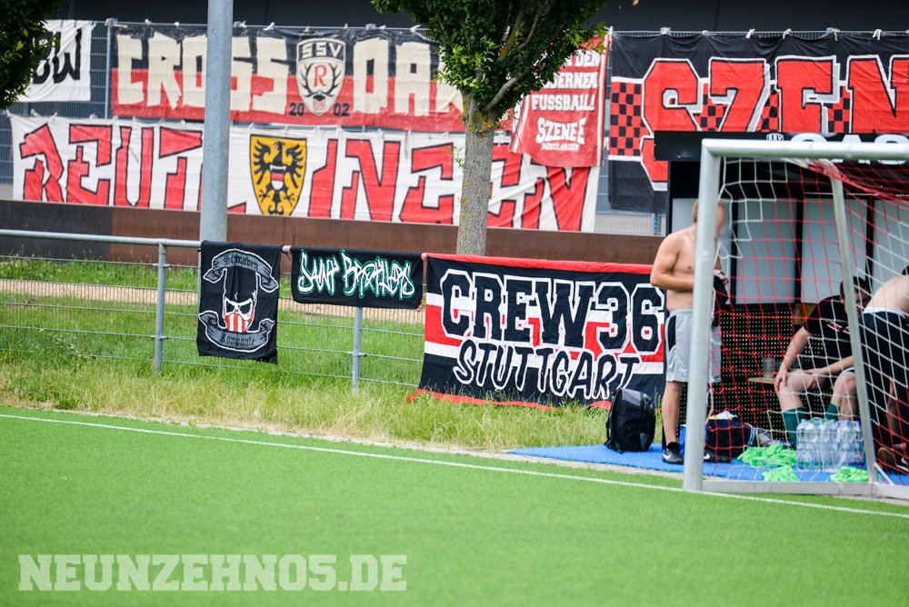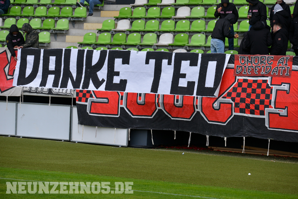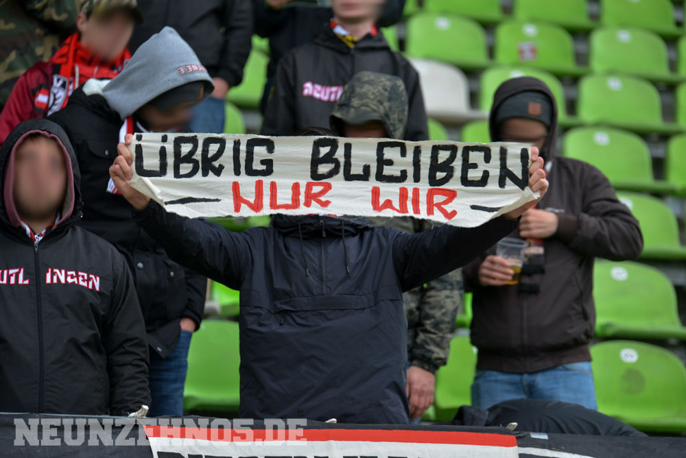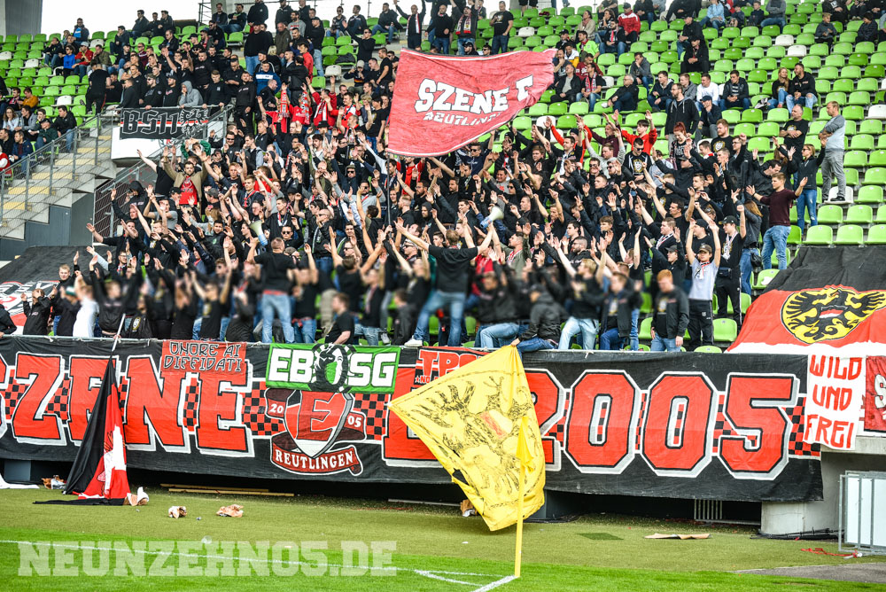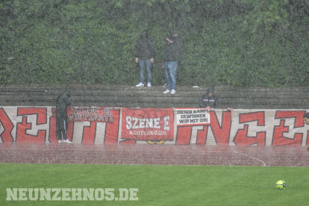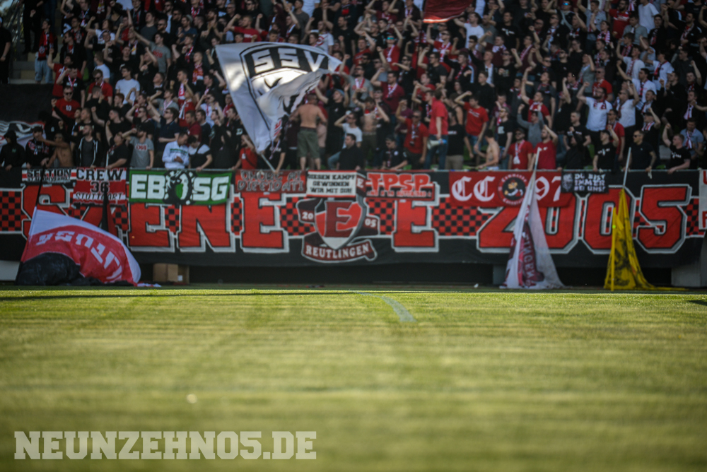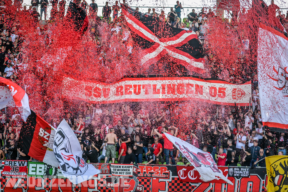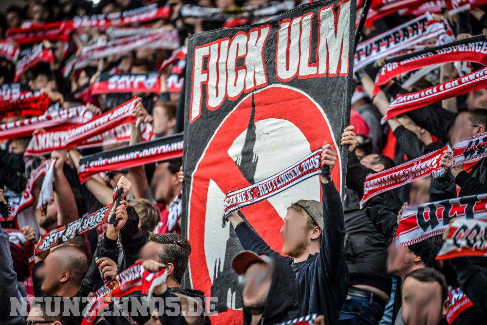 Was kann man sich Schöneres vorstellen als ein Derby unter der Woche. Pünktlich zweieinhalb Stunden vor Spielbeginn machten wir uns mit einem knapp vier Dutzend Mann starken Mob auf in Richtung Stadion. Zu unserer Überraschung konnten wir bis eine Straße vor dem Stadion unentdeckt vor den Bullen bleiben, die letzten paar Meter, vorbei am Gästeparkplatz, konnten auch ohne weitere Berührpunkte erfolgen, da das Pack aus Ulm noch in den Shuttlebussen unterwegs war. Die Bullen hingegen hatten schon mächtig aufgefahren, sodass ein Spalier aus Kastenwägen vom Parkplatz bis zum Gästeblockeingang reichte. Auf 16 Uhr wurde unsere Mannschaft vor der Kabine in Empfang genommen und mit einigen Schlachtrufen in Form von „Auf geht’s Reutlingen, kämpfen und siegen“ motiviert. Unser Block E war schon 15 Minuten vor Spielbeginn fast komplett gefüllt und auch der darüber liegende Block EE wies nur wenig leere Plätze auf. Zum Intro wurde im unteren Drittel des Blocks ein Spruchband im Stil des „SSV Reutlingen 05“ Schals hochgezogen. Um das Spruchband herum wurde eine Menge rotes Konfetti in die Luft geschossen. Unterstrichen wurde die optische Aktion mit sechs großen Schwenkfahnen, die sich im Block verteilten. Der Gästeblock hingegen entschied sich für ein Pyro-Intro. Weg von den Rängen hin zum Platz. Unsere Mannschaft konnte offensichtlich gut mithalten mit dem Regionalligisten, ein eklatanter Klassenunterschied war im ersten Moment nicht erkennbar. Umso bitterer, dass in der 20 Minute ein Sonntagsschuss aus knapp 25 Metern den Weg ins Tor findet. Der 0:1 Rückstand zur Hälfte also eher unverdient. Über ein Unentschieden hätte sich keine Seite beschweren können. Unsere Mannschaft noch im Halbzeitschlaf und innerhalb von zwei Minuten nach Wiederanpfiff steht es 0:3. Damit war den meisten klar, dass da nicht mehr viel gehen wird. Auf dem Feld lief von unserer Seite nun auch fast nichts mehr. Die Spatzen machten noch das aus ihrer Sicht, 4:0. Am Spielausgang konnte auch der von Elfadli erzielte Anschlusstreffer nichts mehr ändern. Nach dem Spiel machten wir uns mit dem gleichen Mob, auf den Rückweg, dieses Mal allerdings nicht ohne Begleitung. Zwischen sechs und acht Kastenwägen hinter uns und knapp 40 behelmte Cops. Zusammenfassend lässt sich sagen, dass wir im Block einen guten Auftritt abgeliefert haben und trotz der Niederlage und dem hohen Rückstand, in der zweiten Hälfte, den Affen im Gästeblock zeigen konnten, was Reutlinger sein bedeutet. An dieser Stelle noch ein herzlicher Dank an unsere Brüder aus Sankt Gallen und Stuttgart! Freiheit für Ultras!