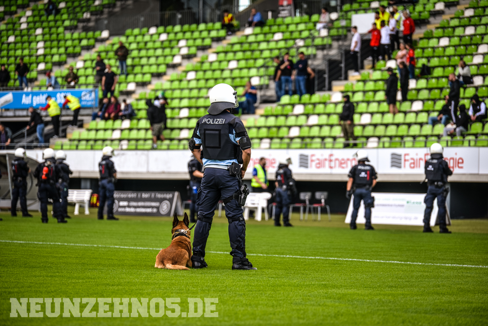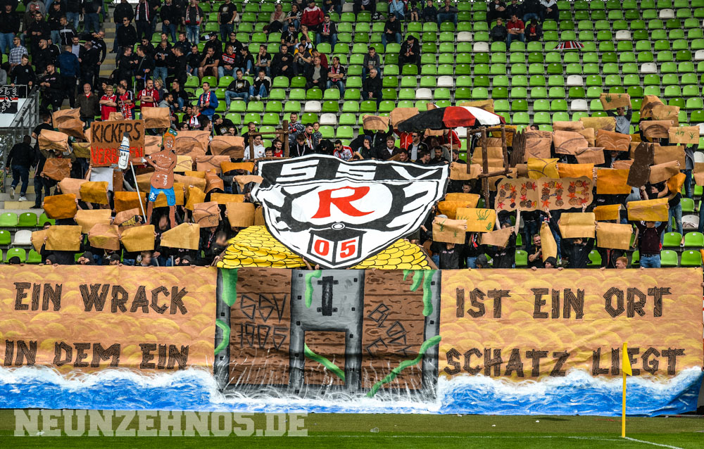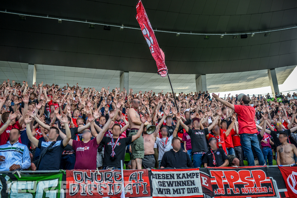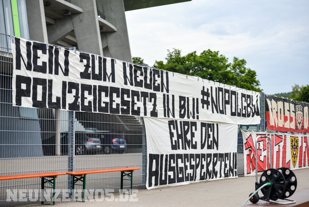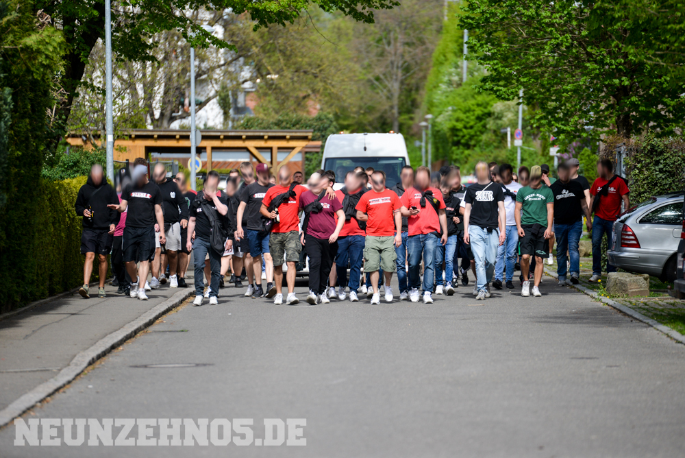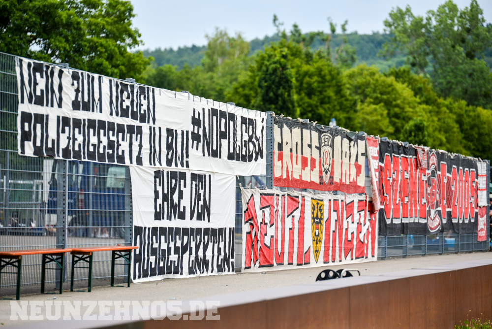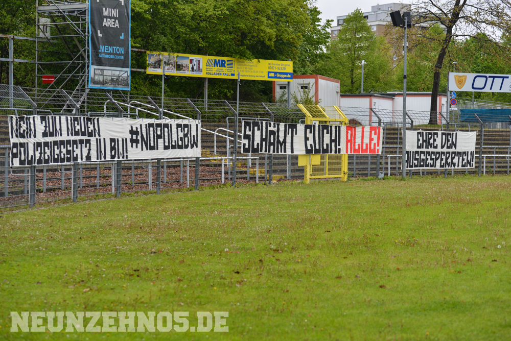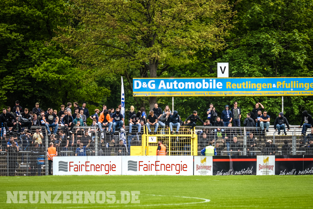 Was kann man sich Schöneres vorstellen als ein Derby unter der Woche. Pünktlich zweieinhalb Stunden vor Spielbeginn machten wir uns mit einem knapp vier Dutzend Mann starken Mob auf in Richtung Stadion. Zu unserer Überraschung konnten wir bis eine Straße vor dem Stadion unentdeckt vor den Bullen bleiben, die letzten paar Meter, vorbei am Gästeparkplatz, konnten auch ohne weitere Berührpunkte erfolgen, da das Pack aus Ulm noch in den Shuttlebussen unterwegs war. Die Bullen hingegen hatten schon mächtig aufgefahren, sodass ein Spalier aus Kastenwägen vom Parkplatz bis zum Gästeblockeingang reichte. Auf 16 Uhr wurde unsere Mannschaft vor der Kabine in Empfang genommen und mit einigen Schlachtrufen in Form von „Auf geht’s Reutlingen, kämpfen und siegen“ motiviert. Unser Block E war schon 15 Minuten vor Spielbeginn fast komplett gefüllt und auch der darüber liegende Block EE wies nur wenig leere Plätze auf. Zum Intro wurde im unteren Drittel des Blocks ein Spruchband im Stil des „SSV Reutlingen 05“ Schals hochgezogen. Um das Spruchband herum wurde eine Menge rotes Konfetti in die Luft geschossen. Unterstrichen wurde die optische Aktion mit sechs großen Schwenkfahnen, die sich im Block verteilten. Der Gästeblock hingegen entschied sich für ein Pyro-Intro. Weg von den Rängen hin zum Platz. Unsere Mannschaft konnte offensichtlich gut mithalten mit dem Regionalligisten, ein eklatanter Klassenunterschied war im ersten Moment nicht erkennbar. Umso bitterer, dass in der 20 Minute ein Sonntagsschuss aus knapp 25 Metern den Weg ins Tor findet. Der 0:1 Rückstand zur Hälfte also eher unverdient. Über ein Unentschieden hätte sich keine Seite beschweren können. Unsere Mannschaft noch im Halbzeitschlaf und innerhalb von zwei Minuten nach Wiederanpfiff steht es 0:3. Damit war den meisten klar, dass da nicht mehr viel gehen wird. Auf dem Feld lief von unserer Seite nun auch fast nichts mehr. Die Spatzen machten noch das aus ihrer Sicht, 4:0. Am Spielausgang konnte auch der von Elfadli erzielte Anschlusstreffer nichts mehr ändern. Nach dem Spiel machten wir uns mit dem gleichen Mob, auf den Rückweg, dieses Mal allerdings nicht ohne Begleitung. Zwischen sechs und acht Kastenwägen hinter uns und knapp 40 behelmte Cops. Zusammenfassend lässt sich sagen, dass wir im Block einen guten Auftritt abgeliefert haben und trotz der Niederlage und dem hohen Rückstand, in der zweiten Hälfte, den Affen im Gästeblock zeigen konnten, was Reutlinger sein bedeutet. An dieser Stelle noch ein herzlicher Dank an unsere Brüder aus Sankt Gallen und Stuttgart! Freiheit für Ultras!