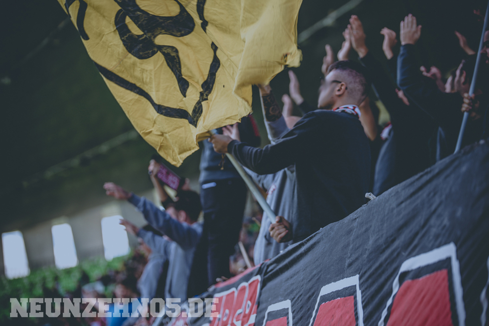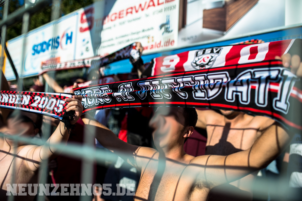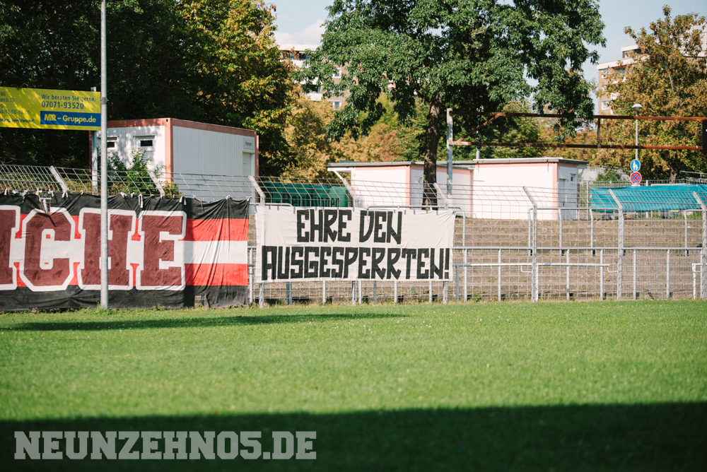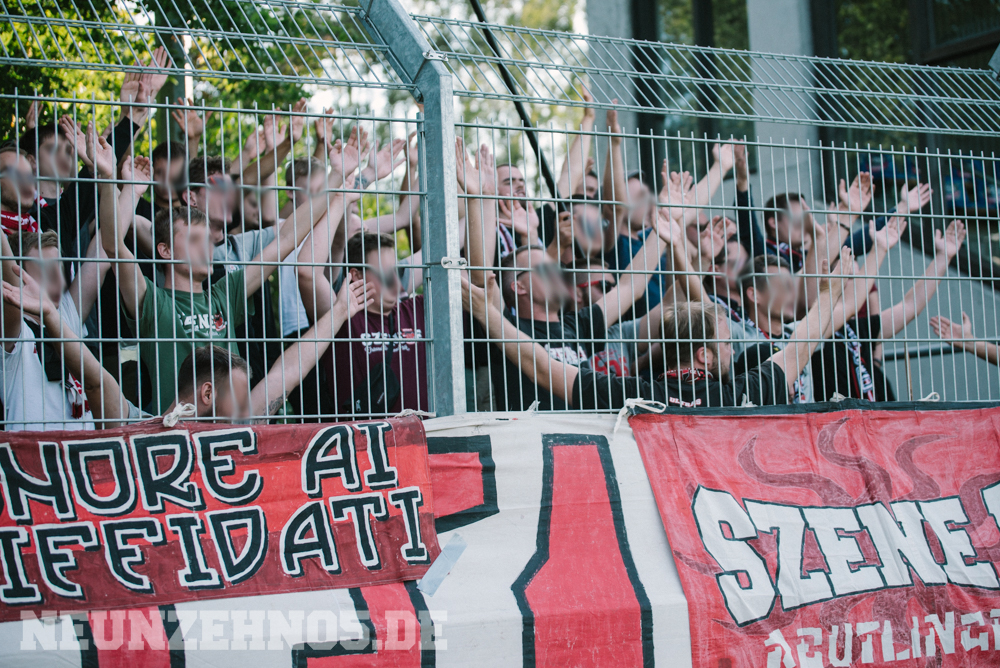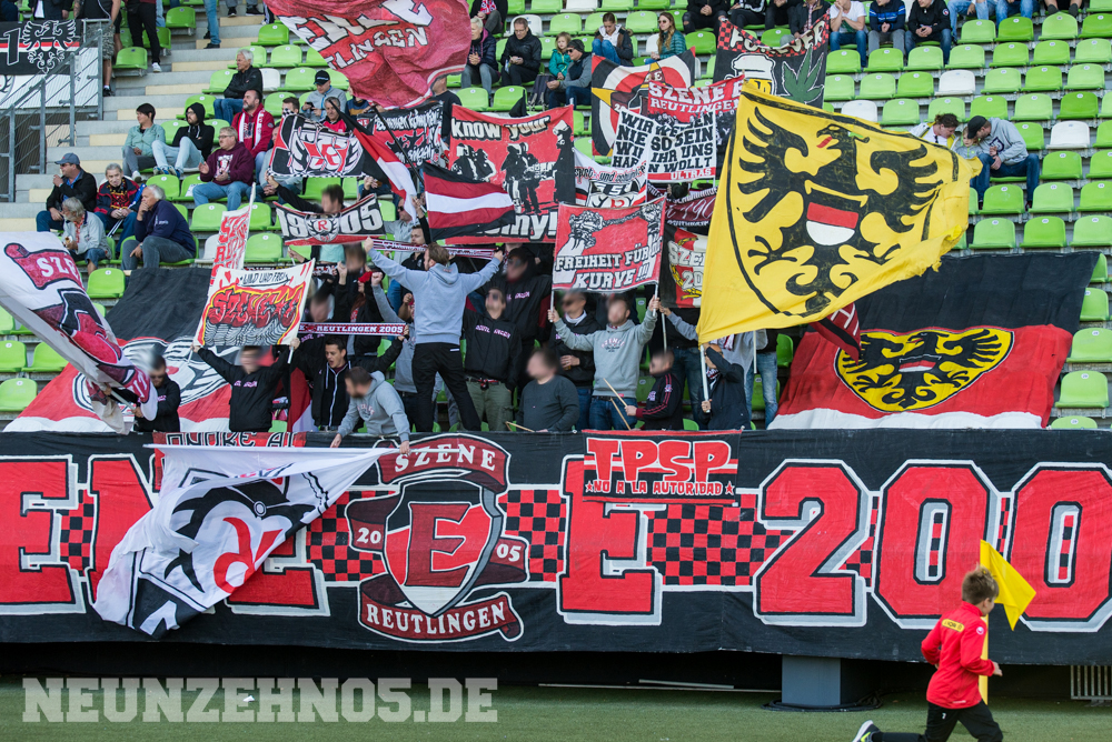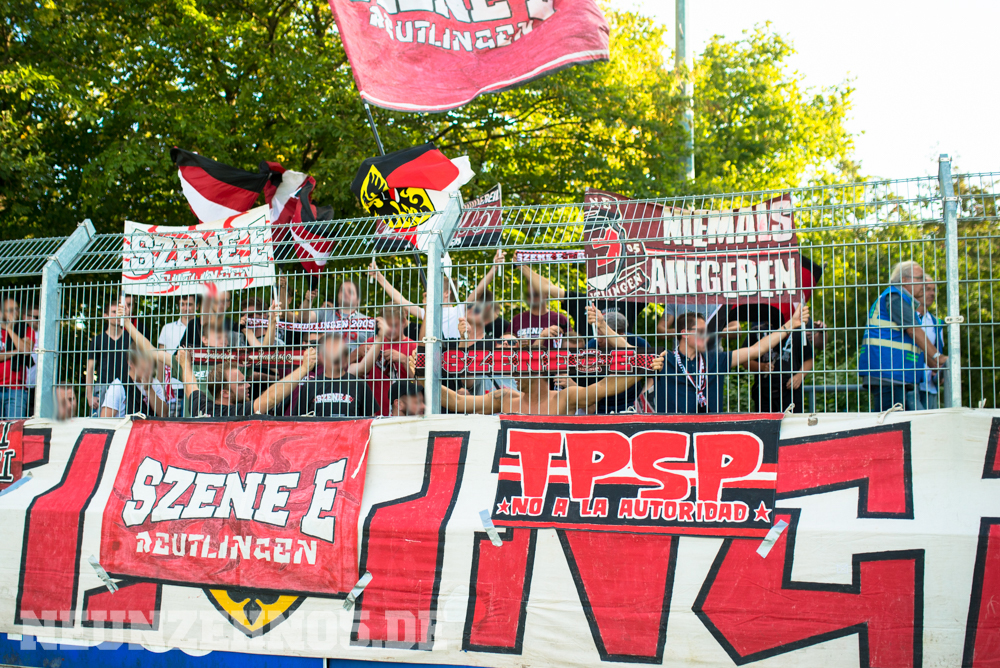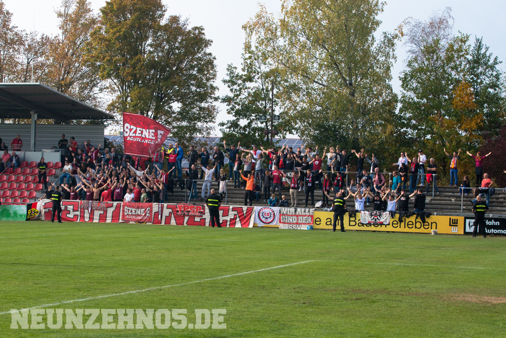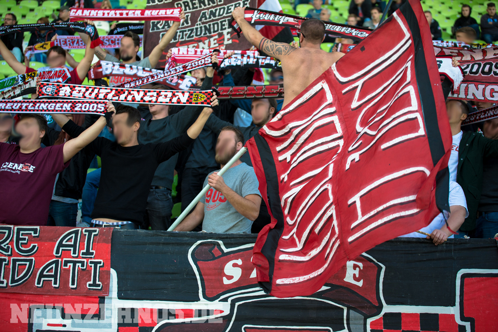 Diesmal also Göppingen. Aufgrund der Scherereien, die wir hier regelmäßig mit den Bullen hatten, entschieden und es in unserer jetzigen Situation definitiv nicht zielführend ist den nächsten „Skandal“ herauszufordern, entschlossen wir uns diesmal für die entspannte Anreise-Variante per Bus statt Bahn. Und so fanden wir uns direkt nach dem Erreichen der B10 wieder in der Polizei-Eskorte wieder. Allerdings, trotz erneut anwesender Reiterstaffel hielten sich die Cops diesmal angenehm zurück. Nach peniblen aber dennoch korrekten Einlasskontrollen standen wir im Gästeblock, der ja bekanntlich mit seinen Betonstufen zu überzeugen weiß. Soweit – so gut, doch dann kam unser SSV 05 ins Spiel. Beziehungsweise eben nicht, die Mannschaft agierte in der ersten Halbzeit komplett passiv und spielte höchstens noch mit. Die Quittung gab’s dann in der 30. Minute: 2 Göppinger waren quasi durch, einer wurde im Strafraum zu Fall gebracht. Den Elfmeter und auch das 2:0 nur einige Zeigerumdrehungen später verwandelte ausgerechnet unser Lieblings-Arschloch Kevin Dicklhuber. Pausenstand also 2:0. Die zweite Halbzeit lässt sich leider schnell zusammenfassen: Unser Team jetzt mit mehr Spielanteilen, viel geackert aber vor dem Tor viel zu ungefährlich und man fühlte sich an den SSV von vor 2, 3 Jahren erinnert. Im Block fanden wir uns derweil in der mittlerweile ungewohnten Situation wieder, dass wir voran gehen mussten um die Mannschaft zu pushen und den nötigen Biss und Siegeswillen auf den Platz zu tragen. Die dementsprechende Lautstärke kriegten wir auch ab und zu hin, summa summarum war da aber noch gut Luft nach oben. Bleibt zu hoffen, dass die Mannschaft erneut die Kurve kriegt und im nächsten Spiel liefern kann. Ganz bitter noch der Ausfall von Marcel Avdic, der Mitte der zweiten Halbzeit verletzt raus musste. Das sah garnicht gut aus, somit fehlt womöglich ein weiterer Leistungsträger im Kader. Zum Glück haben Bissingen und auch die Degerlocher Zecken ihre Punkte genauso liegen lassen, sodass wenigstens der Abstand zu diesen zwei nicht größer geworden ist, sprich wir weiterhin einen Punkt Rückstand auf den Erstplatzierten haben.