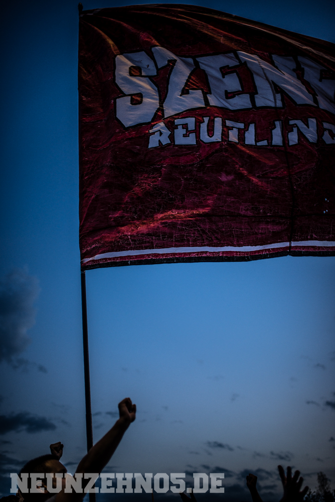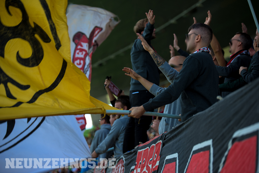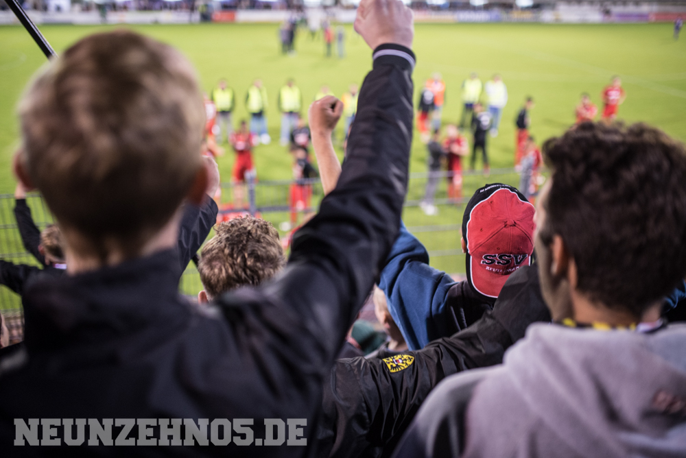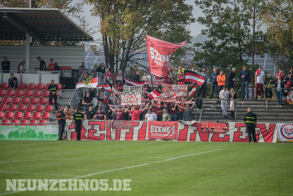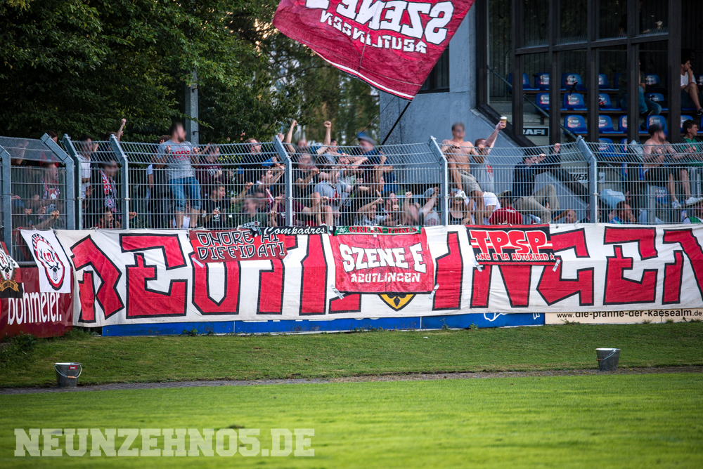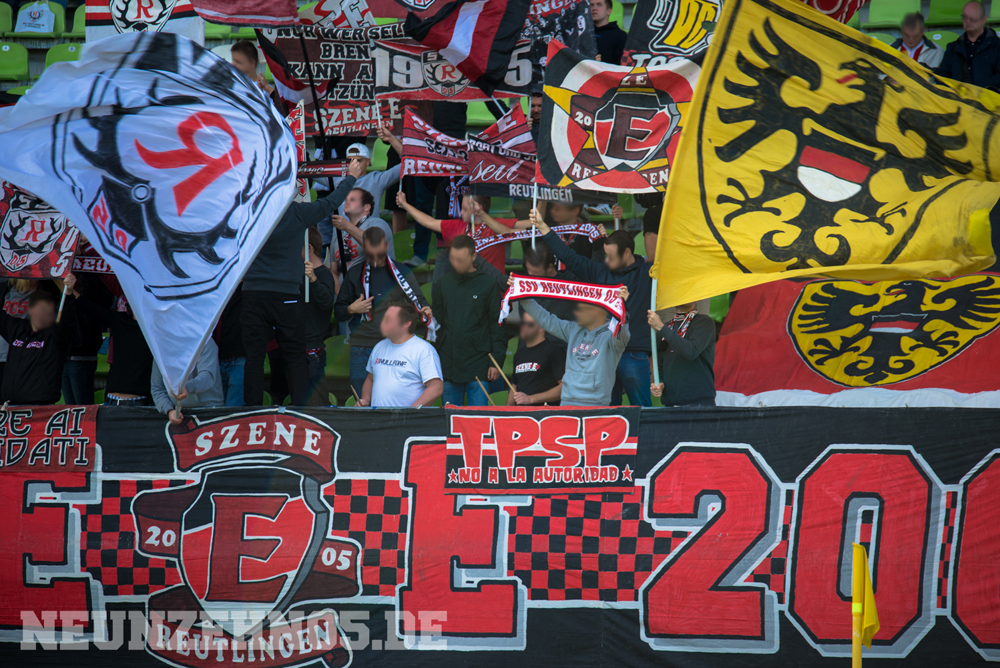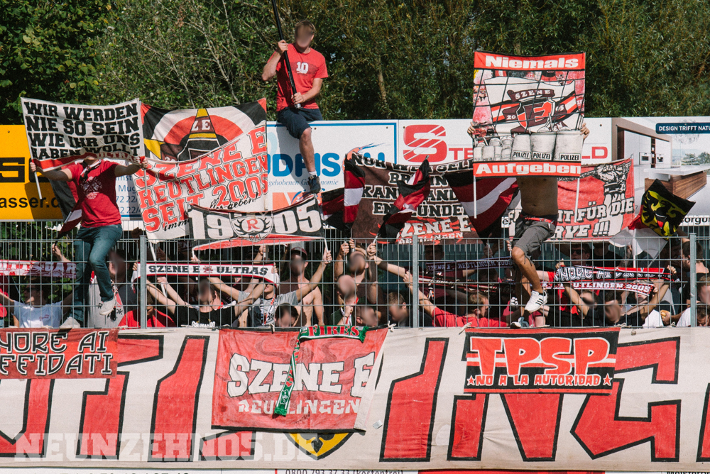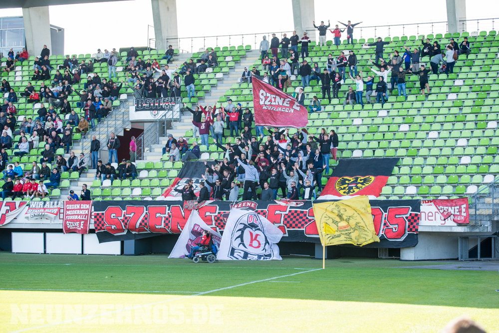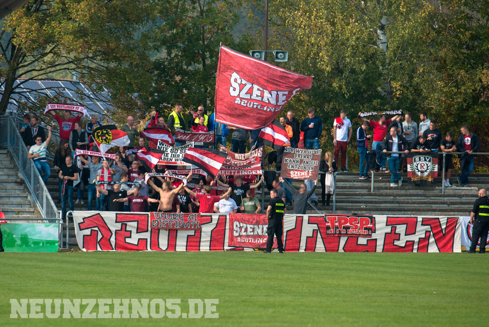 Diesmal also Göppingen. Aufgrund der Scherereien, die wir hier regelmäßig mit den Bullen hatten, entschieden und es in unserer jetzigen Situation definitiv nicht zielführend ist den nächsten „Skandal“ herauszufordern, entschlossen wir uns diesmal für die entspannte Anreise-Variante per Bus statt Bahn. Und so fanden wir uns direkt nach dem Erreichen der B10 wieder in der Polizei-Eskorte wieder. Allerdings, trotz erneut anwesender Reiterstaffel hielten sich die Cops diesmal angenehm zurück. Nach peniblen aber dennoch korrekten Einlasskontrollen standen wir im Gästeblock, der ja bekanntlich mit seinen Betonstufen zu überzeugen weiß. Soweit – so gut, doch dann kam unser SSV 05 ins Spiel. Beziehungsweise eben nicht, die Mannschaft agierte in der ersten Halbzeit komplett passiv und spielte höchstens noch mit. Die Quittung gab’s dann in der 30. Minute: 2 Göppinger waren quasi durch, einer wurde im Strafraum zu Fall gebracht. Den Elfmeter und auch das 2:0 nur einige Zeigerumdrehungen später verwandelte ausgerechnet unser Lieblings-Arschloch Kevin Dicklhuber. Pausenstand also 2:0. Die zweite Halbzeit lässt sich leider schnell zusammenfassen: Unser Team jetzt mit mehr Spielanteilen, viel geackert aber vor dem Tor viel zu ungefährlich und man fühlte sich an den SSV von vor 2, 3 Jahren erinnert. Im Block fanden wir uns derweil in der mittlerweile ungewohnten Situation wieder, dass wir voran gehen mussten um die Mannschaft zu pushen und den nötigen Biss und Siegeswillen auf den Platz zu tragen. Die dementsprechende Lautstärke kriegten wir auch ab und zu hin, summa summarum war da aber noch gut Luft nach oben. Bleibt zu hoffen, dass die Mannschaft erneut die Kurve kriegt und im nächsten Spiel liefern kann. Ganz bitter noch der Ausfall von Marcel Avdic, der Mitte der zweiten Halbzeit verletzt raus musste. Das sah garnicht gut aus, somit fehlt womöglich ein weiterer Leistungsträger im Kader. Zum Glück haben Bissingen und auch die Degerlocher Zecken ihre Punkte genauso liegen lassen, sodass wenigstens der Abstand zu diesen zwei nicht größer geworden ist, sprich wir weiterhin einen Punkt Rückstand auf den Erstplatzierten haben.