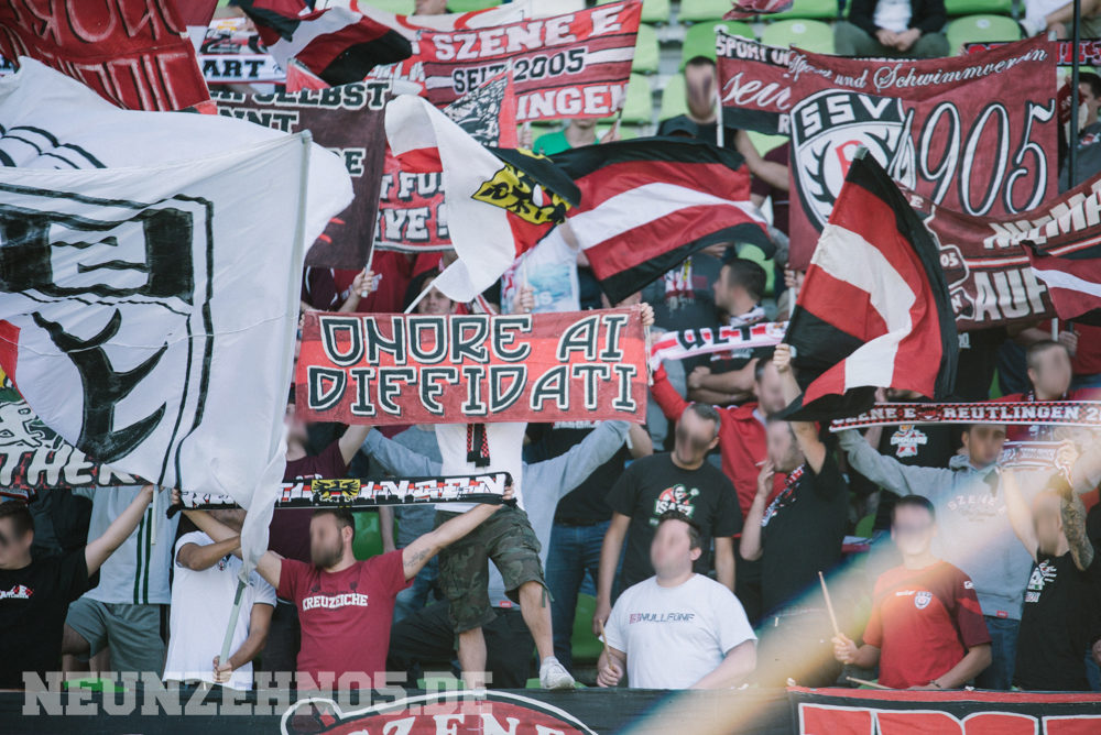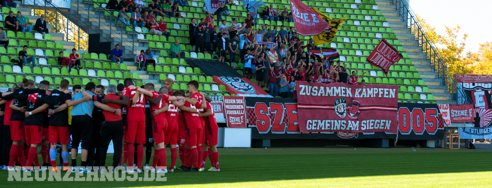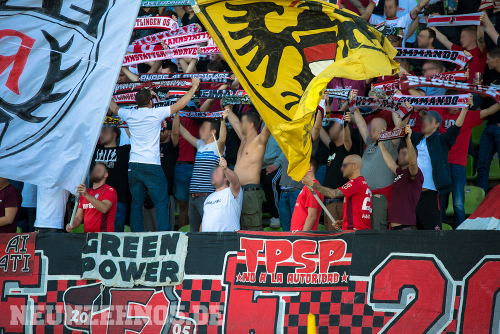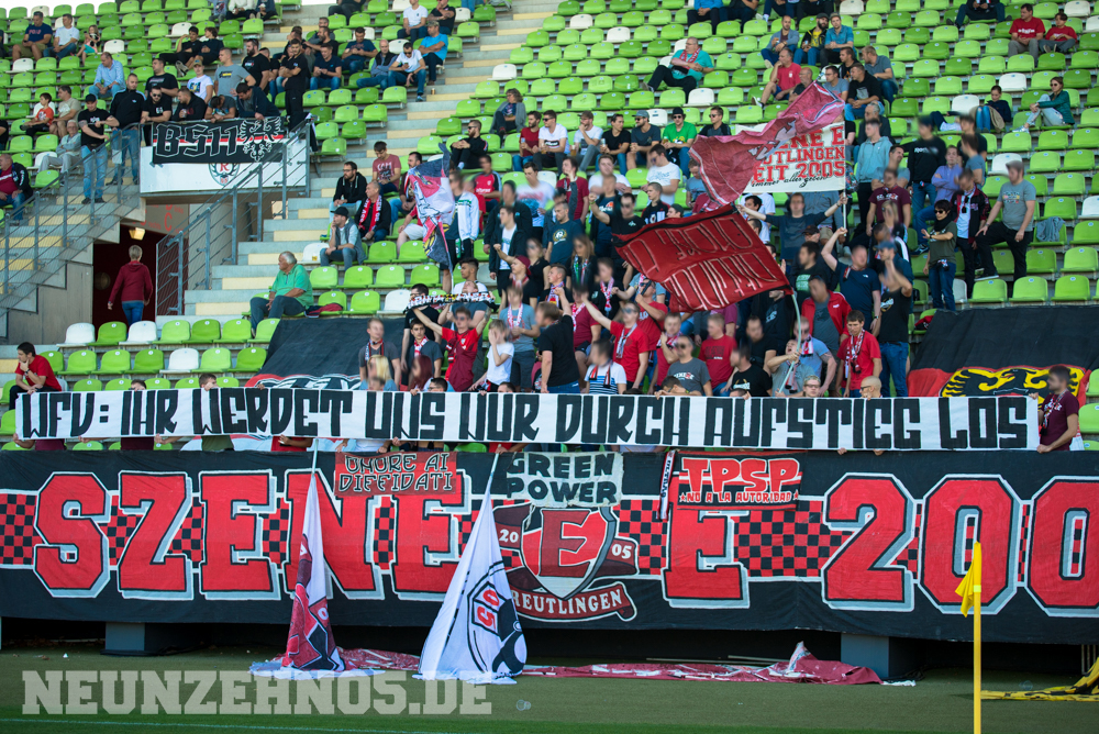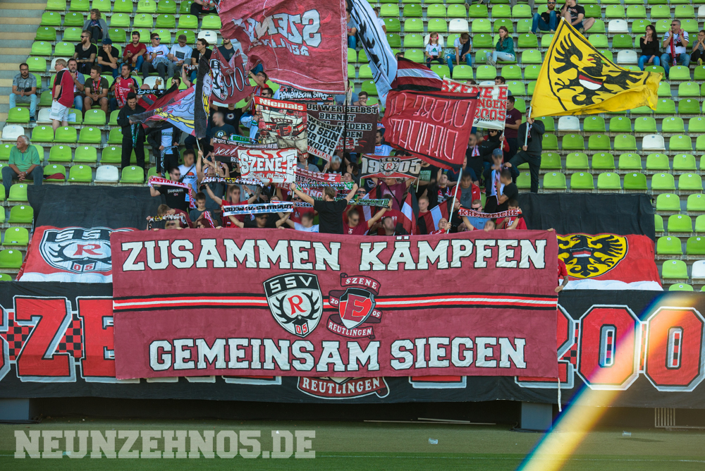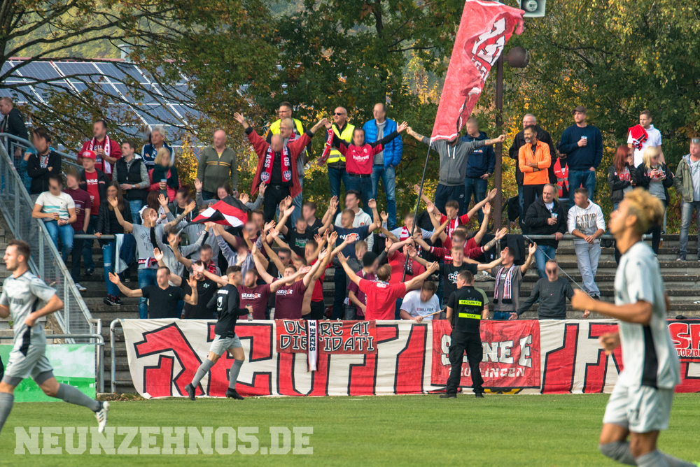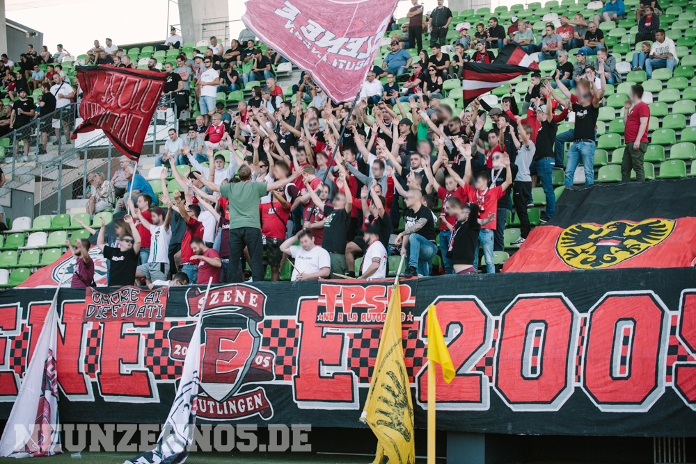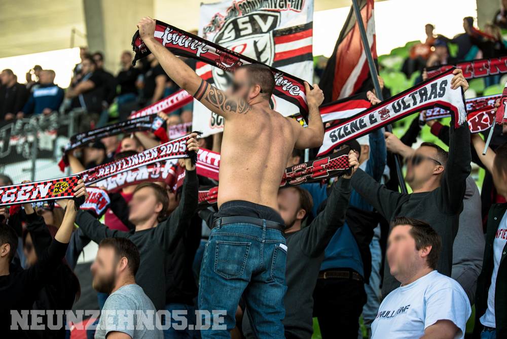 Diesmal also Göppingen. Aufgrund der Scherereien, die wir hier regelmäßig mit den Bullen hatten, entschieden und es in unserer jetzigen Situation definitiv nicht zielführend ist den nächsten „Skandal“ herauszufordern, entschlossen wir uns diesmal für die entspannte Anreise-Variante per Bus statt Bahn. Und so fanden wir uns direkt nach dem Erreichen der B10 wieder in der Polizei-Eskorte wieder. Allerdings, trotz erneut anwesender Reiterstaffel hielten sich die Cops diesmal angenehm zurück. Nach peniblen aber dennoch korrekten Einlasskontrollen standen wir im Gästeblock, der ja bekanntlich mit seinen Betonstufen zu überzeugen weiß. Soweit – so gut, doch dann kam unser SSV 05 ins Spiel. Beziehungsweise eben nicht, die Mannschaft agierte in der ersten Halbzeit komplett passiv und spielte höchstens noch mit. Die Quittung gab’s dann in der 30. Minute: 2 Göppinger waren quasi durch, einer wurde im Strafraum zu Fall gebracht. Den Elfmeter und auch das 2:0 nur einige Zeigerumdrehungen später verwandelte ausgerechnet unser Lieblings-Arschloch Kevin Dicklhuber. Pausenstand also 2:0. Die zweite Halbzeit lässt sich leider schnell zusammenfassen: Unser Team jetzt mit mehr Spielanteilen, viel geackert aber vor dem Tor viel zu ungefährlich und man fühlte sich an den SSV von vor 2, 3 Jahren erinnert. Im Block fanden wir uns derweil in der mittlerweile ungewohnten Situation wieder, dass wir voran gehen mussten um die Mannschaft zu pushen und den nötigen Biss und Siegeswillen auf den Platz zu tragen. Die dementsprechende Lautstärke kriegten wir auch ab und zu hin, summa summarum war da aber noch gut Luft nach oben. Bleibt zu hoffen, dass die Mannschaft erneut die Kurve kriegt und im nächsten Spiel liefern kann. Ganz bitter noch der Ausfall von Marcel Avdic, der Mitte der zweiten Halbzeit verletzt raus musste. Das sah garnicht gut aus, somit fehlt womöglich ein weiterer Leistungsträger im Kader. Zum Glück haben Bissingen und auch die Degerlocher Zecken ihre Punkte genauso liegen lassen, sodass wenigstens der Abstand zu diesen zwei nicht größer geworden ist, sprich wir weiterhin einen Punkt Rückstand auf den Erstplatzierten haben.
