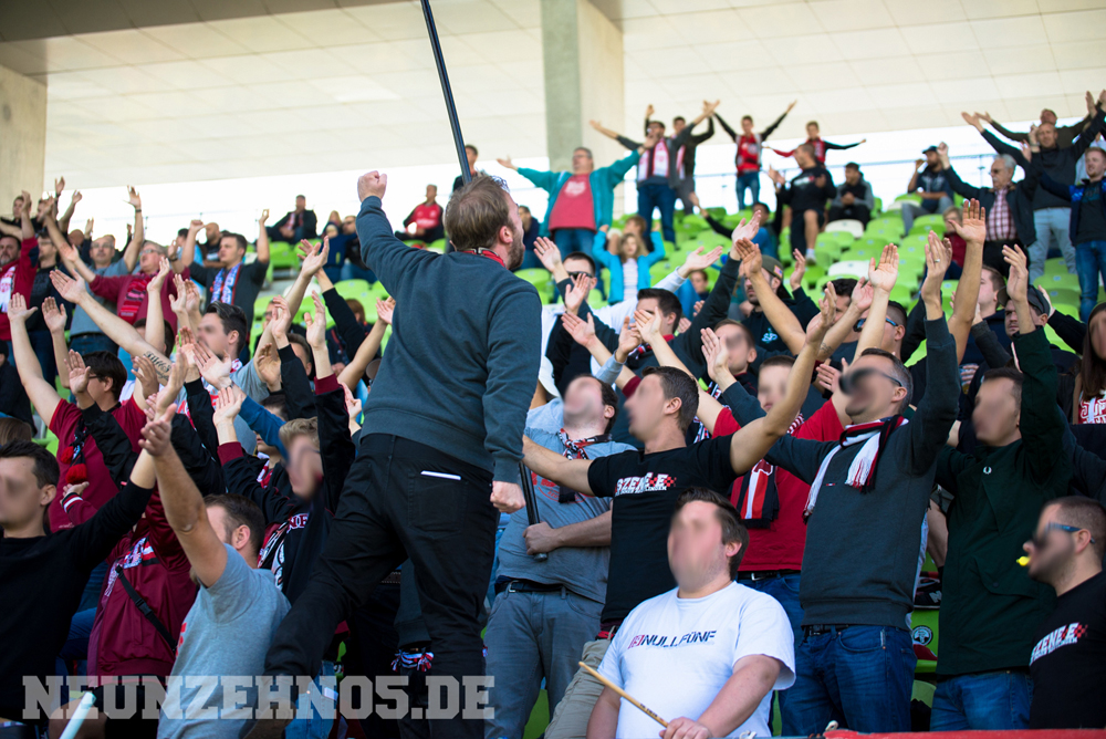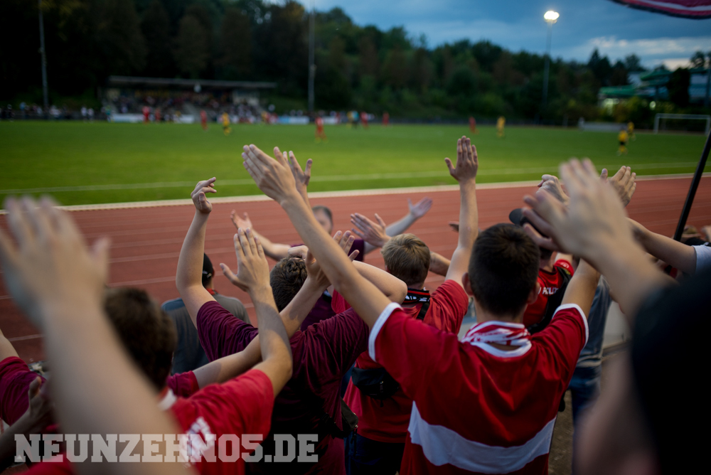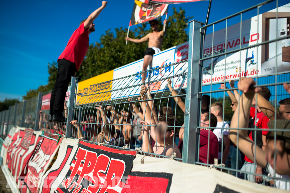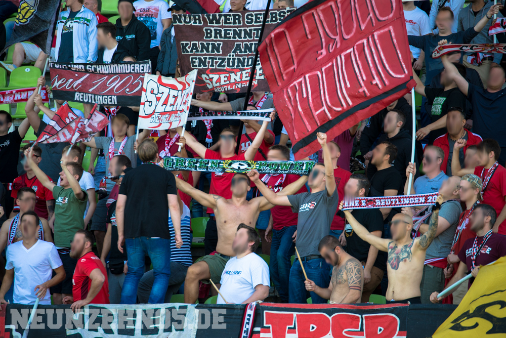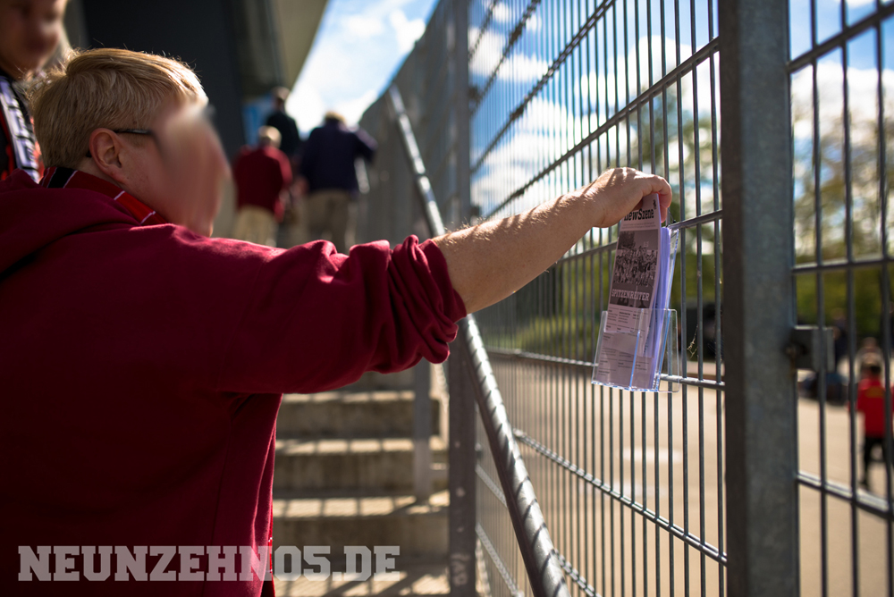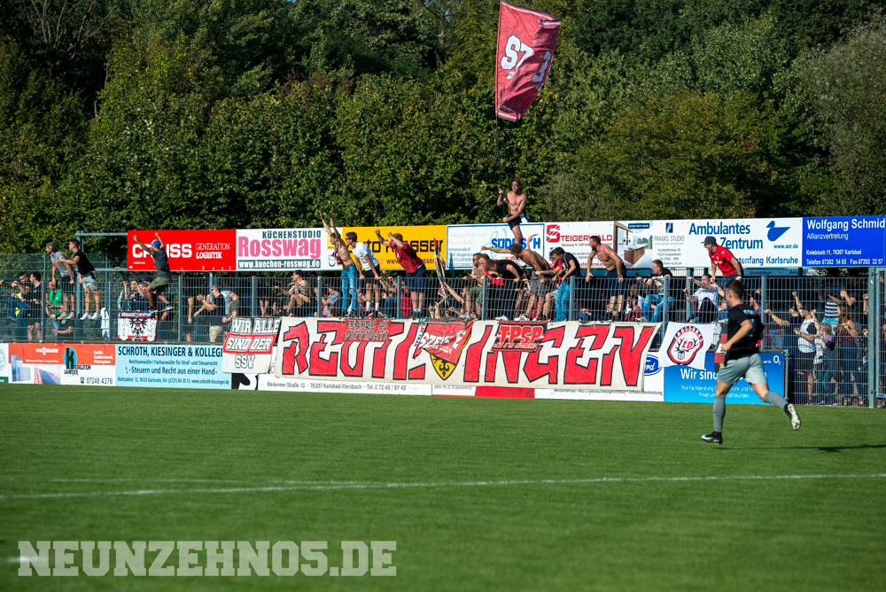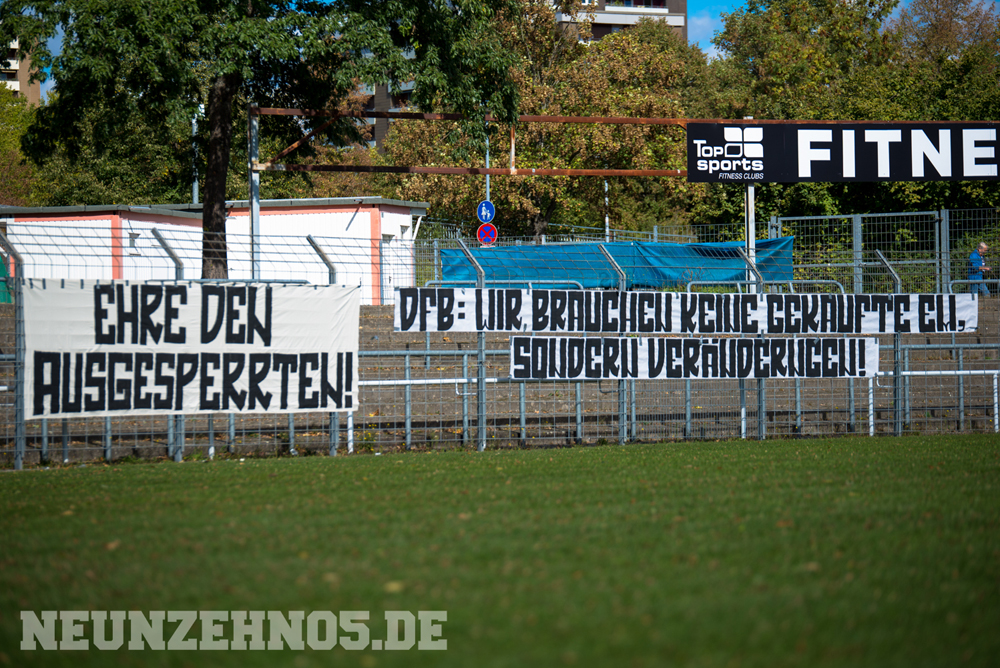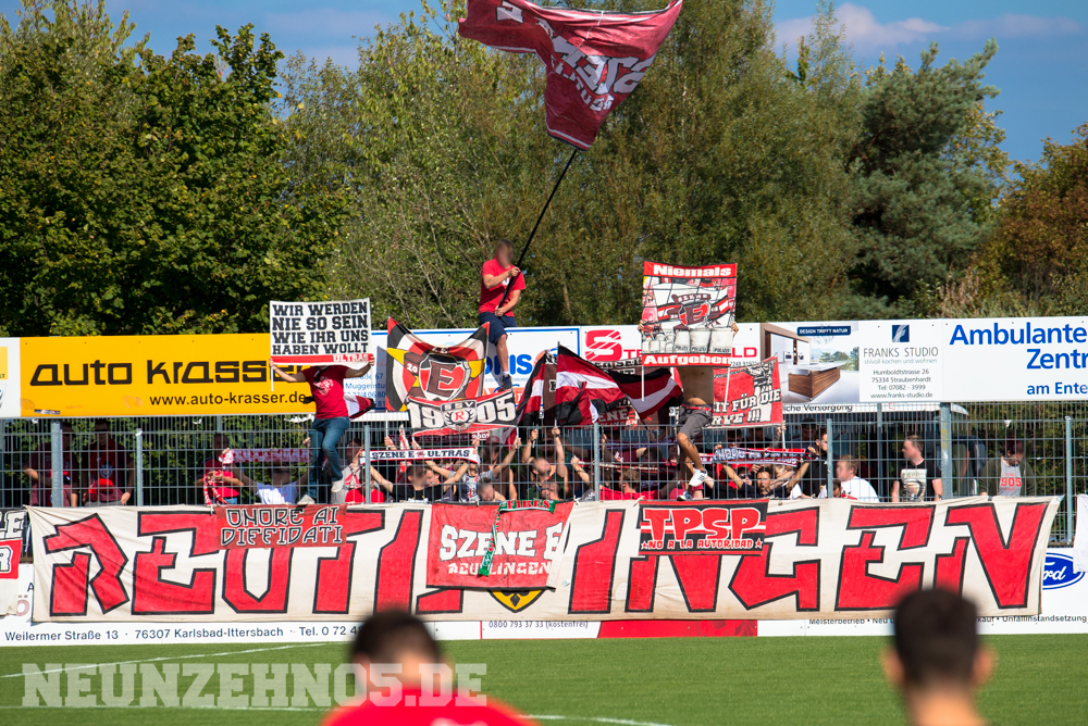 Diesmal also Göppingen. Aufgrund der Scherereien, die wir hier regelmäßig mit den Bullen hatten, entschieden und es in unserer jetzigen Situation definitiv nicht zielführend ist den nächsten „Skandal“ herauszufordern, entschlossen wir uns diesmal für die entspannte Anreise-Variante per Bus statt Bahn. Und so fanden wir uns direkt nach dem Erreichen der B10 wieder in der Polizei-Eskorte wieder. Allerdings, trotz erneut anwesender Reiterstaffel hielten sich die Cops diesmal angenehm zurück. Nach peniblen aber dennoch korrekten Einlasskontrollen standen wir im Gästeblock, der ja bekanntlich mit seinen Betonstufen zu überzeugen weiß. Soweit – so gut, doch dann kam unser SSV 05 ins Spiel. Beziehungsweise eben nicht, die Mannschaft agierte in der ersten Halbzeit komplett passiv und spielte höchstens noch mit. Die Quittung gab’s dann in der 30. Minute: 2 Göppinger waren quasi durch, einer wurde im Strafraum zu Fall gebracht. Den Elfmeter und auch das 2:0 nur einige Zeigerumdrehungen später verwandelte ausgerechnet unser Lieblings-Arschloch Kevin Dicklhuber. Pausenstand also 2:0. Die zweite Halbzeit lässt sich leider schnell zusammenfassen: Unser Team jetzt mit mehr Spielanteilen, viel geackert aber vor dem Tor viel zu ungefährlich und man fühlte sich an den SSV von vor 2, 3 Jahren erinnert. Im Block fanden wir uns derweil in der mittlerweile ungewohnten Situation wieder, dass wir voran gehen mussten um die Mannschaft zu pushen und den nötigen Biss und Siegeswillen auf den Platz zu tragen. Die dementsprechende Lautstärke kriegten wir auch ab und zu hin, summa summarum war da aber noch gut Luft nach oben. Bleibt zu hoffen, dass die Mannschaft erneut die Kurve kriegt und im nächsten Spiel liefern kann. Ganz bitter noch der Ausfall von Marcel Avdic, der Mitte der zweiten Halbzeit verletzt raus musste. Das sah garnicht gut aus, somit fehlt womöglich ein weiterer Leistungsträger im Kader. Zum Glück haben Bissingen und auch die Degerlocher Zecken ihre Punkte genauso liegen lassen, sodass wenigstens der Abstand zu diesen zwei nicht größer geworden ist, sprich wir weiterhin einen Punkt Rückstand auf den Erstplatzierten haben.