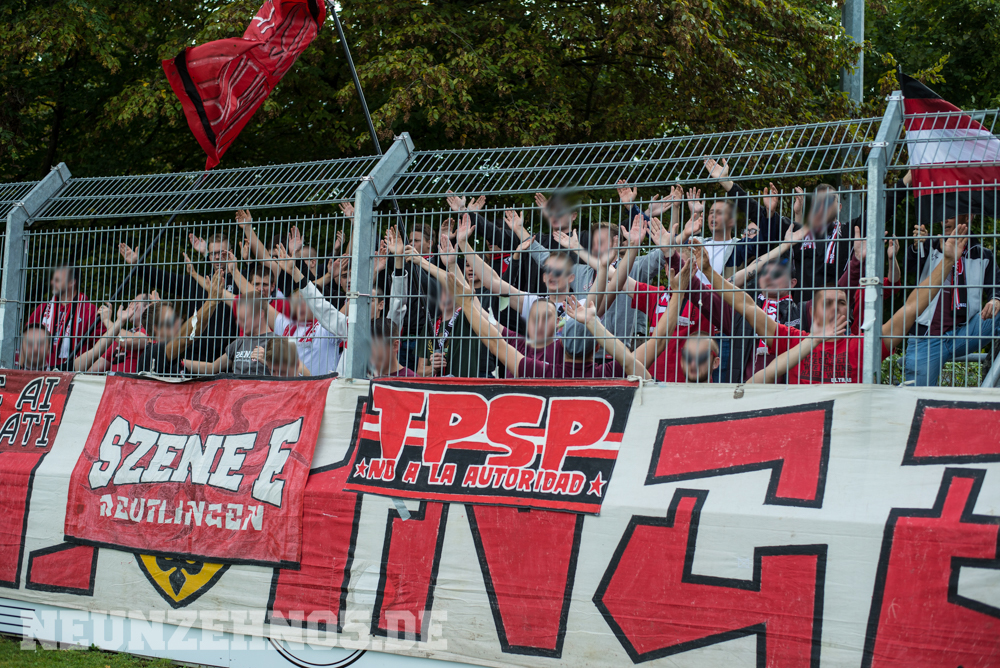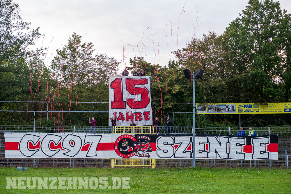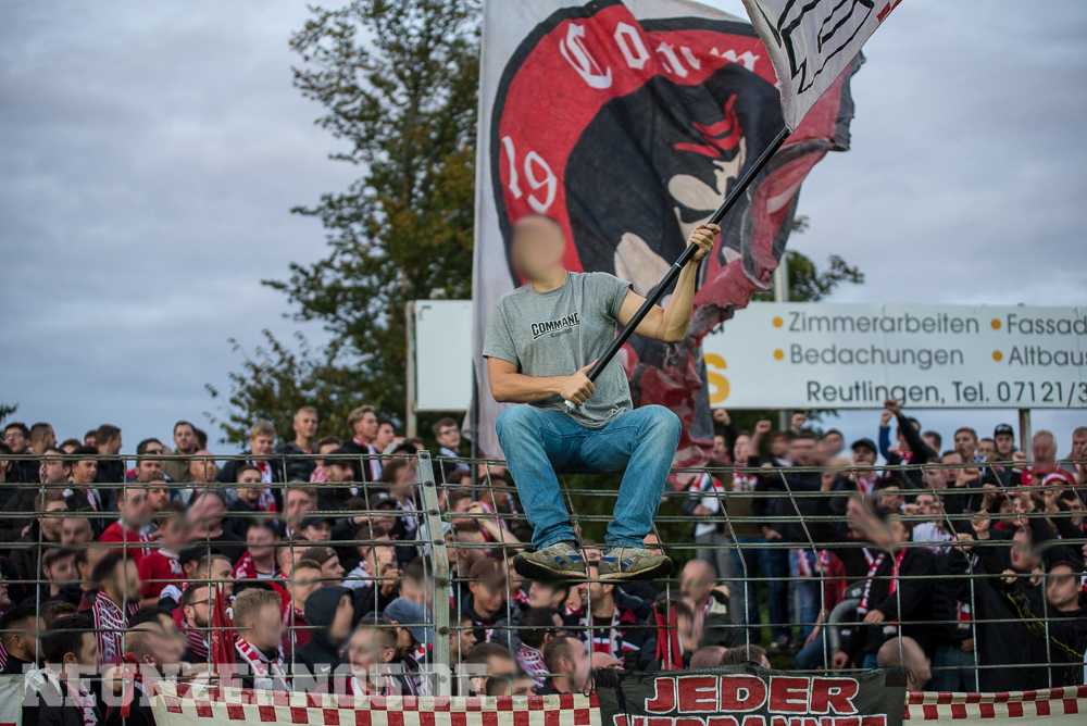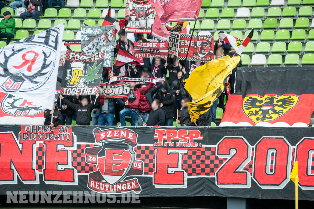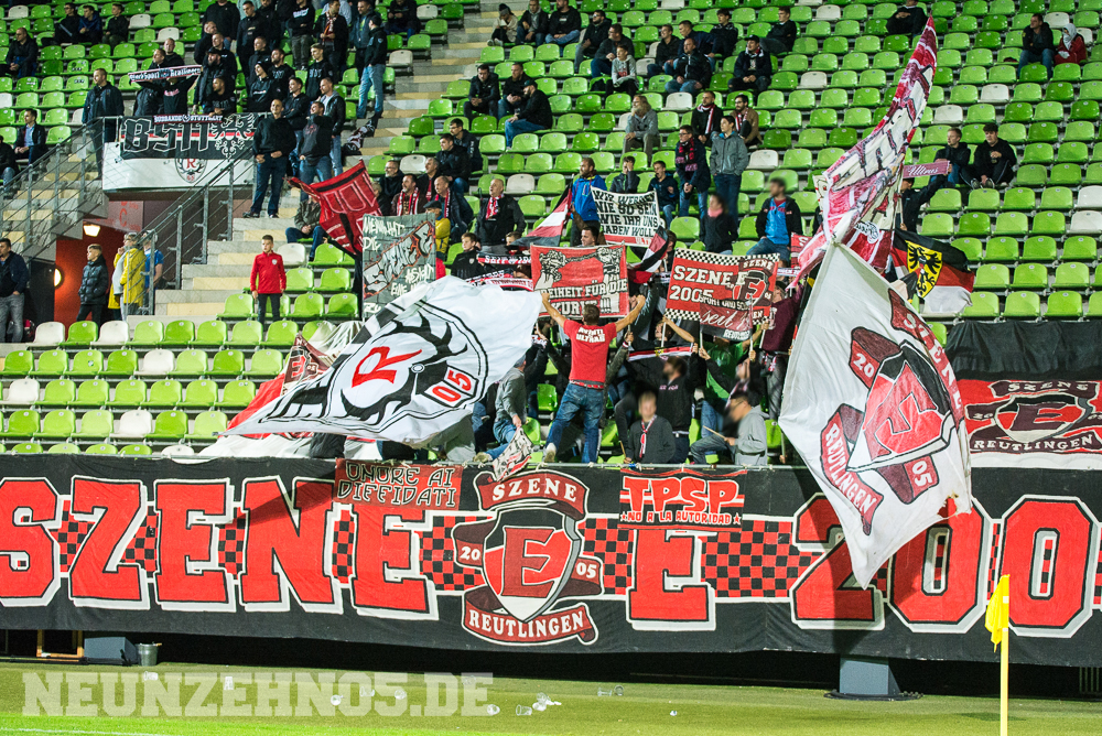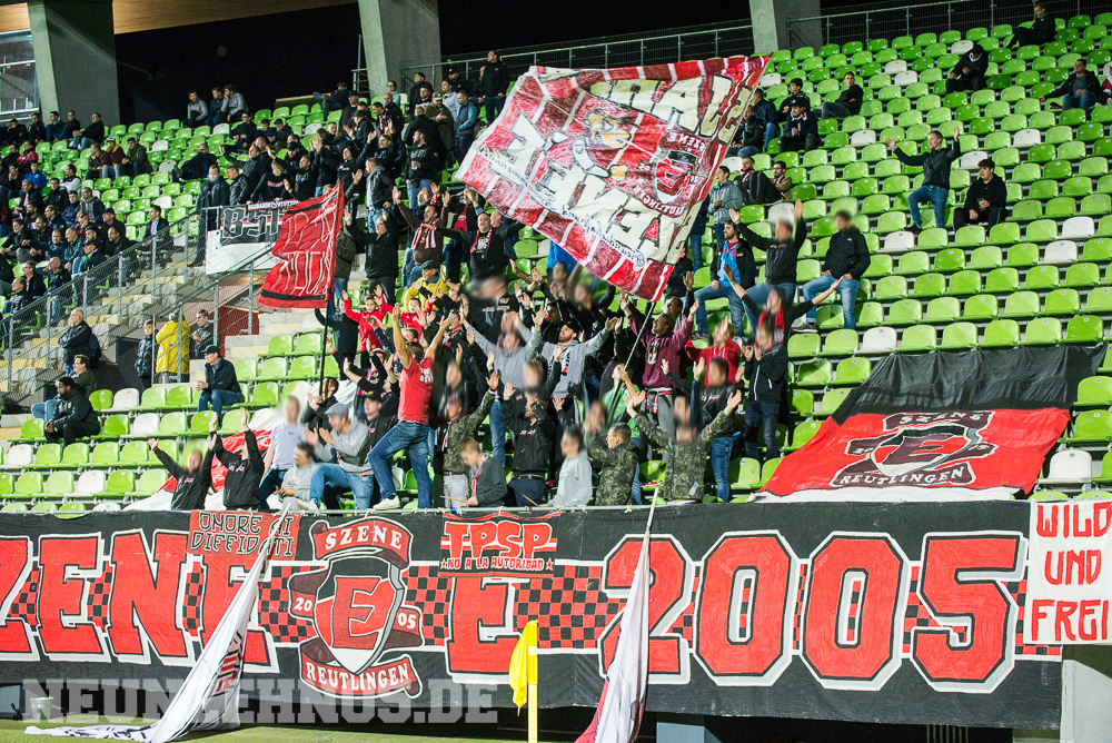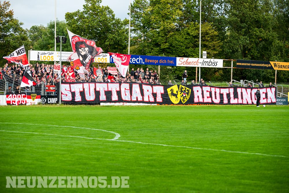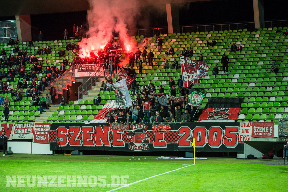 Nach längerem Hin und Her, Spielabsagen und Verschiebungen durfte unser SSV endlich gegen die Zweitvertretung des VfB Stuttgart antreten. Passend zu diesem Spieltag wurde unser 15-jähriges Freundschaftsjubiläum zum Commando Cannstatt gefeiert. Der etwas ungünstige Nachholtermin unter der Woche dürfte wohl auf beiden Seiten den ein oder anderen Sangesfreudigen Gesellen gekostet haben — dennoch fanden sich insgesamt 1.600 Zuschauer an der Kreuzeiche ein. Zum Aufwärmen trug unsere Mannschaft gesprayte Shirts auf denen der Buddy und unser Gruppenlogo abgebildet waren, zudem zogen wir zwei Überhänger unserer Gruppen auf die Leinwand unseres Stadions und im Block E passten wir die Blockbegrenzungen dem Anlass entsprechend an. In der Kurve wurde ein paar Minuten nach Anpfifft ein Jubiläumsbanner entrollt das noch mit ein paar Shootern untermalt wurde, die aber leider nur schwach zur Geltung kamen. Unsere Freunde im Block IV untermalten ihr Intro mit einem satten Stuttgart-Reutlingen Spruchband, das in der Mitte noch die Wappen unserer Städte abbildete. Der Führungstreffer in der zweiten Minute durch Onesi fungierte sicherlich als Aufschwungshelfer für den Support und der Torjubel ließ sich gut ansehen, zwar gab es gute zehn Minuten später den Ausgleich zu bestaunen, aber das interessierte im Großen und Ganzen nicht mehr. Mit dem Dach begünstigt drehte der Block E bei dem ein oder anderen Lied ganz gut frei und ließ den anderen stimmungsvollen Durchhänger verschmerzen. Unsere Freunde im Block IV konnten wir immer wieder, untermalt von starken Hüpfeinlagen, akustisch gut vernehmen. Der Spaßfaktor war auf jeden Fall gegeben und die Freundschaft wurde auf ehrliche Weise mit unseren gemeinsamen Gesängen untermalt.