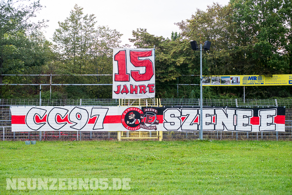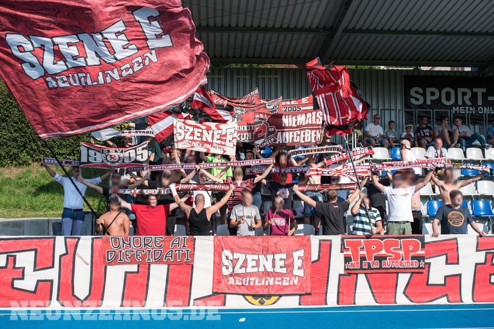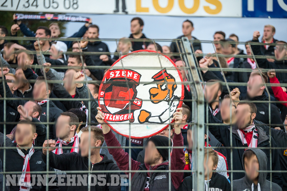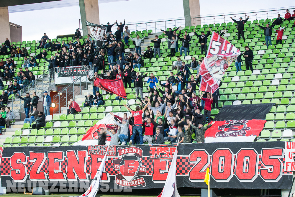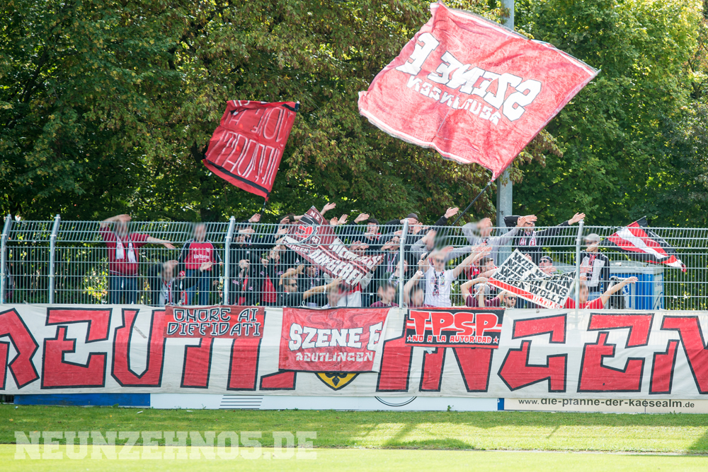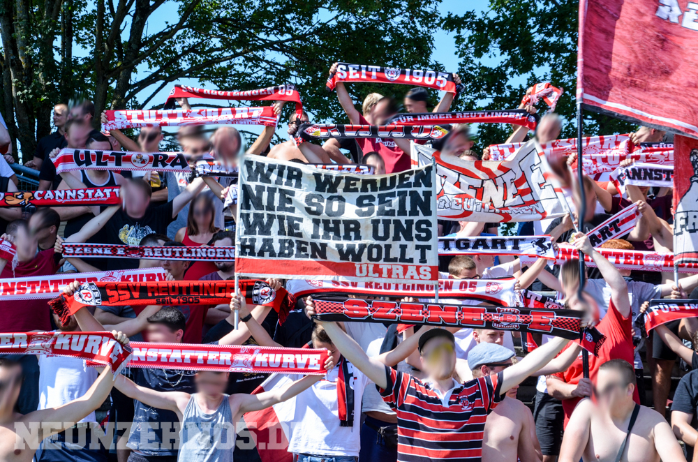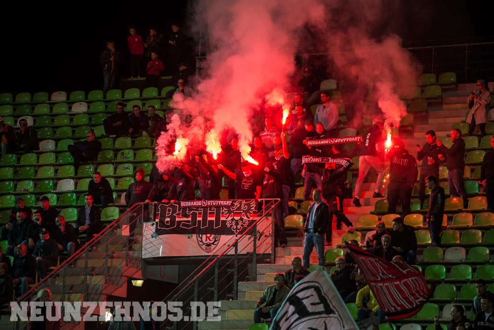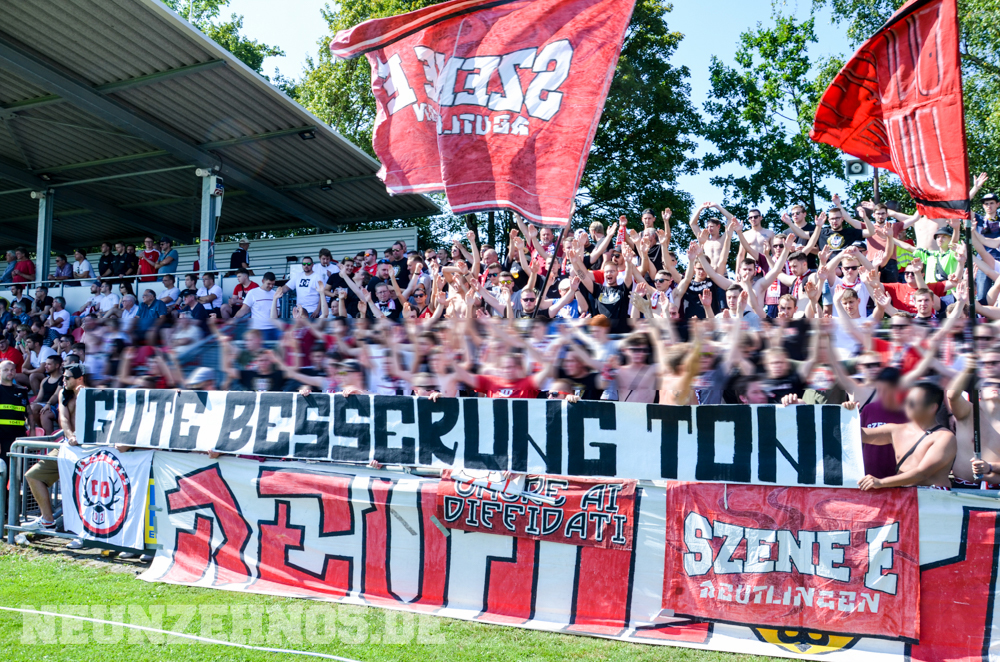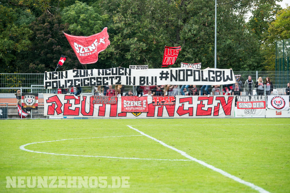 Nach längerem Hin und Her, Spielabsagen und Verschiebungen durfte unser SSV endlich gegen die Zweitvertretung des VfB Stuttgart antreten. Passend zu diesem Spieltag wurde unser 15-jähriges Freundschaftsjubiläum zum Commando Cannstatt gefeiert. Der etwas ungünstige Nachholtermin unter der Woche dürfte wohl auf beiden Seiten den ein oder anderen Sangesfreudigen Gesellen gekostet haben — dennoch fanden sich insgesamt 1.600 Zuschauer an der Kreuzeiche ein. Zum Aufwärmen trug unsere Mannschaft gesprayte Shirts auf denen der Buddy und unser Gruppenlogo abgebildet waren, zudem zogen wir zwei Überhänger unserer Gruppen auf die Leinwand unseres Stadions und im Block E passten wir die Blockbegrenzungen dem Anlass entsprechend an. In der Kurve wurde ein paar Minuten nach Anpfifft ein Jubiläumsbanner entrollt das noch mit ein paar Shootern untermalt wurde, die aber leider nur schwach zur Geltung kamen. Unsere Freunde im Block IV untermalten ihr Intro mit einem satten Stuttgart-Reutlingen Spruchband, das in der Mitte noch die Wappen unserer Städte abbildete. Der Führungstreffer in der zweiten Minute durch Onesi fungierte sicherlich als Aufschwungshelfer für den Support und der Torjubel ließ sich gut ansehen, zwar gab es gute zehn Minuten später den Ausgleich zu bestaunen, aber das interessierte im Großen und Ganzen nicht mehr. Mit dem Dach begünstigt drehte der Block E bei dem ein oder anderen Lied ganz gut frei und ließ den anderen stimmungsvollen Durchhänger verschmerzen. Unsere Freunde im Block IV konnten wir immer wieder, untermalt von starken Hüpfeinlagen, akustisch gut vernehmen. Der Spaßfaktor war auf jeden Fall gegeben und die Freundschaft wurde auf ehrliche Weise mit unseren gemeinsamen Gesängen untermalt.