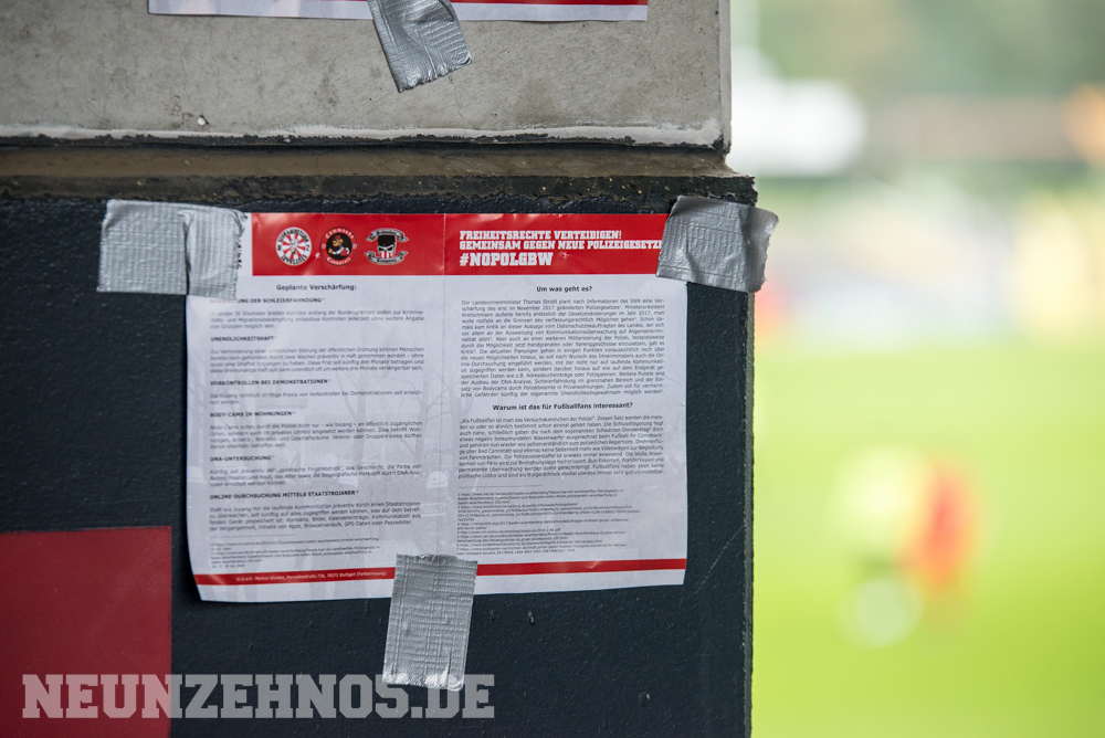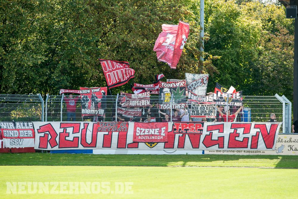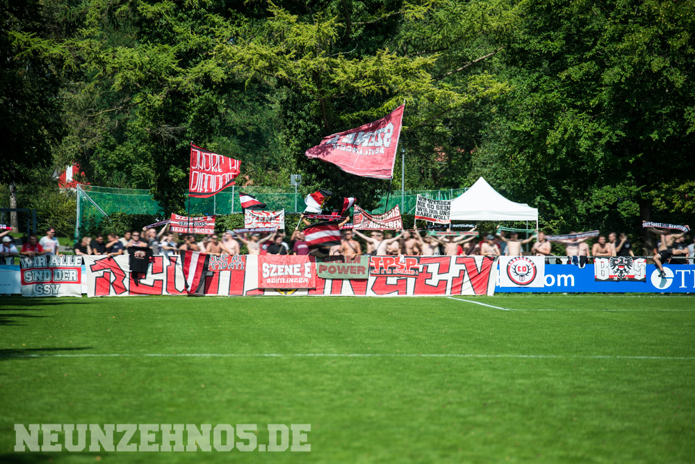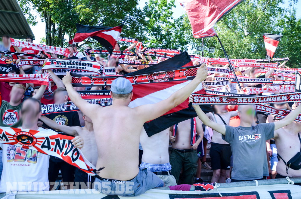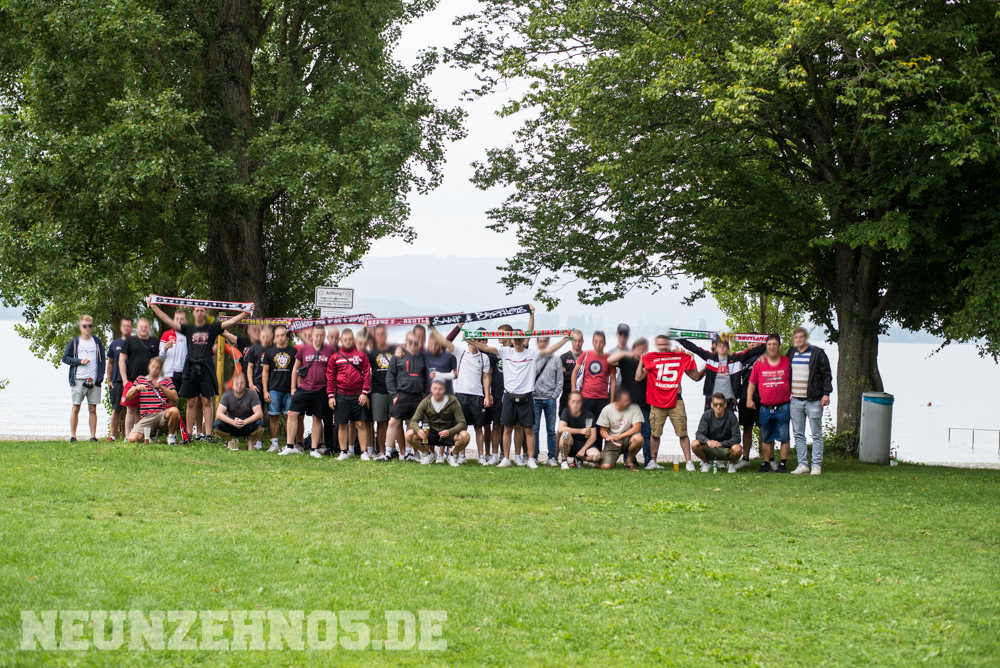 Den famosen Namen Rielasingen-Arlen trug unser Gegner an diesem Tage. Noch nie gehört? Dann seid ihr nicht allein. Rielasingen liegt ganz im Süden unseres Bundeslandes und damit in nächster Nähe zum Bodensee. Dies galt es zu nutzen und dementsprechend früh waren wir in einem Strandbad, um dort den Tag bis zum Spielbeginn zu verbringen. Einzig die Temperaturen wollten noch nicht so richtig mitmachen, doch die 22 Grad Wassertemperatur im Gegensatz zu 19 Grad an der Luft überzeugten dann doch über kurz oder lang die meisten davon, noch ne Runde zu schwimmen. Feinstes Strandbad-Essen und die kurzerhand eröffnete Friseurstube boten darüber hinaus Abwechslung. Der Gästeblock war heute gut gefüllt, auch durch einige Stuttgarter und Sankt Galler Freunde, die uns heute begleiteten. Auch sonst war viel los im sogenannten „Stadion“, das dann doch eher ein besserer Dorfplatz mit einseitiger Holzüberdachung war. Im Vorfeld hatte Rielasingen mächtig die Werbetrommel gerührt, sogar einen Vorverkauf gab es. Tatsächlich war Ende vergangener Saison der Platz einmal ausverkauft mit 1.500 Zuschauern, die sich das vorletzte Spiel gegen Radolfszell ansahen. Ganz so viele waren es heute nicht, aber mit über 1.000 Zuschauern dann doch deutlich mehr als der gewöhnliche Oberliga-Schnitt. Sportlich gab es nichts zu holen und unsere Mannschaft ging sang und klanglos mit 2:0 unter.
