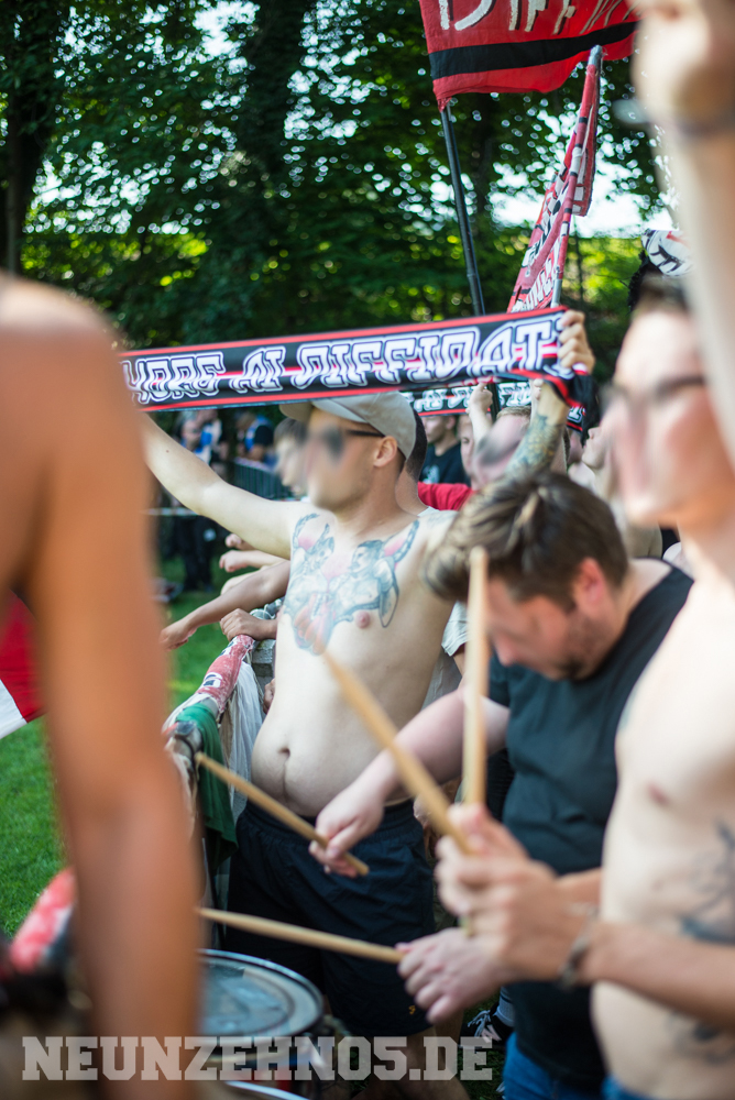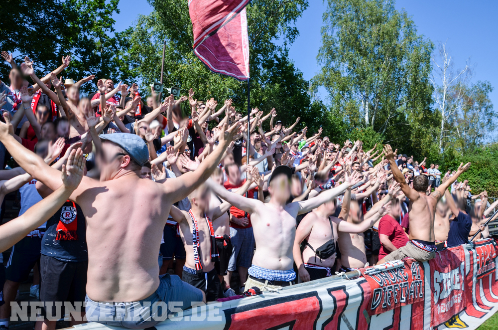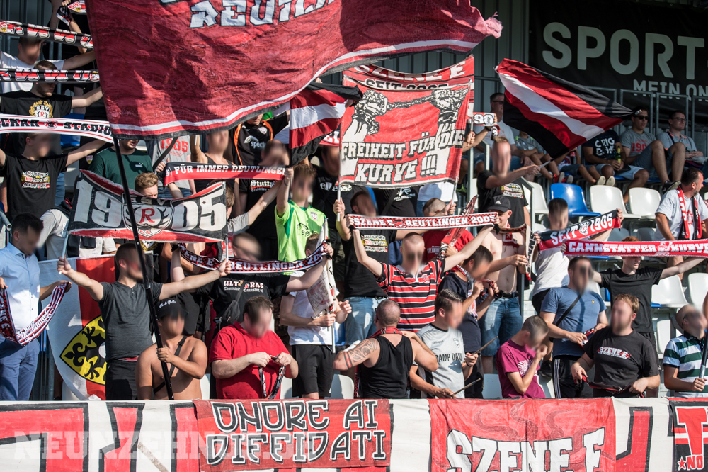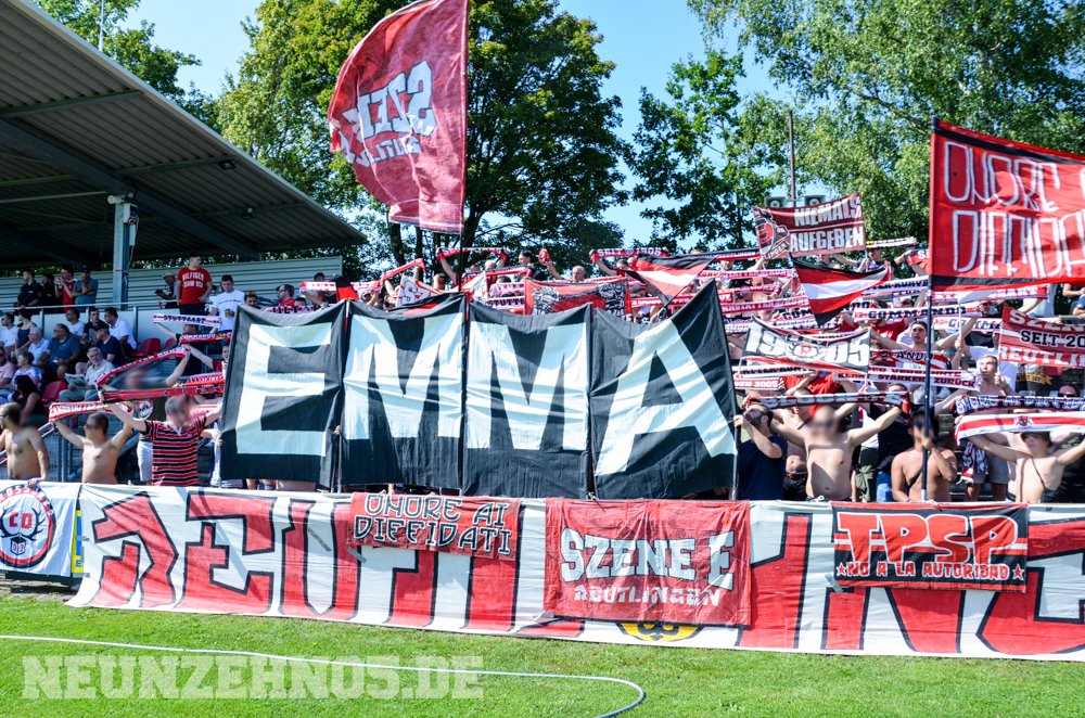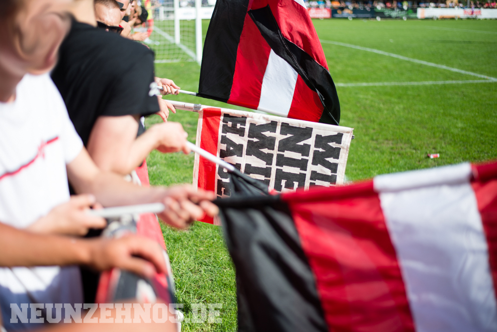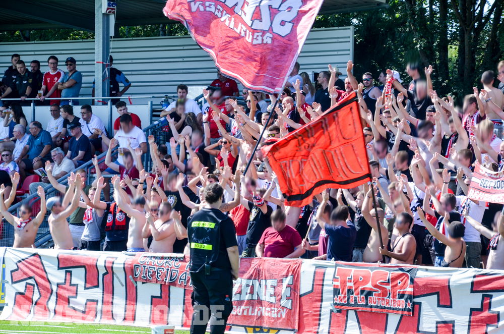 Den famosen Namen Rielasingen-Arlen trug unser Gegner an diesem Tage. Noch nie gehört? Dann seid ihr nicht allein. Rielasingen liegt ganz im Süden unseres Bundeslandes und damit in nächster Nähe zum Bodensee. Dies galt es zu nutzen und dementsprechend früh waren wir in einem Strandbad, um dort den Tag bis zum Spielbeginn zu verbringen. Einzig die Temperaturen wollten noch nicht so richtig mitmachen, doch die 22 Grad Wassertemperatur im Gegensatz zu 19 Grad an der Luft überzeugten dann doch über kurz oder lang die meisten davon, noch ne Runde zu schwimmen. Feinstes Strandbad-Essen und die kurzerhand eröffnete Friseurstube boten darüber hinaus Abwechslung. Der Gästeblock war heute gut gefüllt, auch durch einige Stuttgarter und Sankt Galler Freunde, die uns heute begleiteten. Auch sonst war viel los im sogenannten „Stadion“, das dann doch eher ein besserer Dorfplatz mit einseitiger Holzüberdachung war. Im Vorfeld hatte Rielasingen mächtig die Werbetrommel gerührt, sogar einen Vorverkauf gab es. Tatsächlich war Ende vergangener Saison der Platz einmal ausverkauft mit 1.500 Zuschauern, die sich das vorletzte Spiel gegen Radolfszell ansahen. Ganz so viele waren es heute nicht, aber mit über 1.000 Zuschauern dann doch deutlich mehr als der gewöhnliche Oberliga-Schnitt. Sportlich gab es nichts zu holen und unsere Mannschaft ging sang und klanglos mit 2:0 unter.