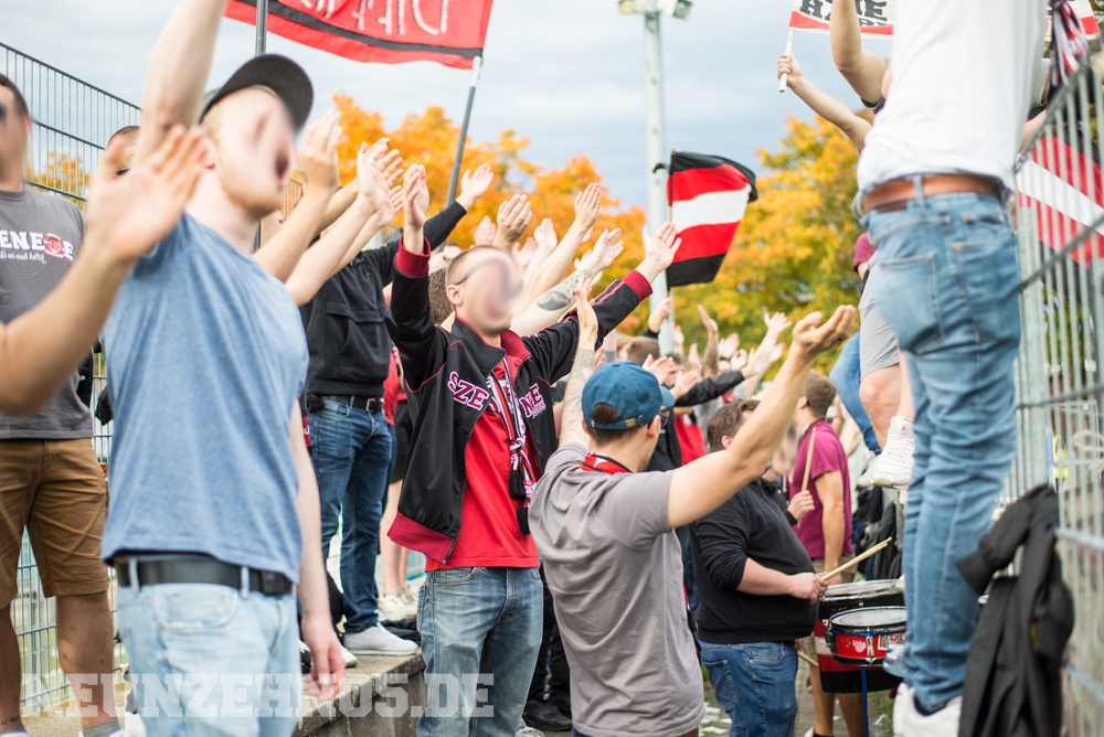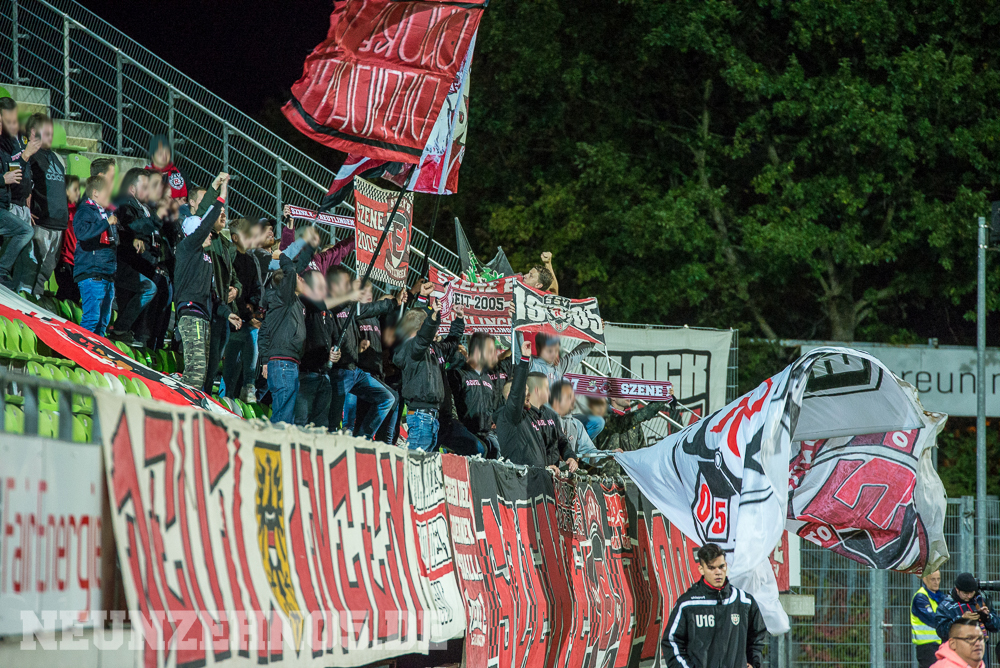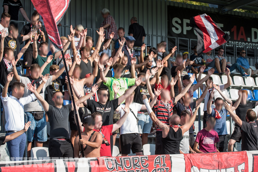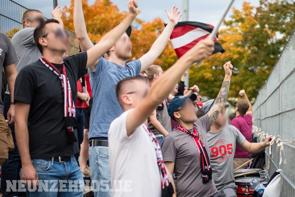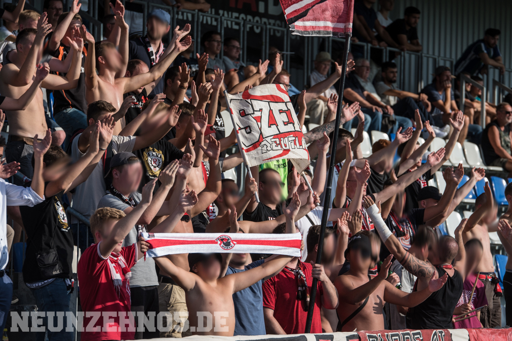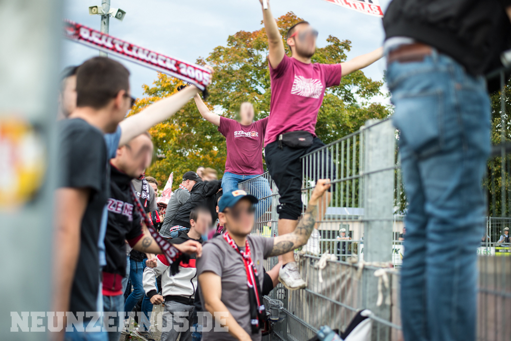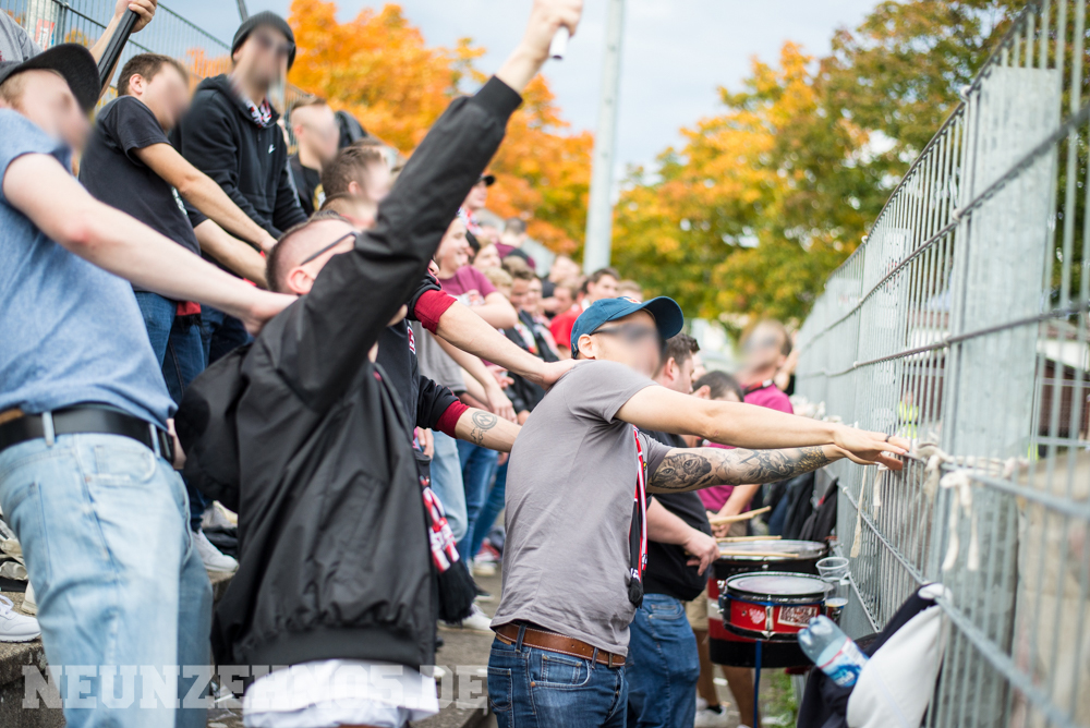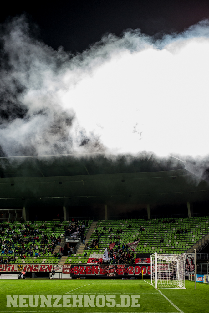 Während sich die Bullen heute im Hintergrund hielten, meinten die zwei Einsatzleiter des Ordnungsdienstes, den großen Max machen zu müssen: Alle Fahnen auspacken und zeigen, was draufsteht. Dementsprechend dauerte es, bis wir den Gästeblock betraten. Zum Spiel: Wir lieferten heute einen ziemlich satten Support ab. In Erinnerung blieb ein sehr geiles „Ale ale oh“ und das mal wieder aktuelle „Bei dir, selbst wenn du jedes Spiel verlierst“. Und damit nun wirklich zum Spiel: Das überzeugte leider gar nicht. Unseren Mannen sah man so dermaßen die Müdigkeit und Erschöpfung an, da halfen auch keine zwei Trinkpausen während des Spiels. Viel langsamer als der Gegner, kaum aggressiv, wenig bemüht in die Zweikämpfe zu gehen. Die vielen Ausfälle machen unserem Team doch arg zu schaffen und das schon am 5. Spieltag. So kam es, wie es kommen musste: Bereits in der 11. Minute lochte Göppingen das erste Mal ein. Sein Mitspieler winkte erst noch alle Spieler in Richtung Mitte zum Jubeln, doch Torschütze und einer unserer Lieblings-Arschlöcher Dicklhuber ließ es sich nicht nehmen, mal wieder offensichtlich vor uns zu Jubeln. Vielleicht standen deshalb die fünf Ordner während des gesamten Spiels in Reih und Glied vor unserem Block, auf den Zentimeter genau so, wie sie der bereits erwähnte Einsatzleiter positioniert hatte. Nach den 90 Minuten stand es 4:0 für die Falschen und damit ist alles zum Geschehen auf dem Rasen gesagt. Ganz im Gegensatz zu dem auf unseren Rängen. Bis über 40 Minuten nach Spielende wurde im Gästeblock voller Herzblut weitergesungen. Aus Trotz über die erneute Niederlage und aus dem puren Spaß, den der Support heute machte.