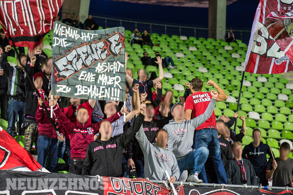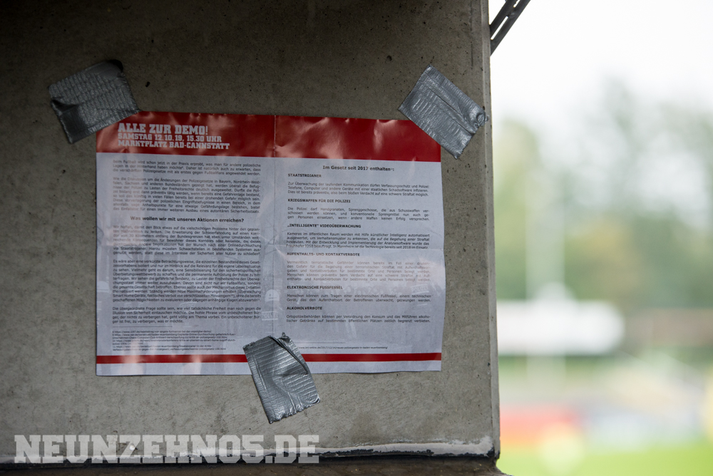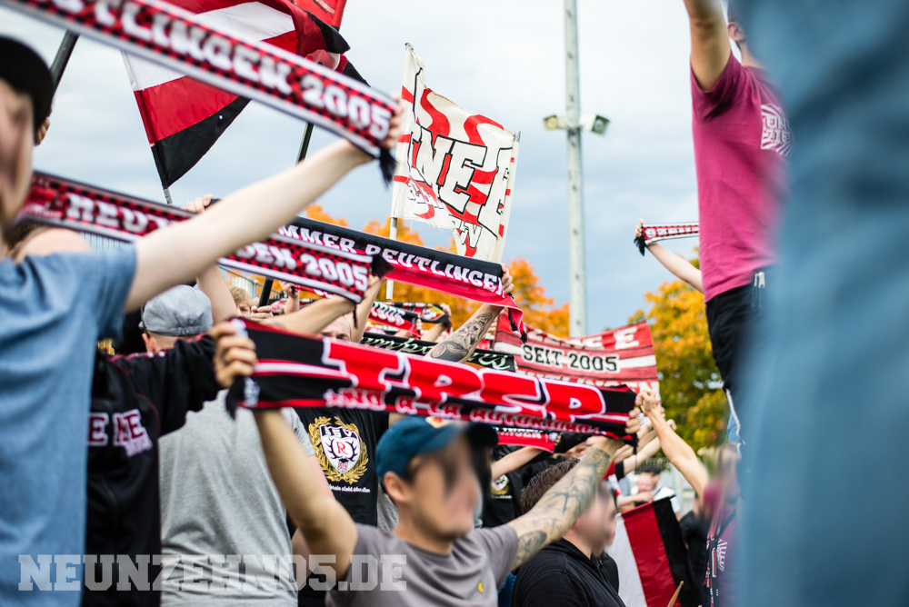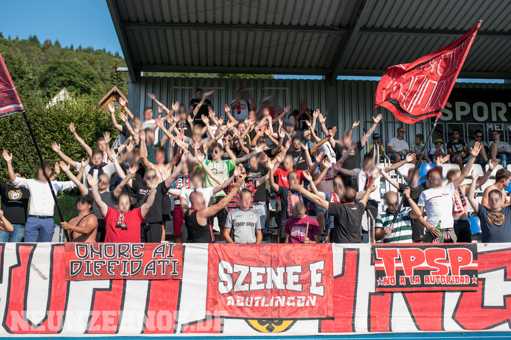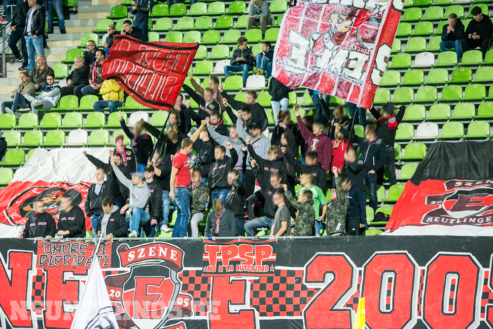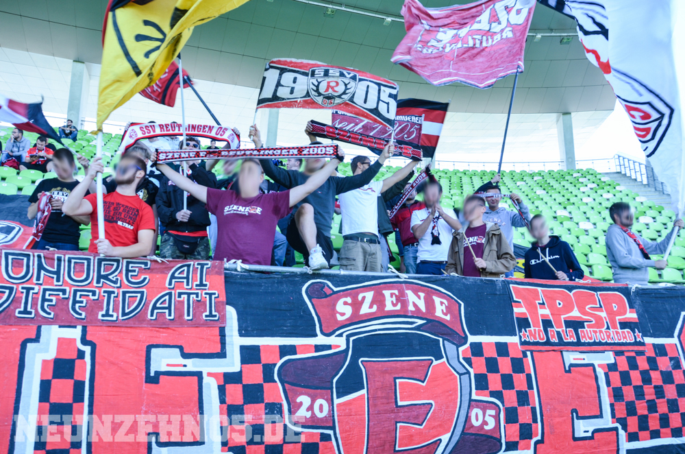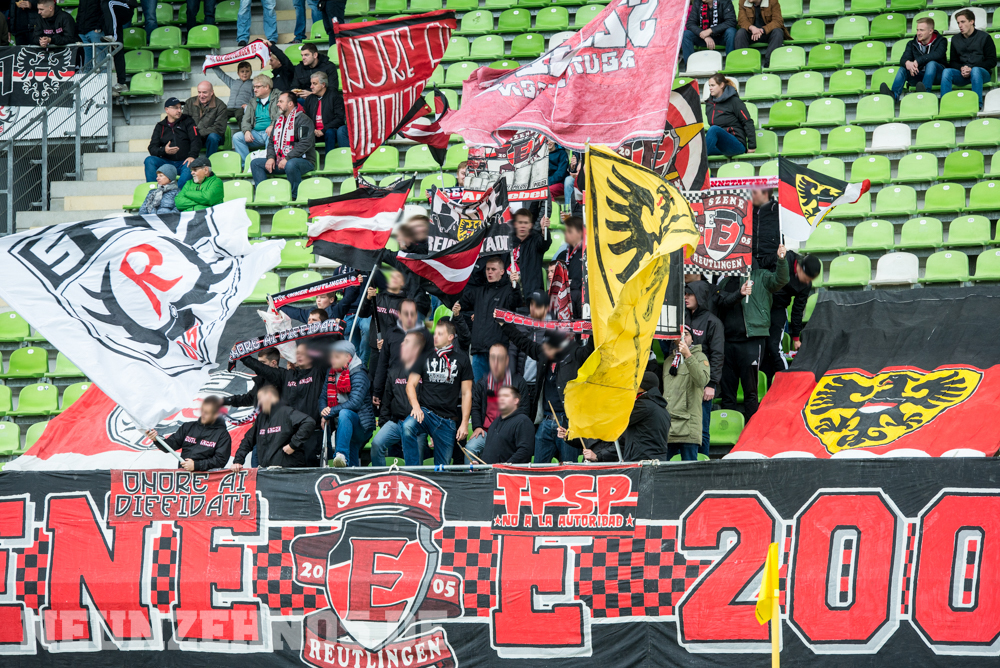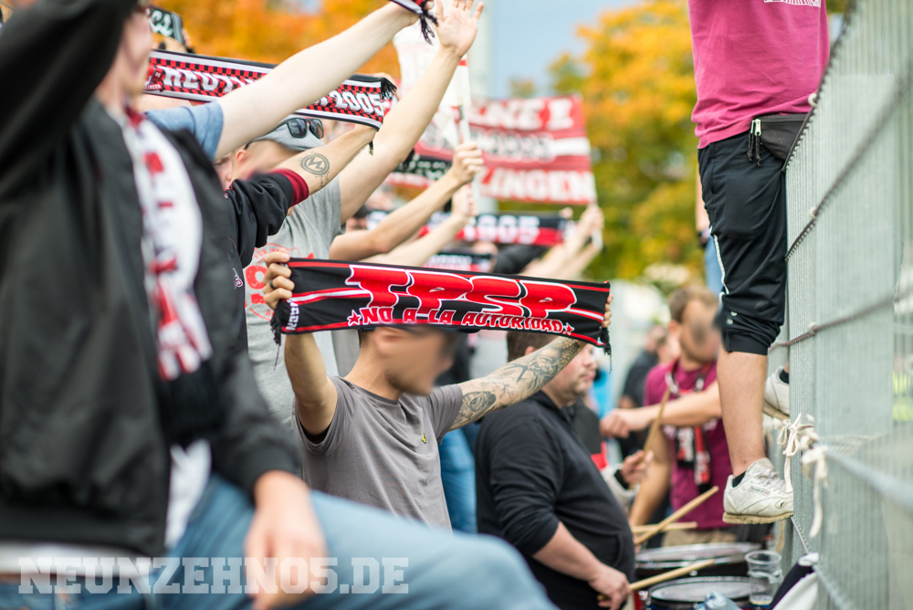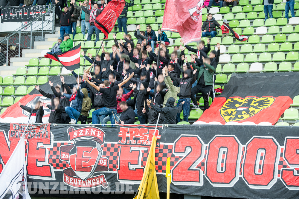 Der FV Ravensburg sollte eigentlich ein machbarer Gegner sein, um endlich mal auswärts das erste Mal zu punkten. Mit der soliden Leistung aus dem vergangenen Heimspiel, konnten wir relativ zuversichtlich sein, dass wir nicht wieder ohne Punkte heimfahren müssen. Eine knappe Stunde vor Anpfiff mussten wir unsere Stadionverbotler vor den Toren verabschieden und machten uns auf den Weg in den Gästeblock. Zum Anpfiff des Spiels zelebrierten wir ein ordentliches Intro. In der 10. Minute wurde vor dem Gästeblock ein Spruchband präsentiert mit der Aufschrift „Trotzdem immer a Fackle die Hand! EBSG“. Hintergrund des Spruchbands: Alle Gruppen des Espenblocks wollten an diesem Tag ein Statement setzen und supporteten ihr eigenes Spiel nur vor Anpfiff beim Aufwärmen der Mannschaft. Unserer Brüder aus Sankt Gallen haben zurzeit mit Repressionen zu kämpfen, aufgrund der Pyroeinlagen zum 10 Jahre Saint Brothers. Zum Spiel an sich gibt’s nicht allzu viel zu sagen, magerer Fußball mit wenig Torabschlüssen. Mit 1:0 für Ravensburg ging es in die Pause. In der zweiten Hälfte erhöhten die Ravensburger dann noch auf 2:0. Wieder keine Punkte auswärts und bis jetzt kein einziges Auswärtstor.
