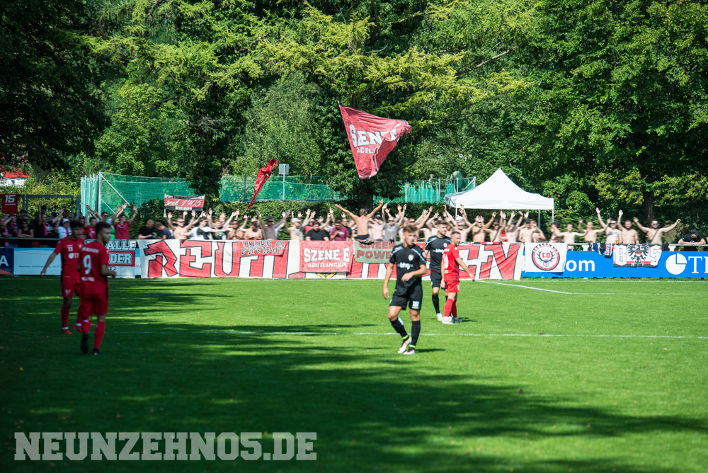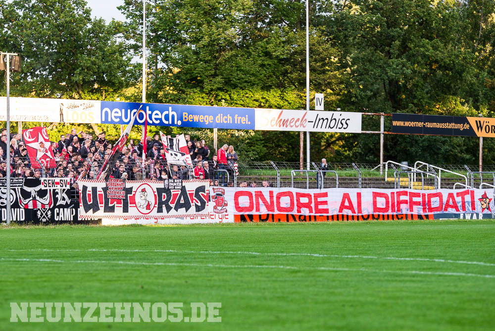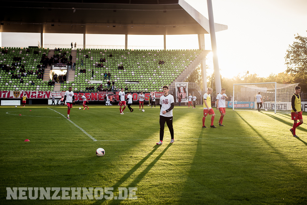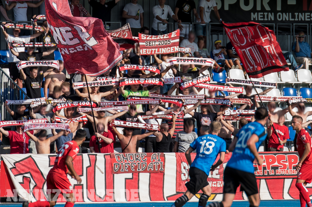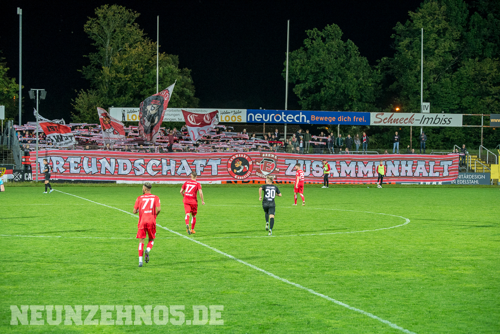 Zur ganz starken Uhrzeit um 17:15 Uhr an einem Mittwoch lud der Pokalkracher gegen Nagold ein. Das hieß für unsereins: Früher Feierabend machen, um rechtzeitig losfahren zu können. In Nagold war das dann leider eine schwache fußballerische Leistung. Dabei ging unsere Mannschaft in der ersten Halbzeit noch zwischenzeitlich durch Methner in Führung, gab diese aber nach nur wenigen Minuten wieder ab. Also wieder alles offen, ein Selbstläufer sollte das nicht werden. Wir hatten uns unterdessen auf der schmucken kleinen Tribüne auf der Gegengeraden positioniert, was ohne Bullen und Ordner sehr entspannt funktionierte. Allerdings gelang es uns nicht, diesen satten Standort in eine gute Lautstärke umzumünzen. Nach der Halbzeitpause ging gar nichts mehr bei unserem Team. Je länger das Spiel ging, desto schwächer wurde in die Zweikämpfe gegangen. Dazu muss gesagt werden, dass unsere Elf derzeit verletzungsbedingt sehr ausgedünnt ist. Tröstet einen aber nur bedingt, wenn man gegen einen 7.-Ligisten rausfliegt. Wir setzen nach dem 2:1 noch unser eigenes Highlight mit einem sehr starken „Stimm mit ein“, aber spätestens nach einem weiteren Beinahe-Gegentor war dann die Luft draußen. In der 94. Minute fiel dann noch das 3:1, womit das Aus im Pokal endgültig feststand.