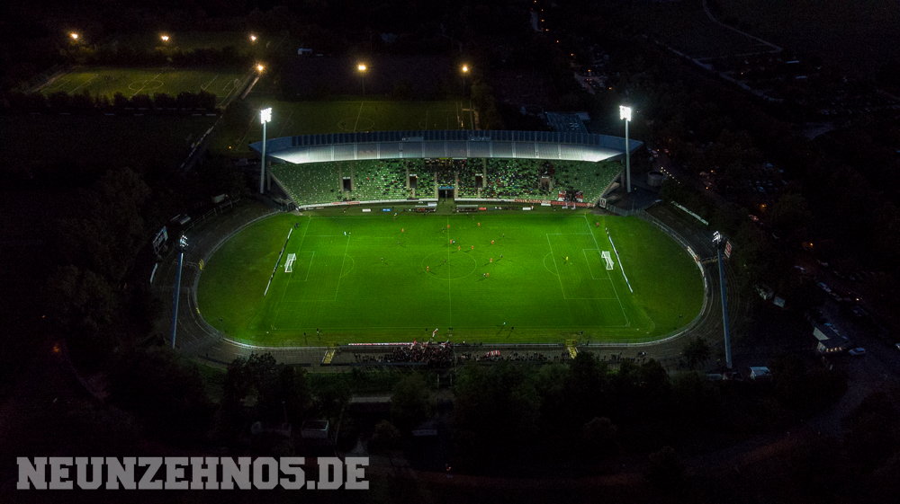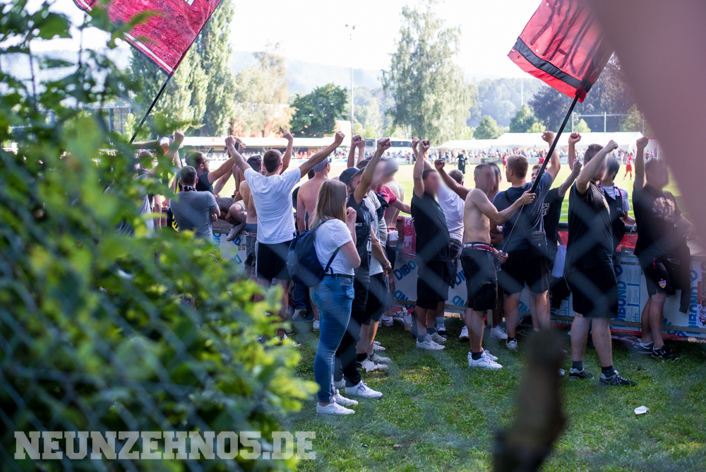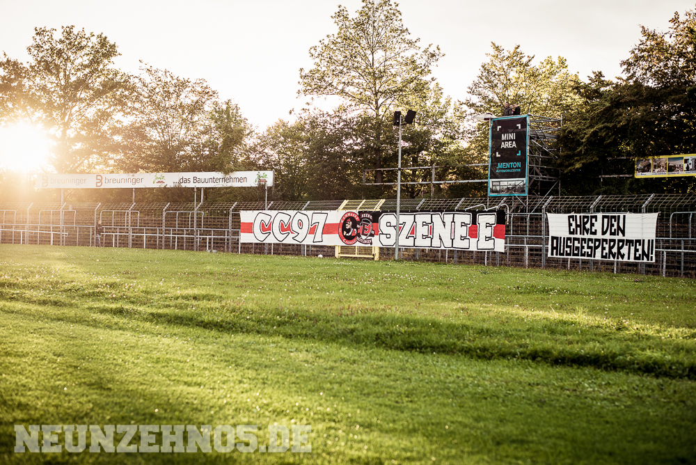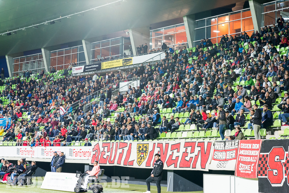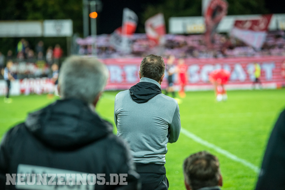 Zur ganz starken Uhrzeit um 17:15 Uhr an einem Mittwoch lud der Pokalkracher gegen Nagold ein. Das hieß für unsereins: Früher Feierabend machen, um rechtzeitig losfahren zu können. In Nagold war das dann leider eine schwache fußballerische Leistung. Dabei ging unsere Mannschaft in der ersten Halbzeit noch zwischenzeitlich durch Methner in Führung, gab diese aber nach nur wenigen Minuten wieder ab. Also wieder alles offen, ein Selbstläufer sollte das nicht werden. Wir hatten uns unterdessen auf der schmucken kleinen Tribüne auf der Gegengeraden positioniert, was ohne Bullen und Ordner sehr entspannt funktionierte. Allerdings gelang es uns nicht, diesen satten Standort in eine gute Lautstärke umzumünzen. Nach der Halbzeitpause ging gar nichts mehr bei unserem Team. Je länger das Spiel ging, desto schwächer wurde in die Zweikämpfe gegangen. Dazu muss gesagt werden, dass unsere Elf derzeit verletzungsbedingt sehr ausgedünnt ist. Tröstet einen aber nur bedingt, wenn man gegen einen 7.-Ligisten rausfliegt. Wir setzen nach dem 2:1 noch unser eigenes Highlight mit einem sehr starken „Stimm mit ein“, aber spätestens nach einem weiteren Beinahe-Gegentor war dann die Luft draußen. In der 94. Minute fiel dann noch das 3:1, womit das Aus im Pokal endgültig feststand.