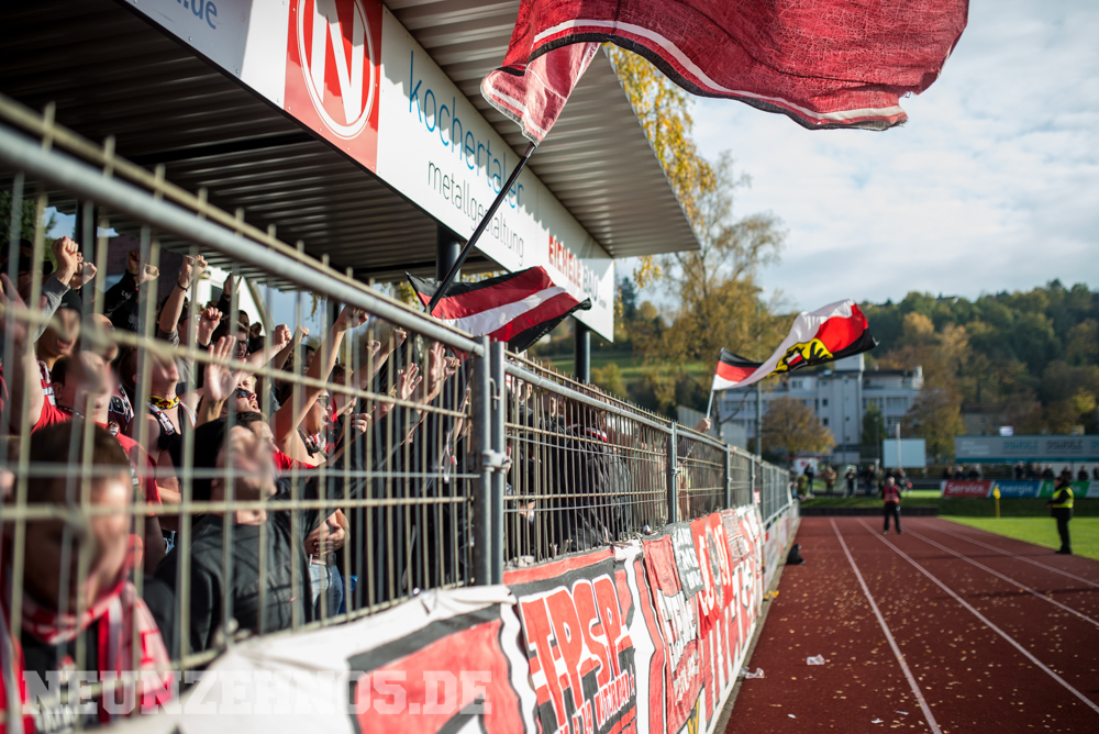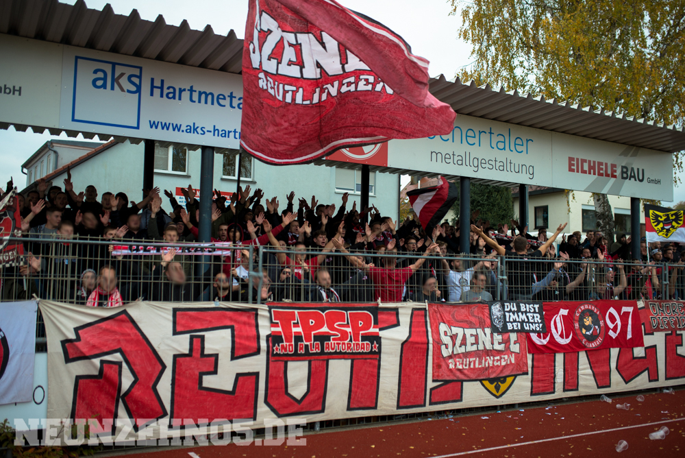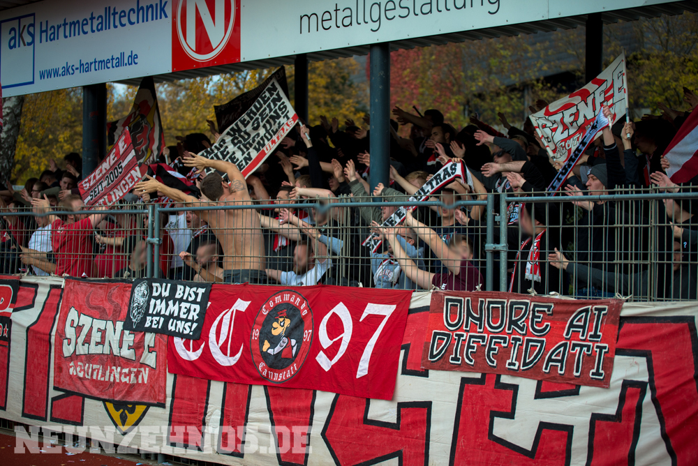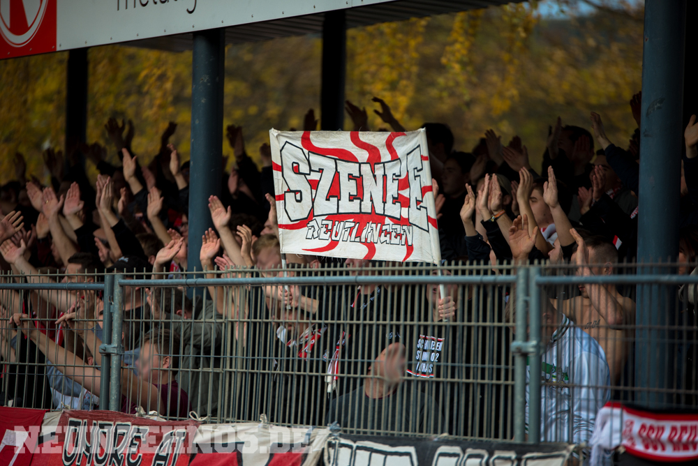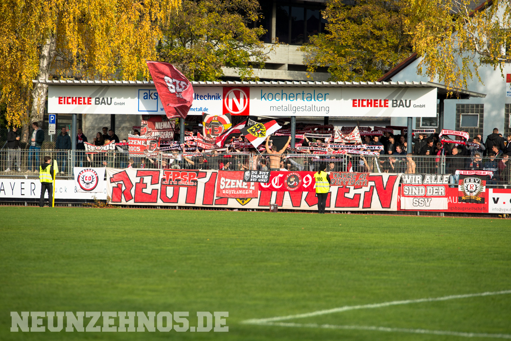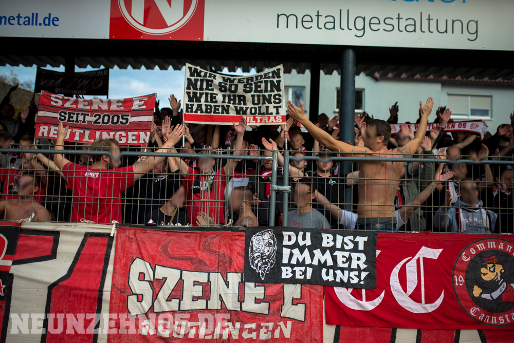gab es dann ein sattes Empfangskomitee vom Commando Cannstatt und ein gemeinsamer Zwischenstopp in einer Kneipe. Später in Gmünd angekommen, legten wir die restliche Wegstrecke zu Fuß zum Stadion zurück. Begleitet von einem hohen Bullenaufgebot erreichten wir den ebenfalls personalintensiv gesicherten Gästeblock. Im Nachhinein waren sowohl Bullen als auch Ordner entweder im Hintergrund, oder entspannt bis kooperativ, jedoch kennen wir ja genug Gegenbeispiele. Je mehr aufgerüstet wird, desto höher die Wahrscheinlichkeit, dass einer ne kurze Zündschnur hat und loslegt. Die fast 7000€ Mehrkosten für Normannia Gmünd, mal ganz aussen vorgelassen. Aber die Vereine verstecken sich ja leider immer noch alle hinter Polizeiprognosen und Vorgaben vom Verband. Trotzdem, damits nicht unerwähnt bleibt, heut wars ok. Im Gästeblock dann etliche weitere Reutlinger, Sankt Galler und Stuttgarter, ein kleines Wellblechdach, zwei gut aufgelegte Anheizer und last but not least, die Hoffnung auf einen weiteren Sieg. Wir auf den Rängen starteten auch wirklich stark in die Partie. Eine hohe Mitmachquote im gesamten Gästeblock schraubten die Dezibel ordentlich nach oben. Auch über die 90 Minuten gesehen blieb der Support auf konstant hohem Niveau. Ein Auftritt auf den wir zufrieden zurückschauen können. Das Spiel fetzte leider nur bedingt und trotz 1:0 Vorsprung für unsere Mannen, kamen wir nie so richtig in Tritt. Gmünd stellte sich als motivierter und unbequemer Gegner heraus. So wurden wir in der 82. Minute auch von (wem auch sonst) Ex-Kapitän Bobo Mayer von der Siegstraße geholt. Anrechnen möchte ich ihm die entschuldigenden Gesten Richtung unserem Block. Brachte uns nur leider trotzdem um zwei weitere Punkte.