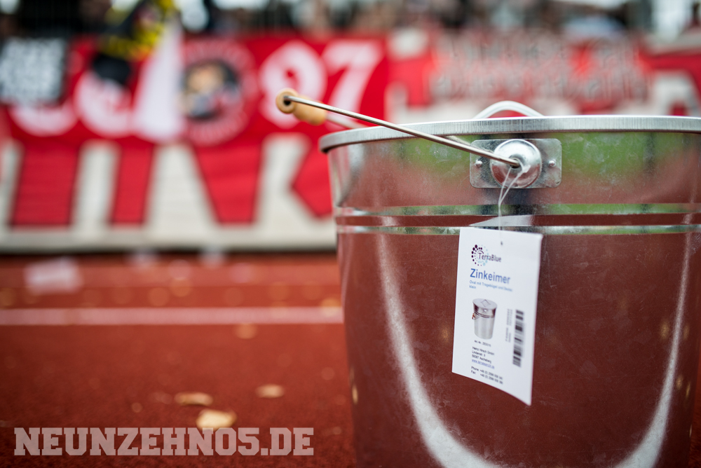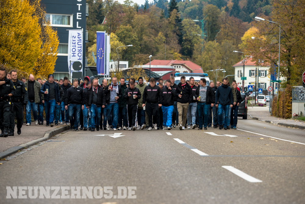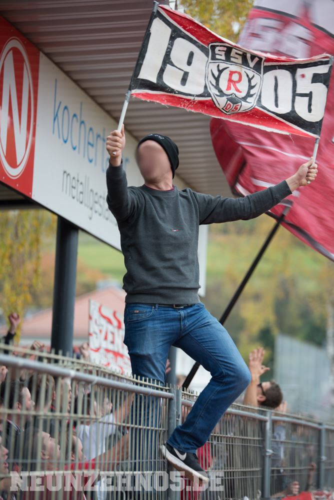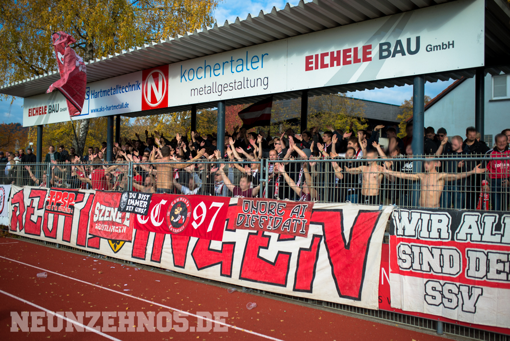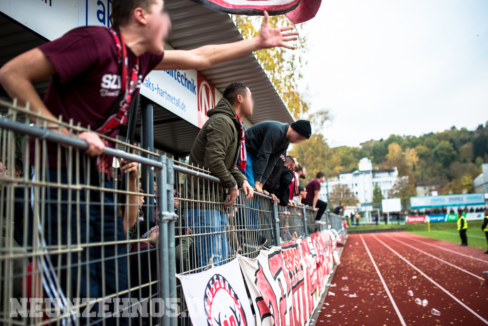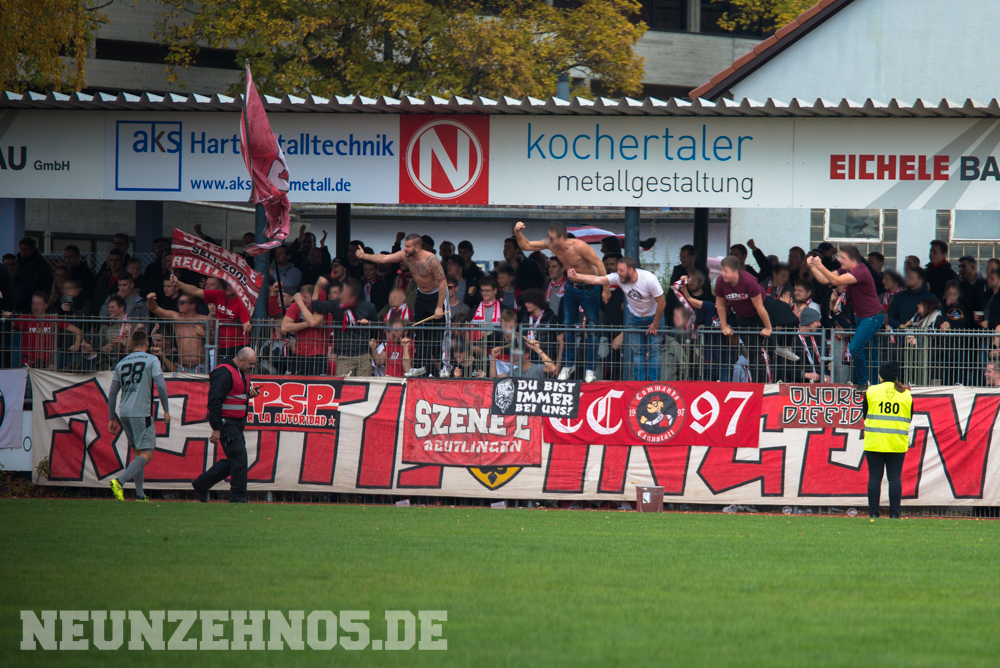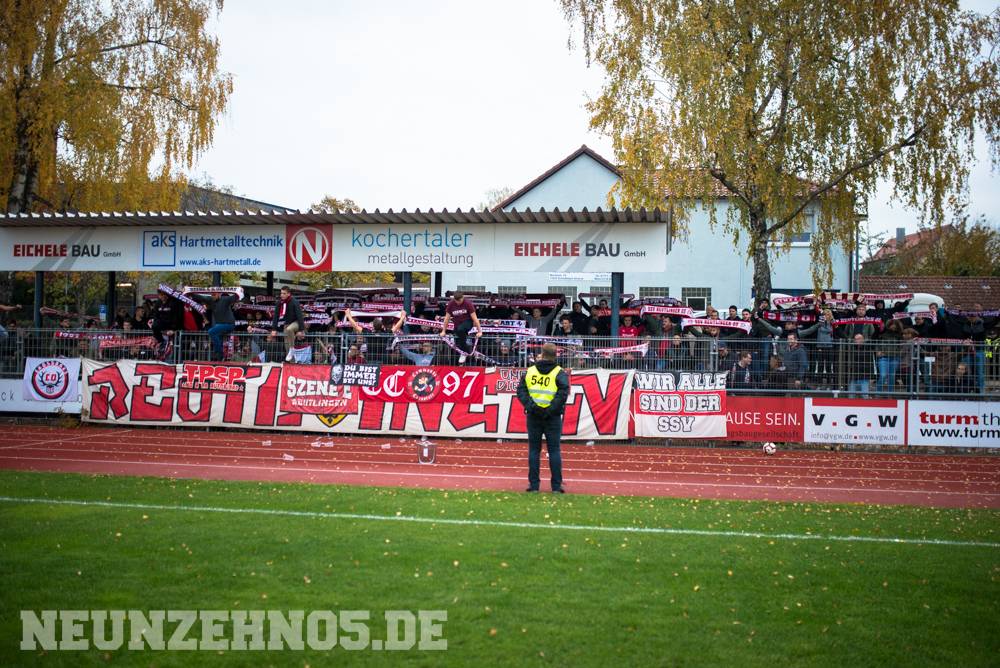 gab es dann ein sattes Empfangskomitee vom Commando Cannstatt und ein gemeinsamer Zwischenstopp in einer Kneipe. Später in Gmünd angekommen, legten wir die restliche Wegstrecke zu Fuß zum Stadion zurück. Begleitet von einem hohen Bullenaufgebot erreichten wir den ebenfalls personalintensiv gesicherten Gästeblock. Im Nachhinein waren sowohl Bullen als auch Ordner entweder im Hintergrund, oder entspannt bis kooperativ, jedoch kennen wir ja genug Gegenbeispiele. Je mehr aufgerüstet wird, desto höher die Wahrscheinlichkeit, dass einer ne kurze Zündschnur hat und loslegt. Die fast 7000€ Mehrkosten für Normannia Gmünd, mal ganz aussen vorgelassen. Aber die Vereine verstecken sich ja leider immer noch alle hinter Polizeiprognosen und Vorgaben vom Verband. Trotzdem, damits nicht unerwähnt bleibt, heut wars ok. Im Gästeblock dann etliche weitere Reutlinger, Sankt Galler und Stuttgarter, ein kleines Wellblechdach, zwei gut aufgelegte Anheizer und last but not least, die Hoffnung auf einen weiteren Sieg. Wir auf den Rängen starteten auch wirklich stark in die Partie. Eine hohe Mitmachquote im gesamten Gästeblock schraubten die Dezibel ordentlich nach oben. Auch über die 90 Minuten gesehen blieb der Support auf konstant hohem Niveau. Ein Auftritt auf den wir zufrieden zurückschauen können. Das Spiel fetzte leider nur bedingt und trotz 1:0 Vorsprung für unsere Mannen, kamen wir nie so richtig in Tritt. Gmünd stellte sich als motivierter und unbequemer Gegner heraus. So wurden wir in der 82. Minute auch von (wem auch sonst) Ex-Kapitän Bobo Mayer von der Siegstraße geholt. Anrechnen möchte ich ihm die entschuldigenden Gesten Richtung unserem Block. Brachte uns nur leider trotzdem um zwei weitere Punkte.