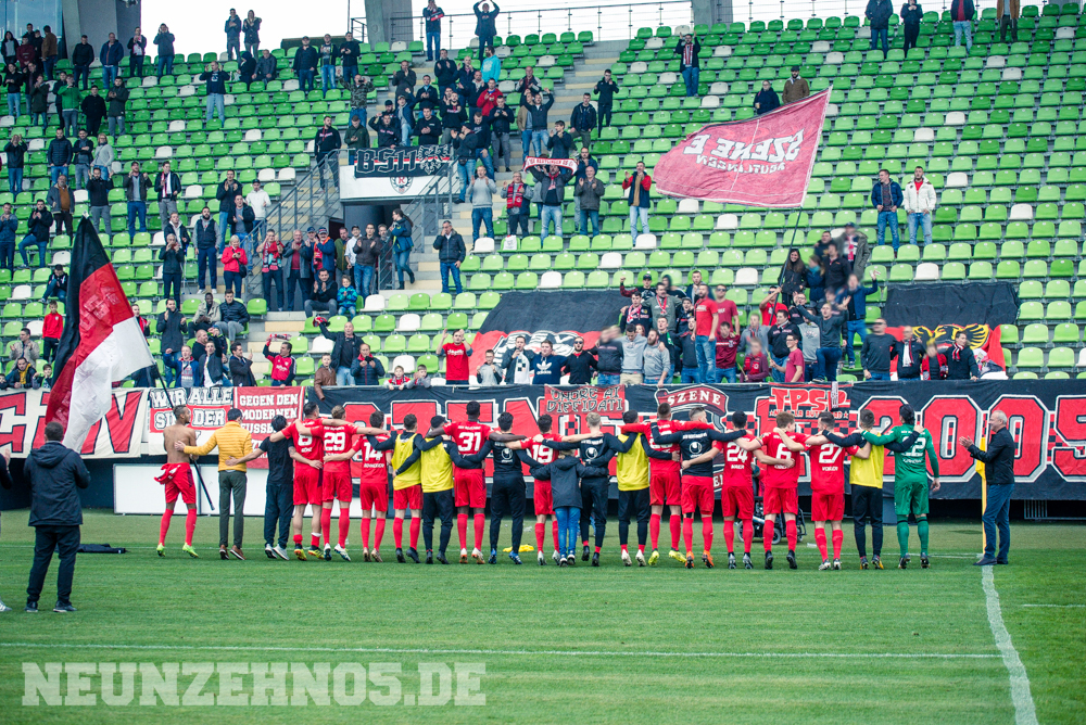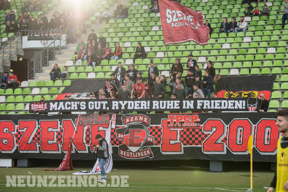 Es gibt so Tage da kapierst du Fußball einfach nicht. Egal wie du diesen Tag siehst, vorhersagst oder wie auch immer analysierst, du stehst im Stadion und kapierst es einfach nicht. Du stehst da und denkst dir einfach nur, geil! Egal was die vorherigen zwei Stunden war, jetzt ist plötzlich alles der Hammer! Es sind diese Momente die dir zeigen warum du diesen Sport, samt dem Verein so liebst, trotz all dem sinnlosen Geficke drumherum. Und dabei hätte der Tag doch so scheiße werden können. Unser Treffpunkt am Stadion hat seine Pünktlichkeit schon weit überschritten und bis auf die ganz, ganz üblichen Nasen siehst du halt niemand, wirklich niemand(!) um dich herum der heute am Start sein könnte um unseren Verein womöglich wieder an die fucking Tabellenspitze(!!) zu singen, was die Motivation unseres Auftrittes im Block gepaart mit dem frühen Rückstand unserer Mannschaft, naja, gelinde gesagt etwas hemmte. Wenn wir ehrlich sind war, dass bis zu diesen magischen 18 Minuten, bis auf wenige positive Lebenszeichen, der wohl schlechteste Heimauftritt seit über einem Jahr gegen Balingen. Aber reden wir nicht weiter drüber. Denn dann kam, dass was wir Fußball nennen auf den Platz zurück. Die ersten 74.Spielminuten lass wir auch hier einfach mal ganz bewusst aus, bis Gökhan Gümüsü mit einem überraschenden Anschlusstreffer das Spiel doch noch einmal spannend machte. Nur sieben Minuten später glich Schneider dann per Rechtsschuss doch tatsächlich aus, die heutige, verschlafene Kreuzeiche dann endgültig komplett am Toben bis sie dann beim unfassbaren 4:3 Entscheidungstreffer in der zweiten Minute der Nachspielzeit in eine völlige Ekstase verfiel. Ohne Witz das wohl trübste Spiel der Saison verkommt in wenigen Augenblicken zu einem Hort von ungläubigen Glücksgefühlen. Wahnsinn! Das restliche Trauerspiel so schnell vergessen, wurde dieser Sieg mit der Mannschaft noch ausgiebig am Block E gefeiert. Zum Schluss aber noch ein trauriges, aber notwendiges Thema. Kurz nach Anpfiff der zweiten Halbzeit mussten wir per Spruchband von einem verstorbenen Bruder der Cannstatter Kurve Abschied nehmen. Mach´s gut Ryder, deine Brüder der SKS werden dein hinterlassenes Andenken immer in Ehren halten.
