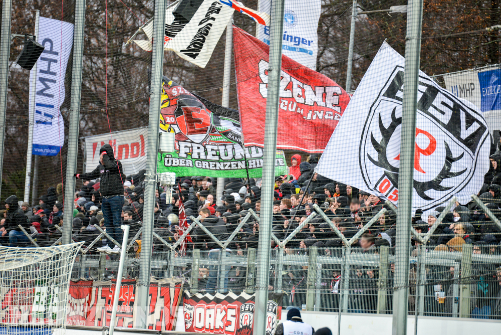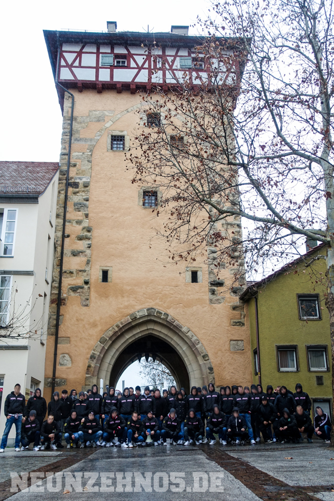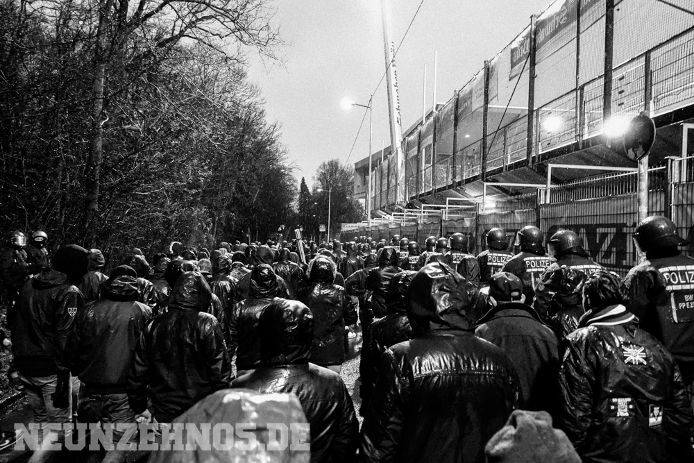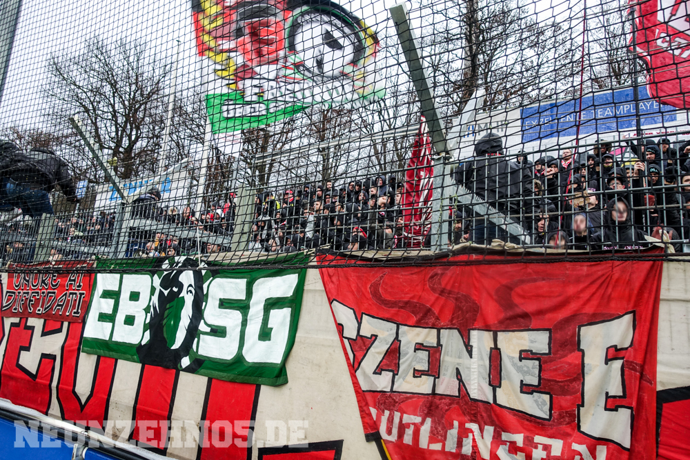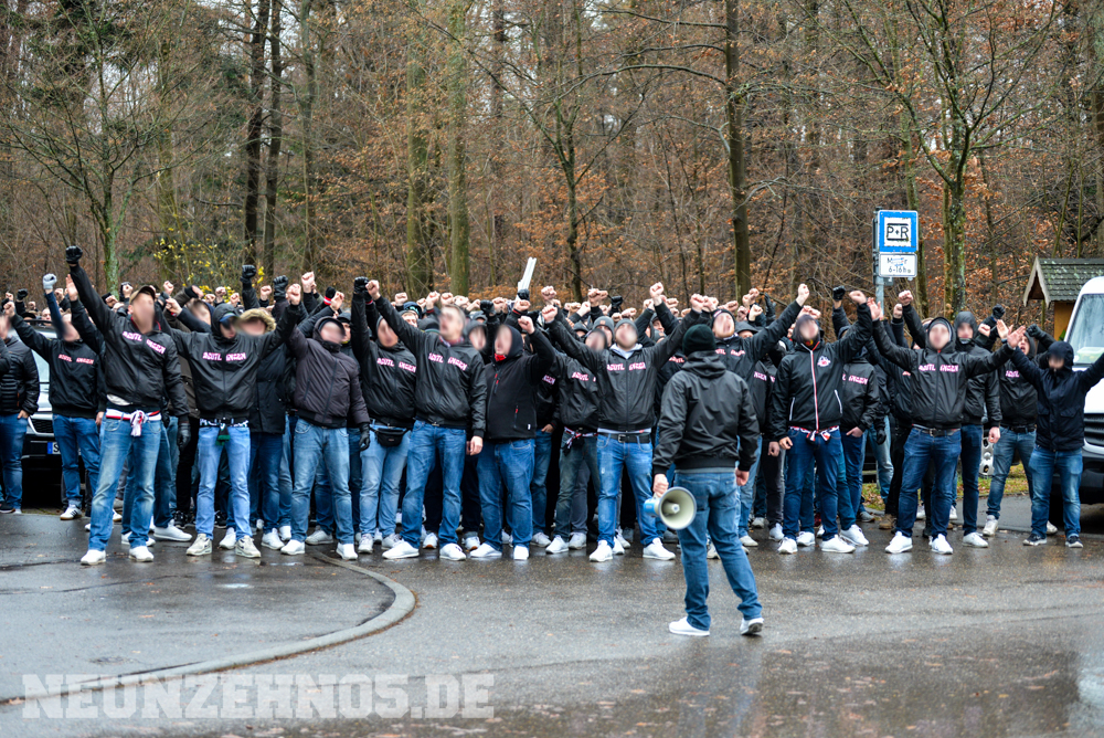 Frühzeitig ging es am Derbytag zum Reutlinger Hauptbahnhof, wo sich ein ganz ansehnlicher Zugfahrerhaufen zusammenfand. Mit dem Zug und U-Bahn ging es dann hoch auf die Waldau, wo oben angekommen mit rotem Rauch und ein paar Fackeln untermalt, sowie ersten Gesängen die Meter von der Ruhbank bis zum Stadion marschiert wurde. Die Bullen hielten sich unterdessen extrem im Hintergrund, was man Anno 2018 auch nicht unbedingt so erwarten würde und so war man dann auch tatsächlich überrascht, als hinter der Haupttribüne nur durch einen Zaun getrennt rund 40 vermummte Kickers-Leute waren. Am Zaun wurden dann diverse kleine Nettigkeiten rüber geworfen, zu einem direkten Kontakt kam es dann allerdings nicht. Als die Bullen dann mit Pfeffer einschritten, ging es ein paar Meter weiter Richtung Gästeeingang, wo überraschenderweise ein nicht abgeschlossenes Tor zum Stadiongelände war. Also kurz aufgemacht, aber keinen Durchgang zu den Kickers gesehen und dann doch von Bullenpferden zum Gästeeingang getrieben worden. Während der Hauptmob dort auf den Einlass wartete, erwischte die sportliche Reutlinger Fraktion dann tatsächlich die Kickers und so gab es ohne Bullen einen Schlagabtausch. Der Gästeblock war richtig gut gefüllt, dürften an die 800 Reutlinger inklusive hoher zweistelliger Zahl Gäste aus SG gewesen sein, großen Dank dafür an dieser Stelle! In der ersten Halbzeit war das Gefühl sehr geil mit so einem großen Haufen bei einem sportlich wichtigen Spiel am Start zu sein und endlich mal wieder einen Gegner gegenüber zu haben. Was ein bisschen schade war: Die bekannte Parasiten-Fahne wurde an PVC-Rohre gebunden und mit einer Seilkonstruktion am Fangnetz hochgezogen, kam aber nicht wie gewünscht zur Geltung, weil das unglaubliche Pisswetter samt Wind die Fahne die meiste Zeit in der Horizontalen hielt. Supportmäßig war der Gästeblock ganz gut aufgelegt, wobei uns auch hier der Wind wohl etwas an Lautstärke auf dem Feld genommen hat. Die Kickers blieben unterdessen ihrem niedrigen Niveau treu und zeigten über das Spiel zwei Spruchbänder gegen uns, bei denen wir noch lange nach dem Spiel am Überlegen waren, was genau sie uns damit sagen wollten. Auf dem Platz ging dann in der 30. Minute der bekackte SVK in Führung. Diese Führung konnten sie dann noch das restliche Spiel verwalten, auch weil unsere Jungs heute leider einige sehr sehr gute Chancen liegen ließen. Insbesondere in der zweiten Halbzeit hätte wirklich mal mindestens ein Tor für uns fallen müssen. Einen Punkt für uns zu vergeben gibt es noch in der Kategorie Material präsentieren: Hier zeigten die Kickers einen frei verkäuflichen 1905-Schal, wir eine Fanclubfahne aus Tübingen. Die Scharmützel vor Spielbeginn hatten die Bullen in der Zwischenzeit aufgeweckt, und so ging es in deren Begleitung wieder zurück zum Bahnhof und dann nach Reutlingen.