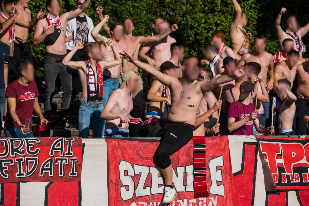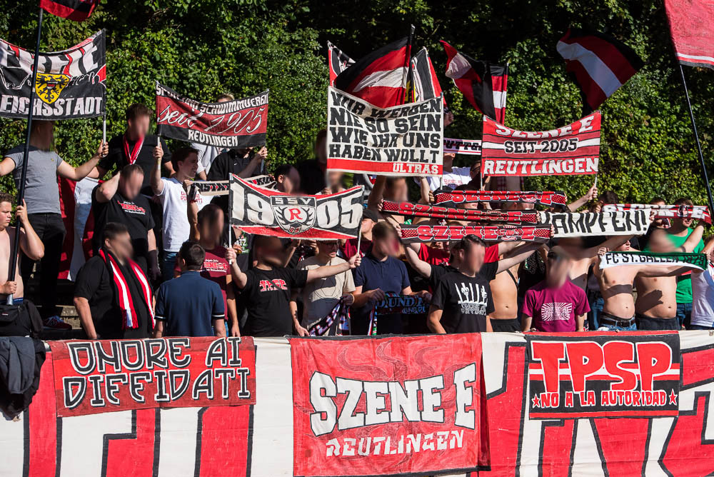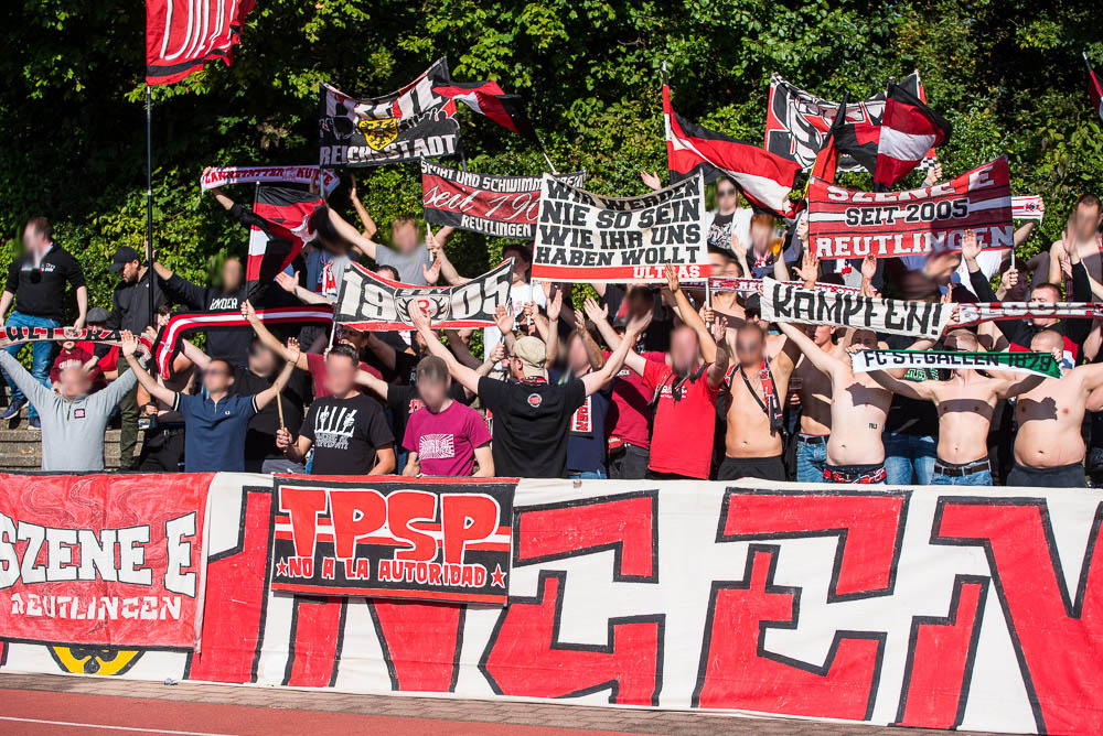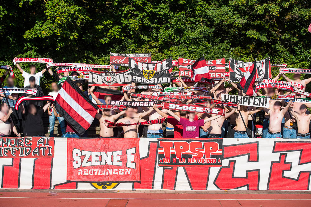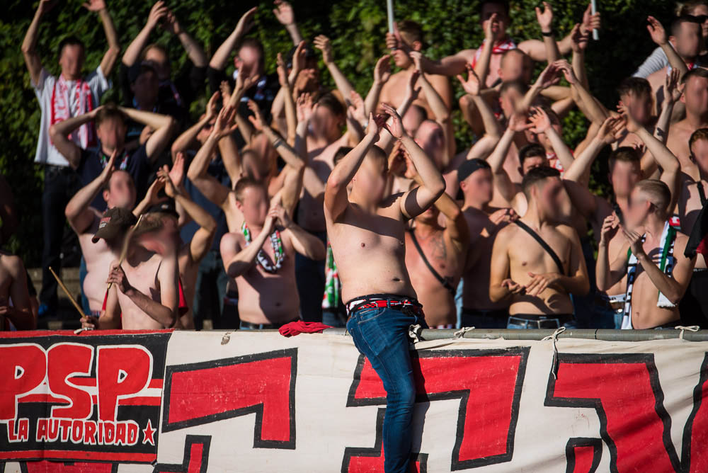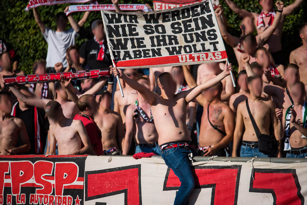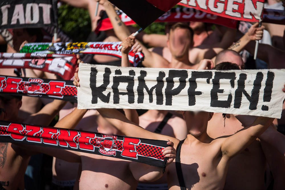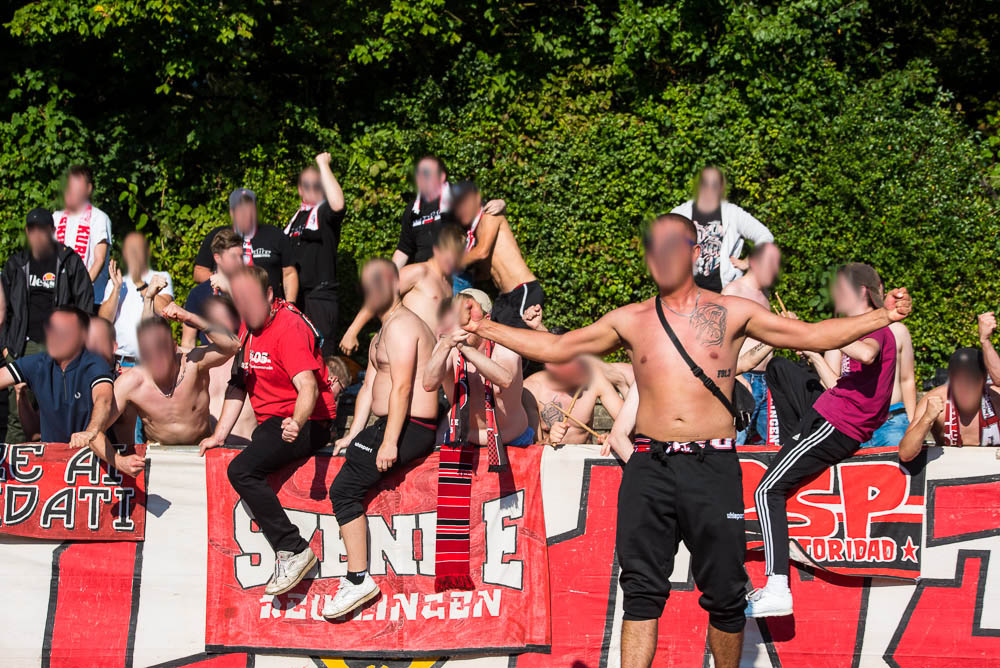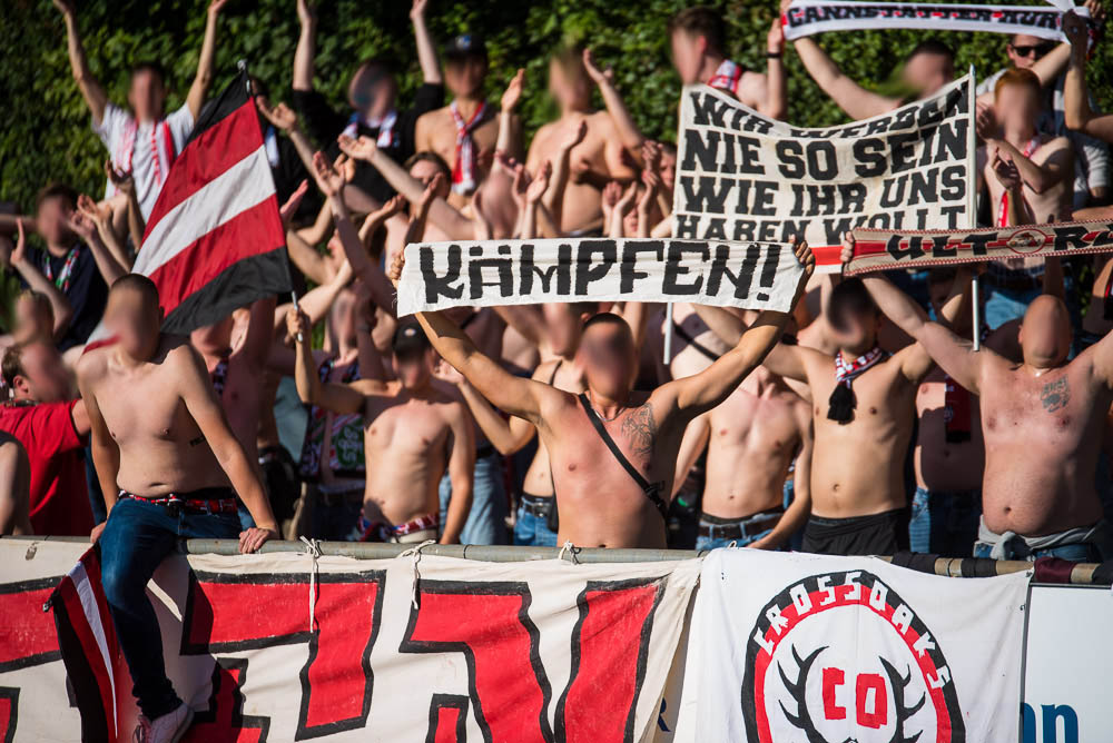 Das Sportzentrum Pichterich ist trotz der nervigen Laufbahn eigentlich ein ganz akzeptabler Oberliga Ground, zumindest hat es dort ein paar Stufen, auf denen man sich hinter den Fahnen verteilen konnte und auch die Sicht auf das Spielfeld ging völlig in Ordnung. Während Gästehaufen noch ein paar kleinere Schwierigkeiten zu Beginn hatte, gelang es der Mannschaft gut in das Spiel zu starten und bereits in der 10. Spielminute konnte der Führungstreffer bejubelt werden. Jetzt kamen auch der Gästeanhang in Fahrt und schmetterte den ein oder anderen Gesang mit einer ordentlichen Lautstärke in das weite Rund. Mit einem ähnlichen Enthusiasmus setzte der Gästeblock dann die Anfeuerungen auch in der zweiten Hälfte fort, das zweite Tor unserer Mannschaft in der 67. Minute spielte hierbei natürlich auch noch in die Karten. Generell kann man von einem guten Auftritt sprechen. Passend zu den Ereignissen der letzten Wochen kassierten wir in der Nachspielzeit erst noch den Anschlusstreffer per Strafstoß und natürlich dann auch noch in den Schlusssekunden, das 2:2. Die Fassungslosigkeit nach Abpfiff war jedem ins Gesicht geschrieben und mehr oder weniger niedergeschlagen, machte man sich wieder auf die Heimfahrt. Niemals aufgeben!
