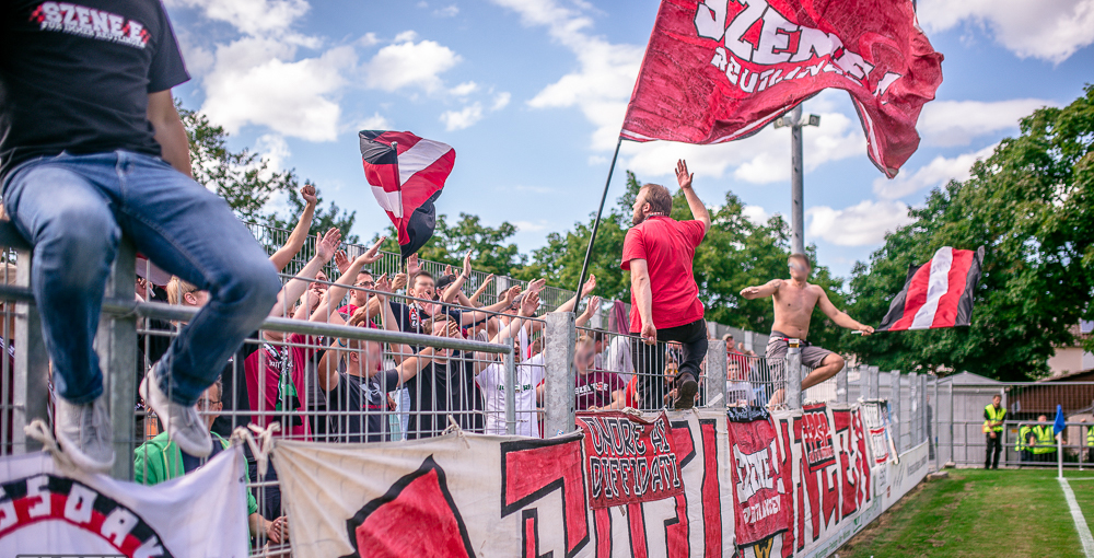 Block E reiste zu diesem Spiel mit dem Zug an. Im Gästeblock versammelten sich letztlich rund 70-80 SSV-Fans von denen gut die Hälfte unsere Mannschaft auch akustisch unterstützten. Insgesamt war es ein guter Auftritt unsererseits. Erwähnenswert sind noch zwei Spruchbänder in Richtung DFB und Bild-Zeitung, die jeweils zu Beginn der beiden Halbzeiten gezeigt wurden.